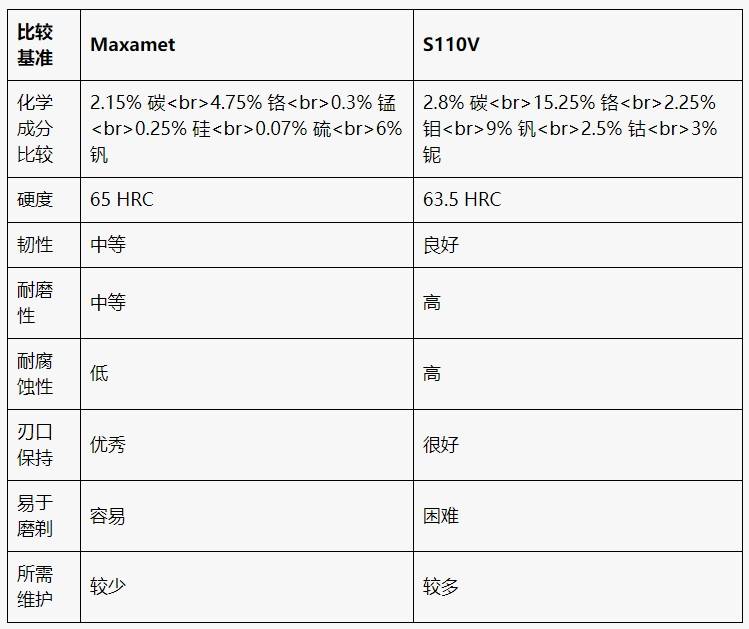无论你选择Maxamet还是S110V钢材,下面讨论的每一个细节都将帮助你理解这些钢材。简而言之,