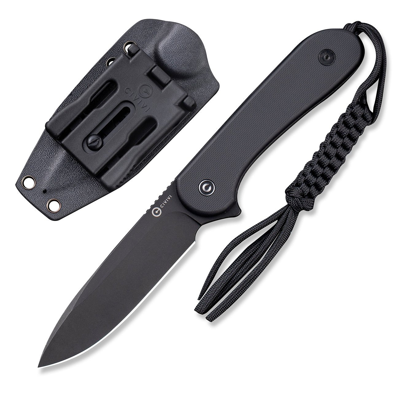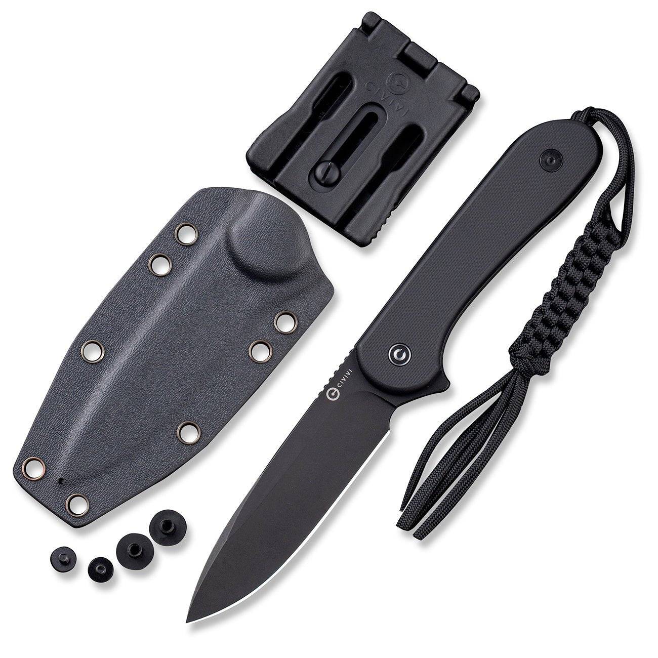 夹子:T 形夹(设计师:Bob Terzuola) 护套:黑色 Kydex 护套 挂绳:黑色绑带伞绳挂绳