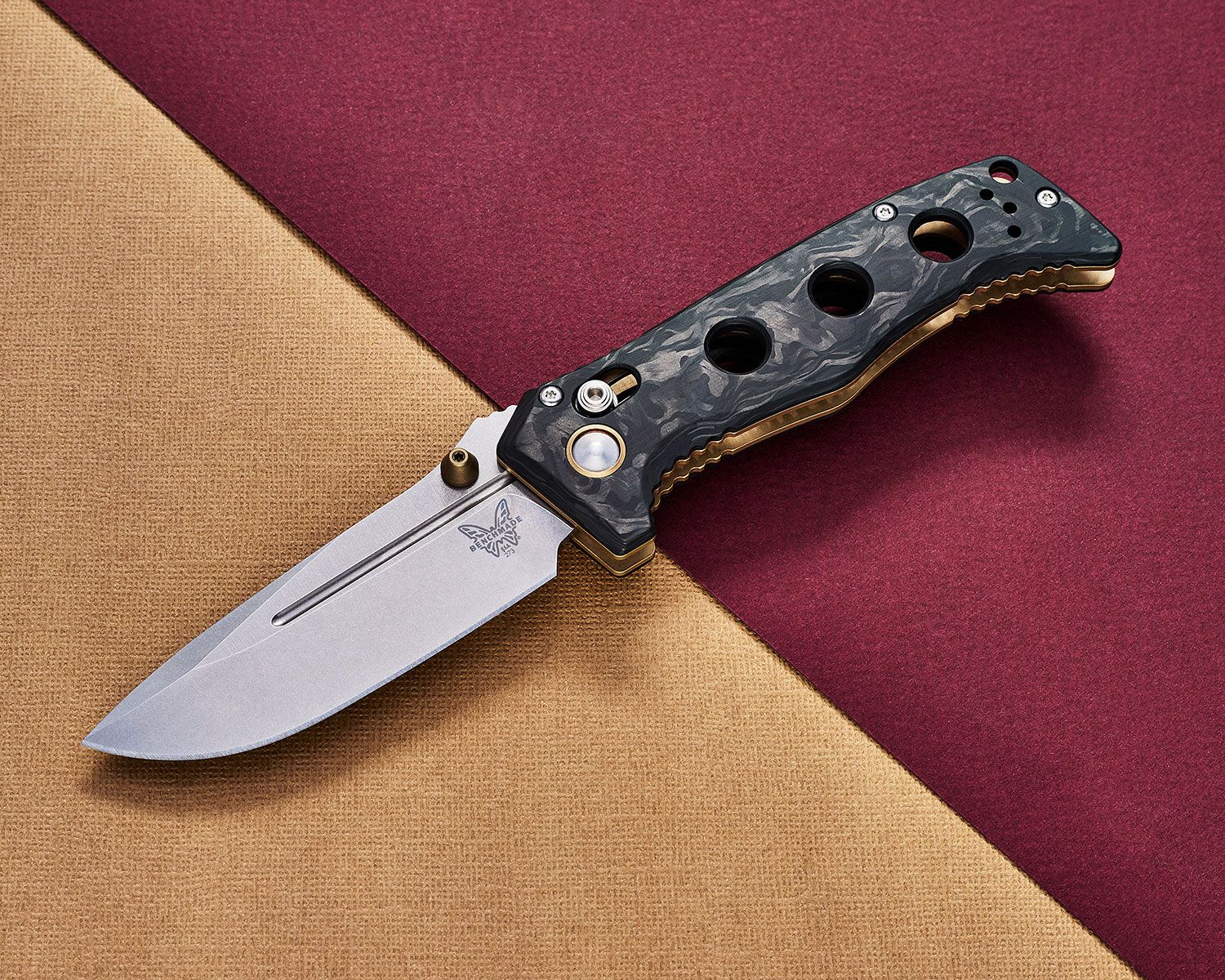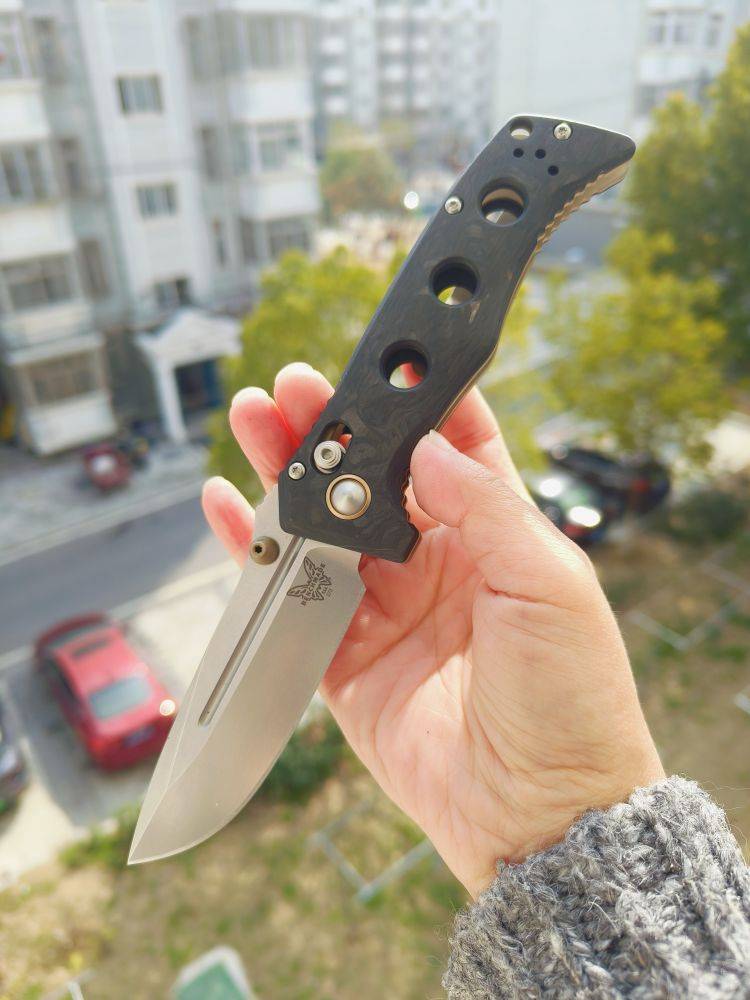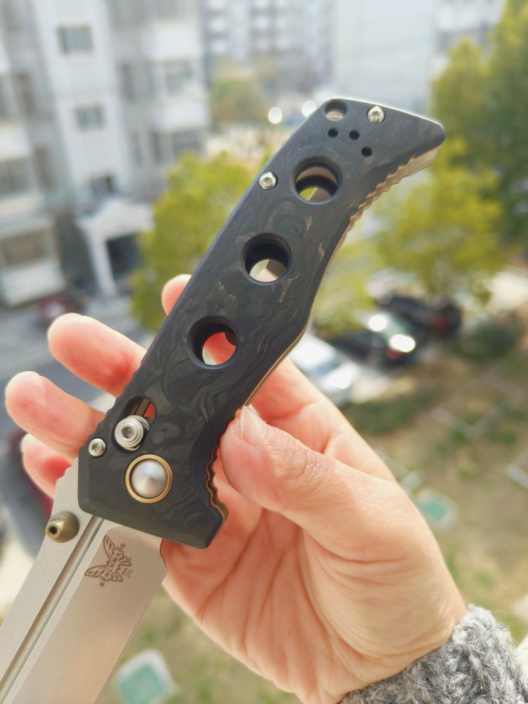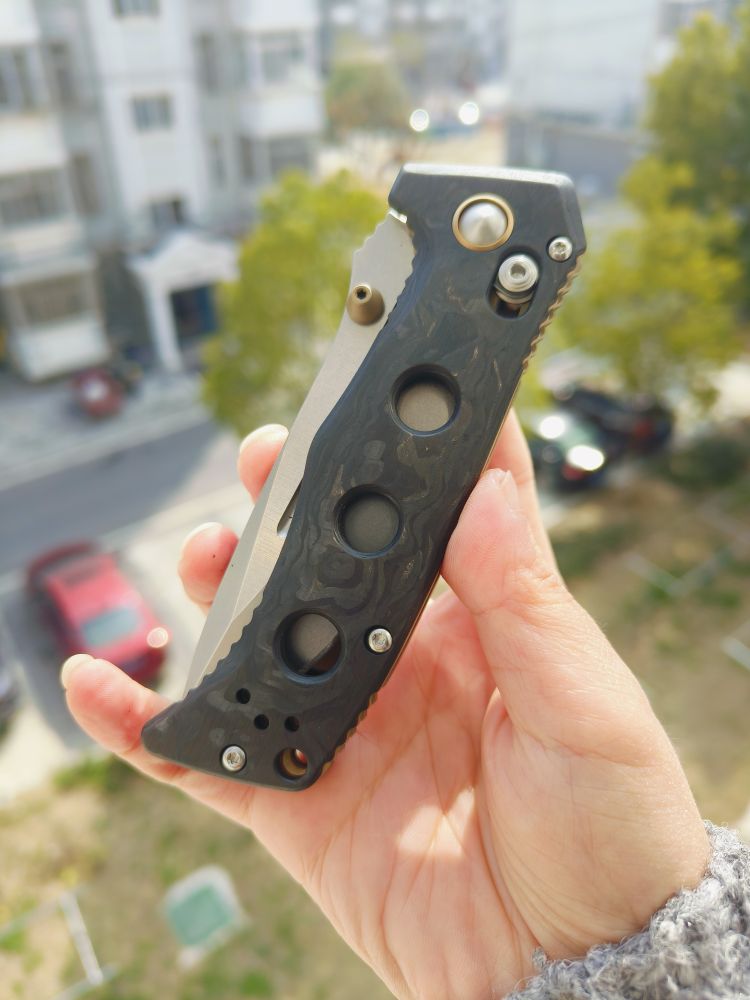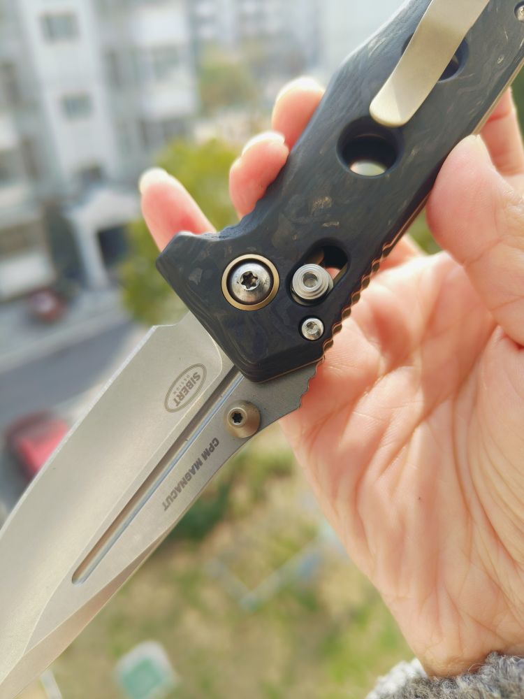 Benchmade 273-03 是一把精致而耐用的折刀。它采用了优质的材料和精湛的工艺,为用户提供出色的切割性能和可靠的使用体验。这把折刀由著名设计师Shane Sibert设计,以其坚固耐用的特性而闻名。刀片采用了3.25英寸的CPM MagnaCut不锈钢材质,具有出色的切割能力和长久的刀刃保持性。手柄采用大理石纹碳纤维材质,既轻巧又坚固,提供舒适的握持感和视觉吸引力。