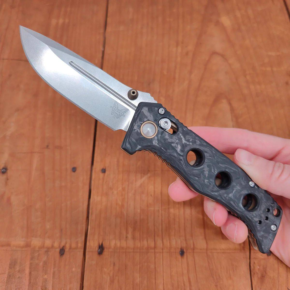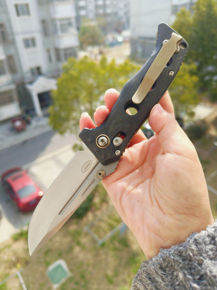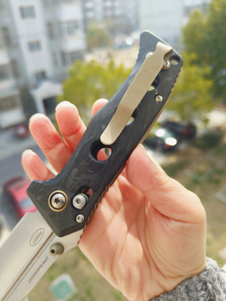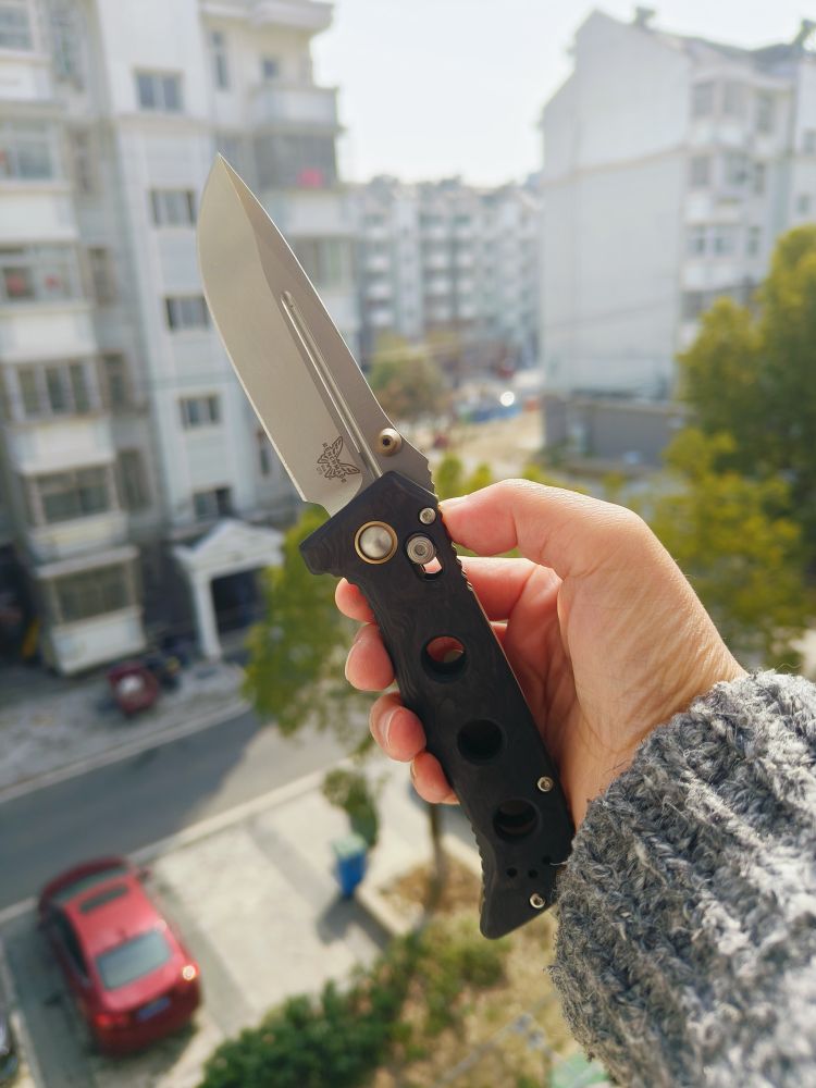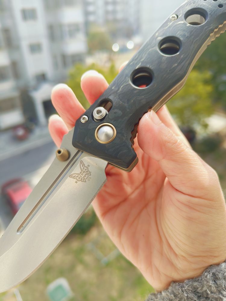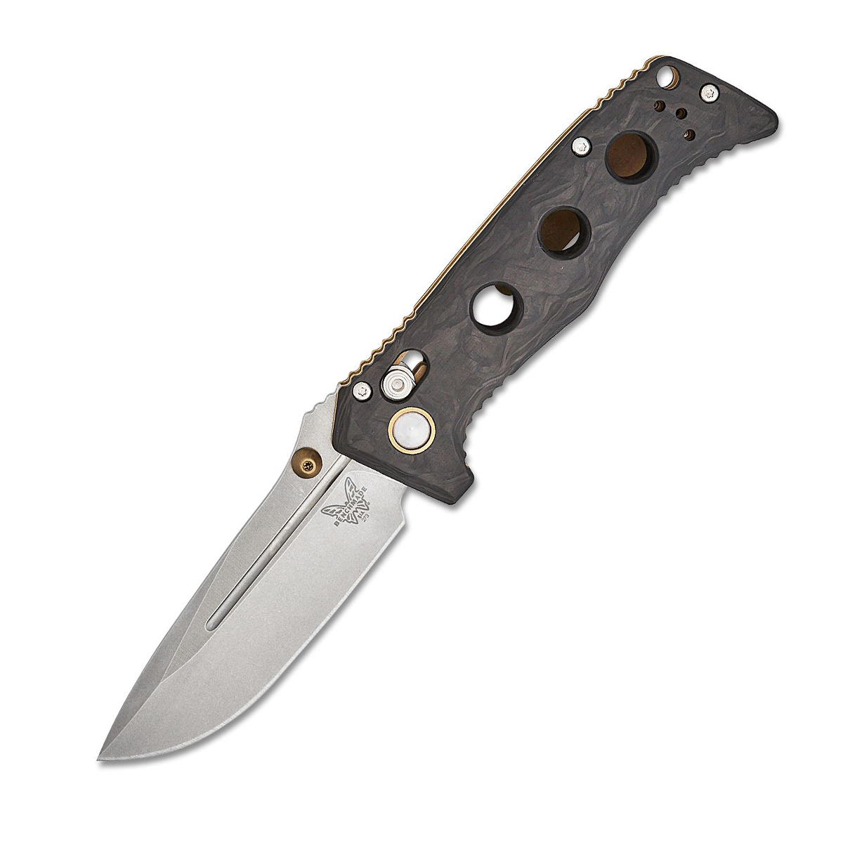 Benchmade 273-03 是一把精致而耐用的折刀。它采用了优质的材料和精湛的工艺,为用户提供出色的切割性能和可靠的使用体验。这把折刀由著名设计师Shane Sibert设计,以其坚固耐用的特性而闻名。刀片采用了3.25英寸的CPM MagnaCut不锈钢材质,具有出色的切割能力和长久的刀刃保持性。手柄采用大理石纹碳纤维材质,既轻巧又坚固,提供舒适的握持感和视觉吸引力。