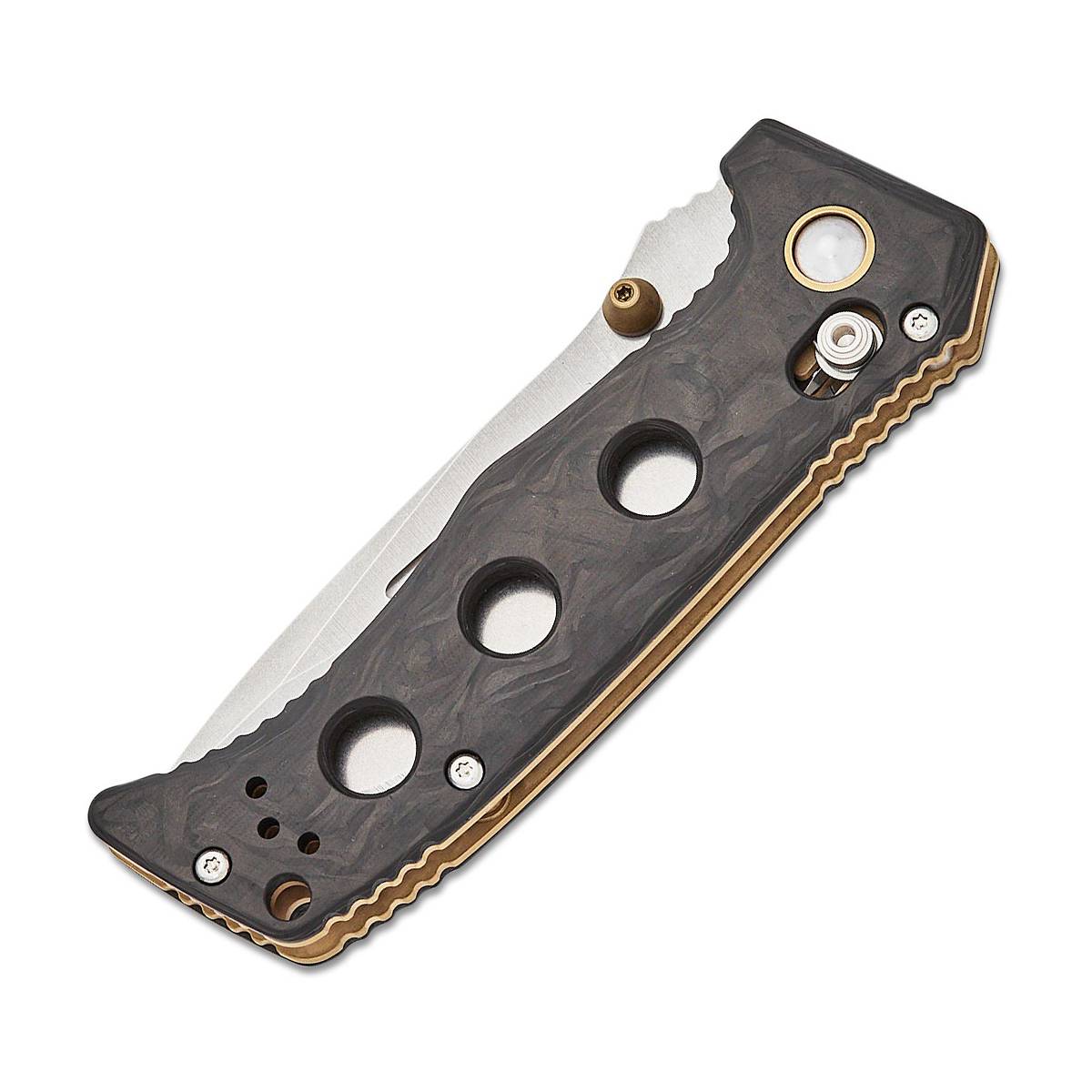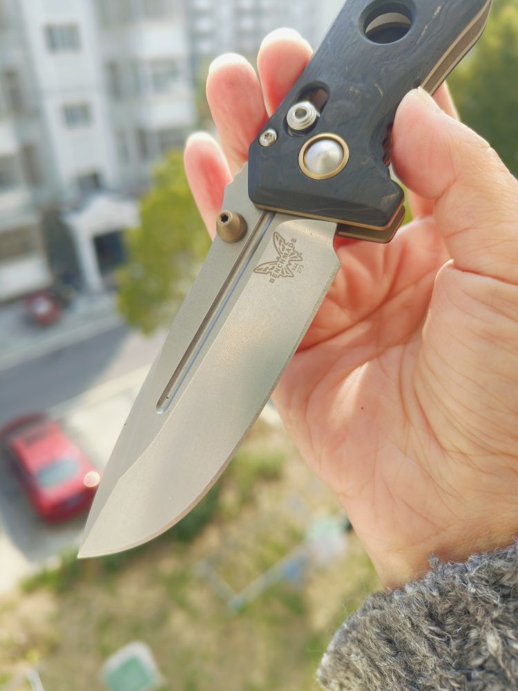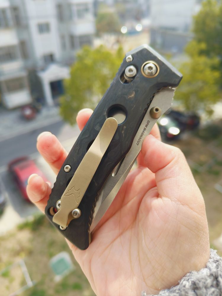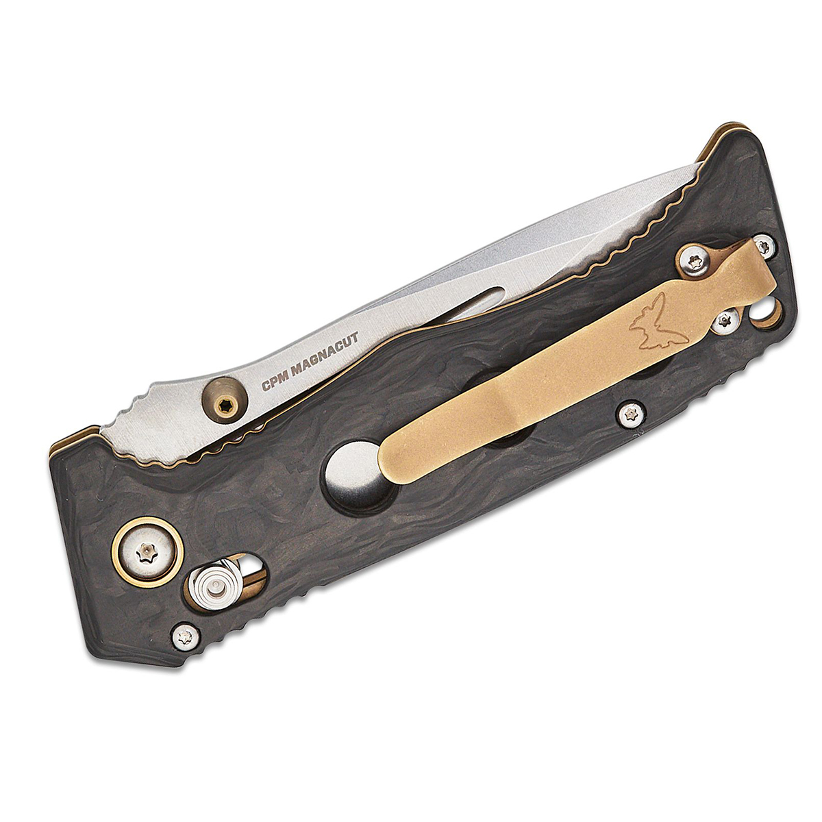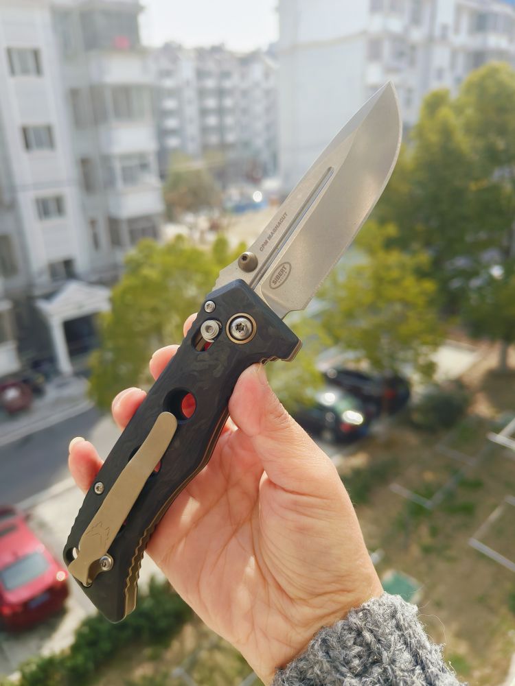 Benchmade 273-03 是一把精致而耐用的折刀。它采用了优质的材料和精湛的工艺,为用户提供出色的切割性能和可靠的使用体验。这把折刀由著名设计师Shane Sibert设计,以其坚固耐用的特性而闻名。刀片采用了3.25英寸的CPM MagnaCut不锈钢材质,具有出色的切割能力和长久的刀刃保持性。手柄采用大理石纹碳纤维材质,既轻巧又坚固,提供舒适的握持感和视觉吸引力。