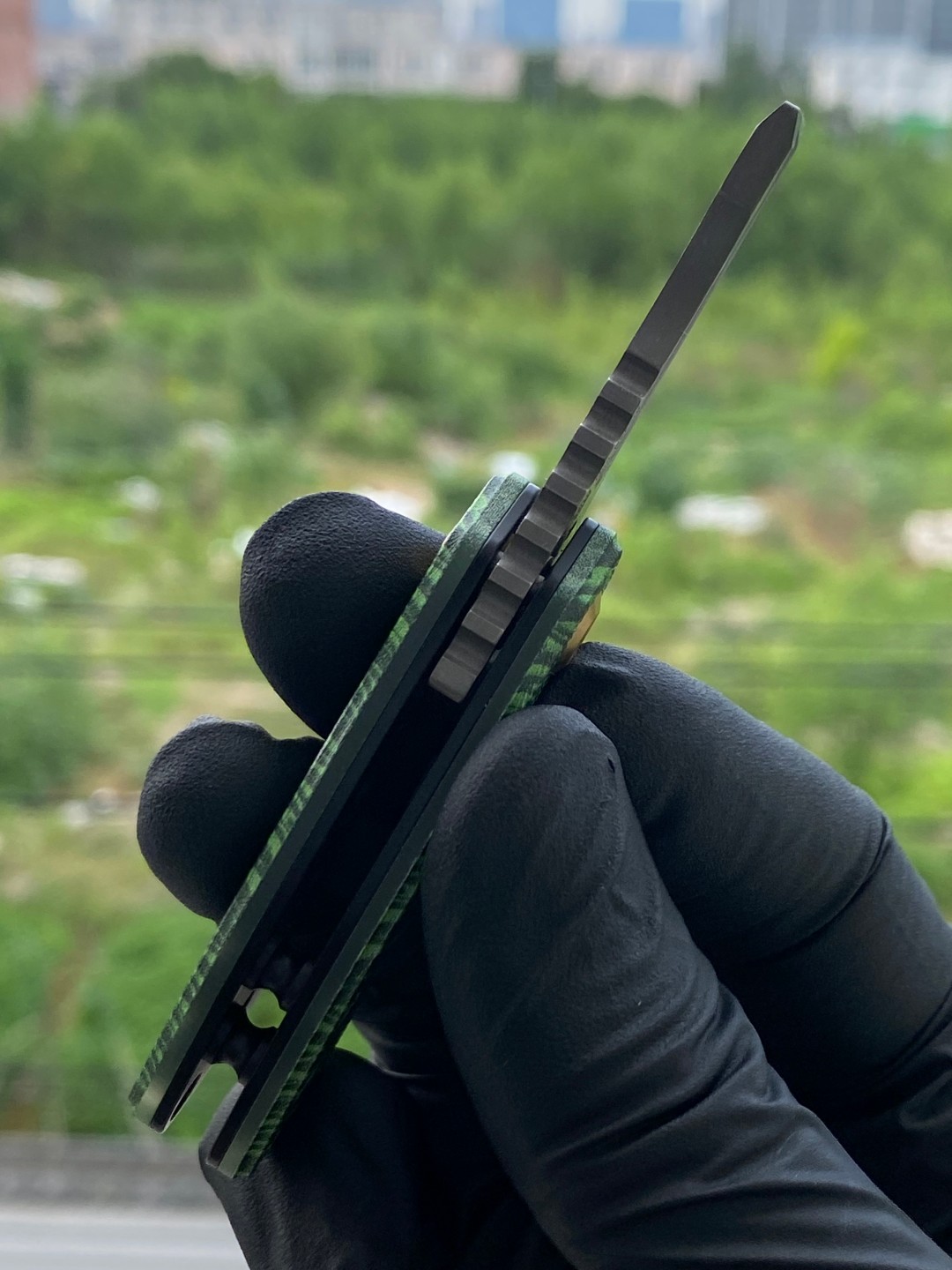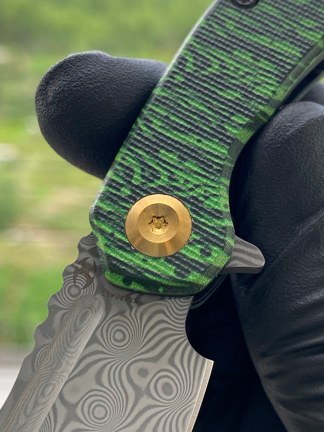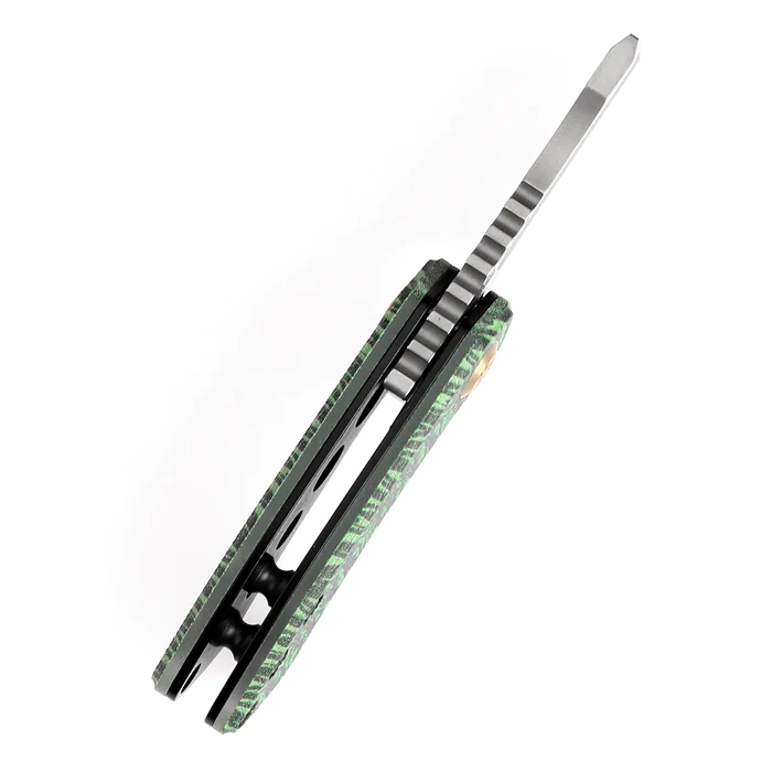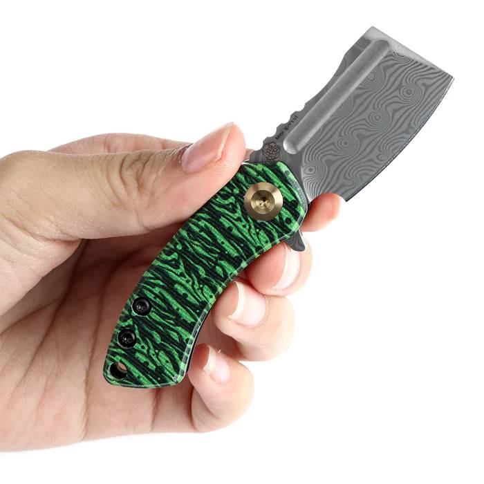 总体长度: 3.8英寸/96.5毫米 刀片长度: 1.45 英寸/36.9 毫米 刀片厚度: 0.118 英寸/3.0 毫米 刀片材质: 大马士革 刀片材质: 大马士革 手柄材质: Jade G10 西瓜皮印花 颜色: 黑色和绿色 锁型: 内衬锁 重量: 1.38盎司/39克 设计师 :科赫工具