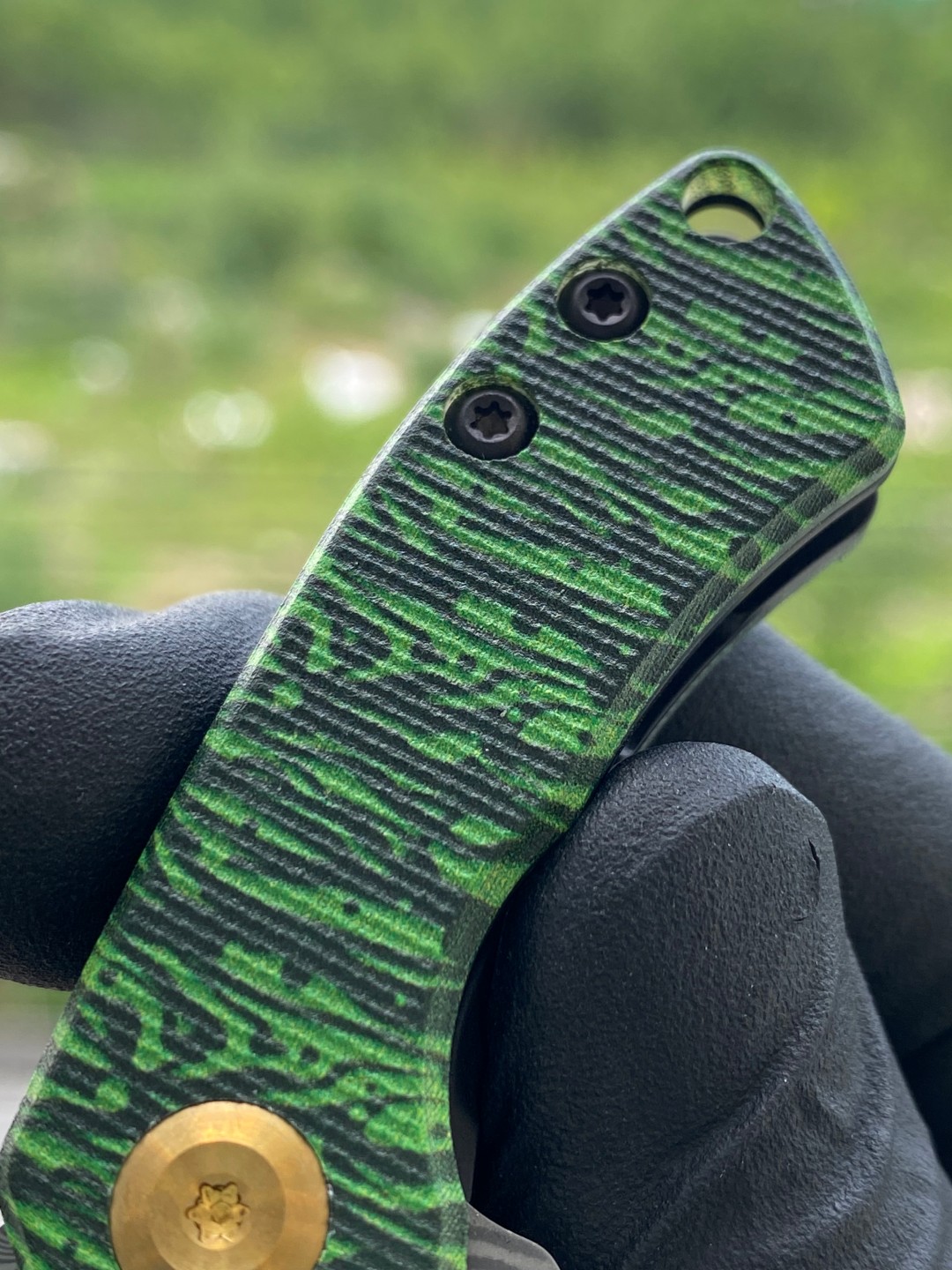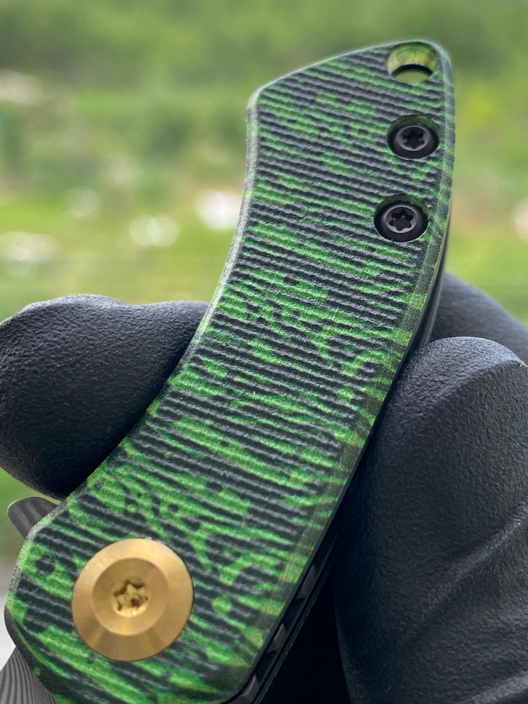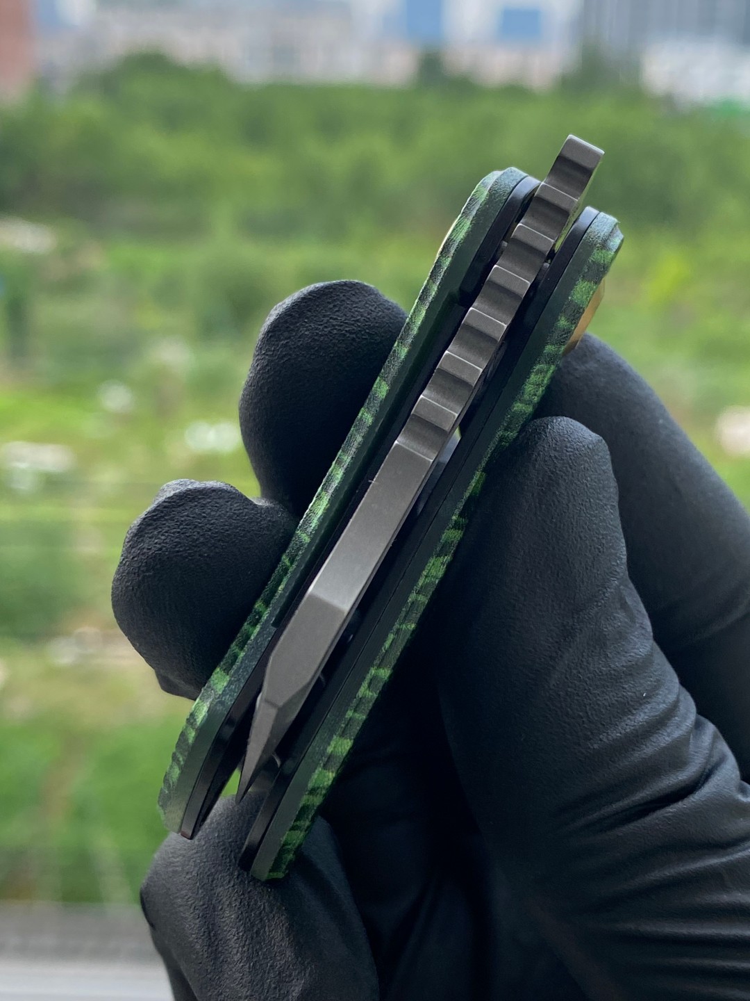 总体长度: 3.8英寸/96.5毫米 刀片长度: 1.45 英寸/36.9 毫米 刀片厚度: 0.118 英寸/3.0 毫米 刀片材质: 大马士革 刀片材质: 大马士革 手柄材质: Jade G10 西瓜皮印花 颜色: 黑色和绿色 锁型: 内衬锁 重量: 1.38盎司/39克 设计师 :科赫工具