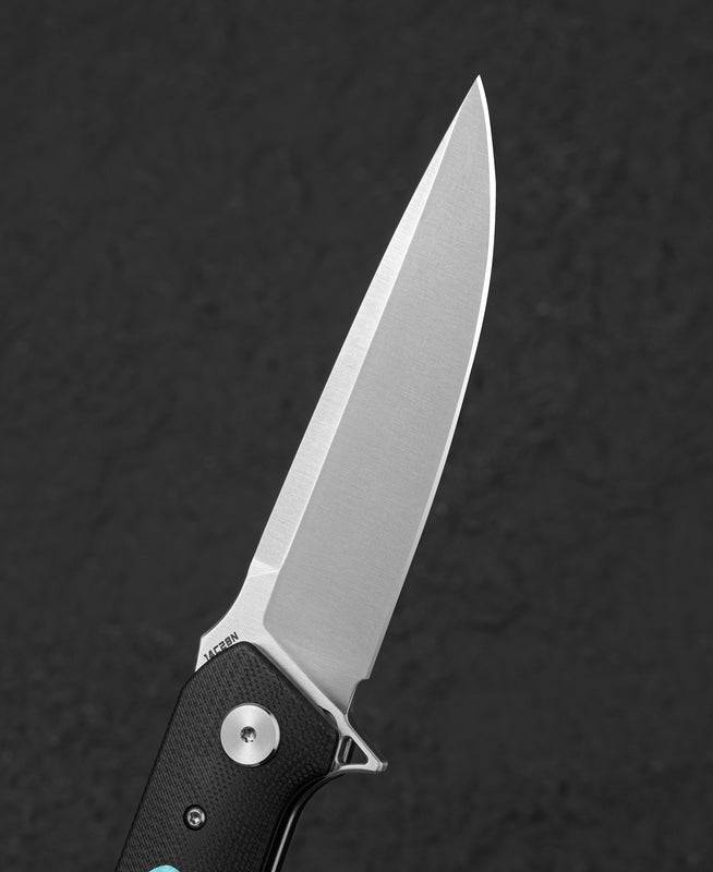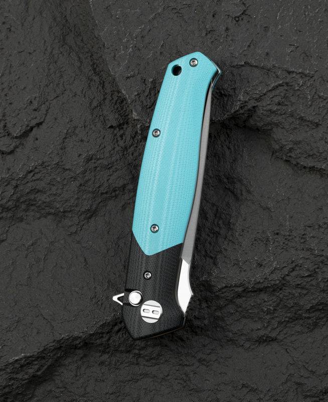 刀片材质:14C28N 刀片表面处理:缎面 手柄材质:G10 夹子材质:钢 描述:按钮锁 手柄颜色: 黑色+蒂芙尼蓝 滚珠轴承:陶瓷 总长度:9.05 英寸(230 毫米) 闭合长度:5.12 英寸(130 毫米) 刀片长度:3.94 英寸(100 毫米) 刀片厚度:0.138 英寸(3.5 毫米) 刀片硬度:58-60HRC 刀重:117g