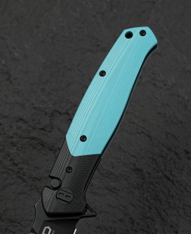 刀片材质:14C28N 刀片表面处理:缎面 手柄材质:G10 夹子材质:钢 描述:按钮锁 手柄颜色: 黑色+蒂芙尼蓝 滚珠轴承:陶瓷 总长度:9.05 英寸(230 毫米) 闭合长度:5.12 英寸(130 毫米) 刀片长度:3.94 英寸(100 毫米) 刀片厚度:0.138 英寸(3.5 毫米) 刀片硬度:58-60HRC 刀重:117g