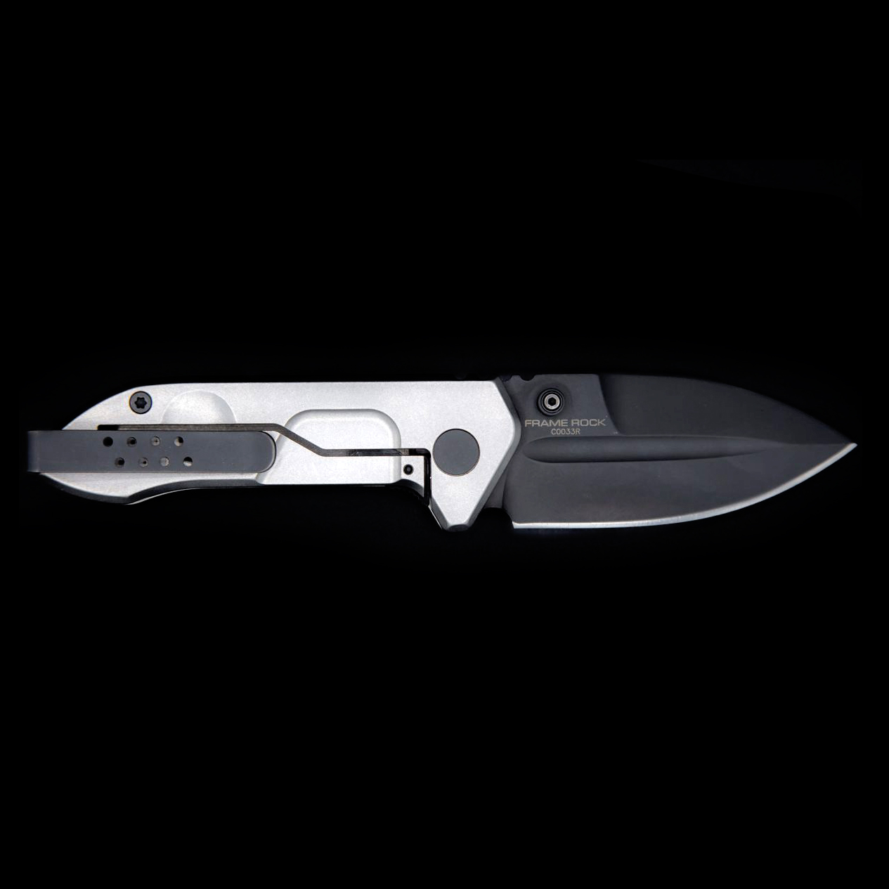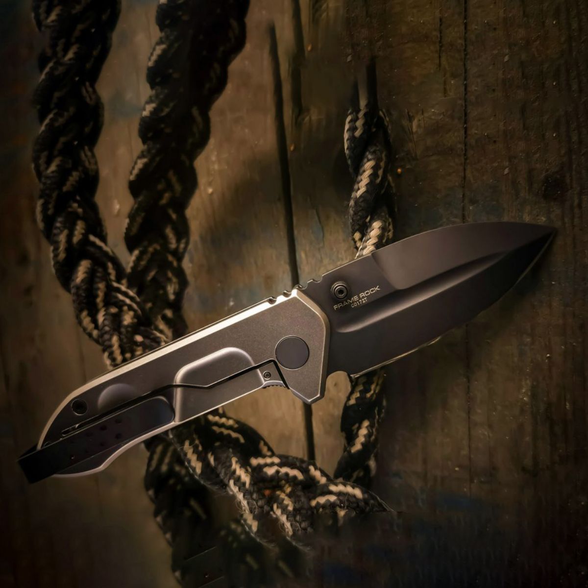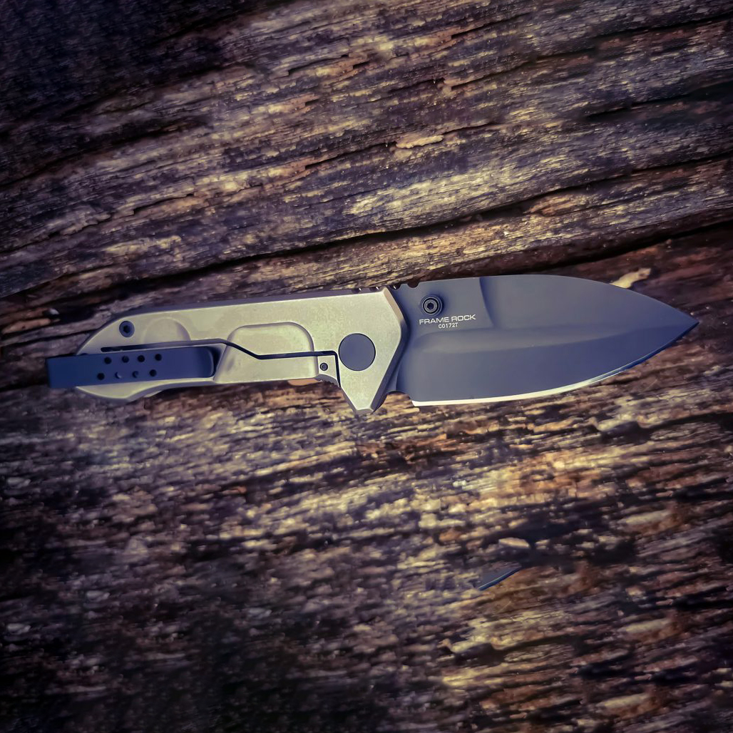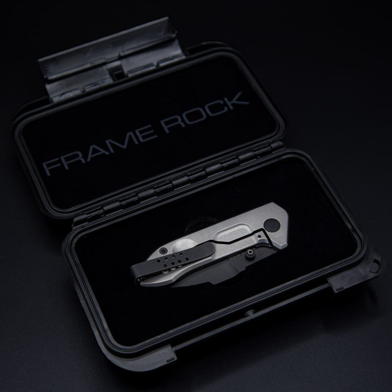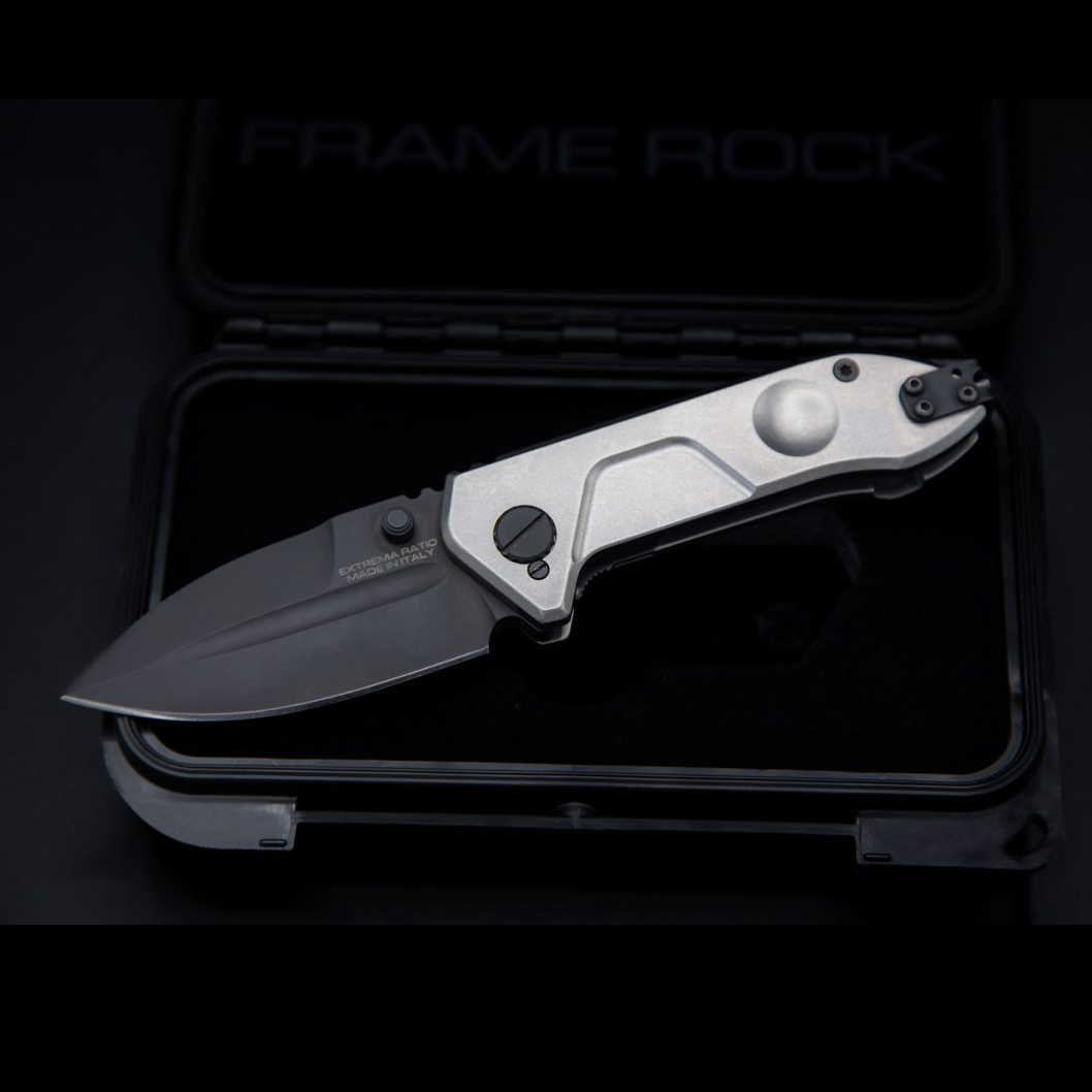 Extrema Ratio Frame Rock 是一款新刀,基于 Ti-Rock 的设计,Ti-Rock 是一款成功的框架锁定制刀,Extrema Ratio 为一家著名的意大利经销商实现了这一点。 Extrema Ratio Frame Rock 的特点是钛合金握把,具有出色的韧性,但非常轻。易于更换的热处理钢嵌件保证了框架锁的完整性和耐用性,防止磨损。与之前的水滴式刀头不同,Frame Rock 具有矛尖刀刃,长 75 毫米(3 英寸),厚 6.0 毫米(0.23 英寸),经过充分处理,更加轻盈。刀片采用 Bohler N690 钢制成,经过 58 HRC 热处理。它有黑色、DLC 处理或石洗饰面。为了使打开更加顺畅和轻松,刀片在滚珠轴承上旋转。该机构允许用户通过螺钉调节将刀片从关闭位置释放所需的力。双面夹子的形状允许在口袋中隐藏一个端口,使刀从外面看不见。握柄大且比例匀称,刀片厚实,使其能够应对繁重的任务。 Frame Rock 的重量仅为 9.6 盎司(270 克),对于这样一把坚固的刀来说相当轻。它配有一个特殊的 ABS 外壳。