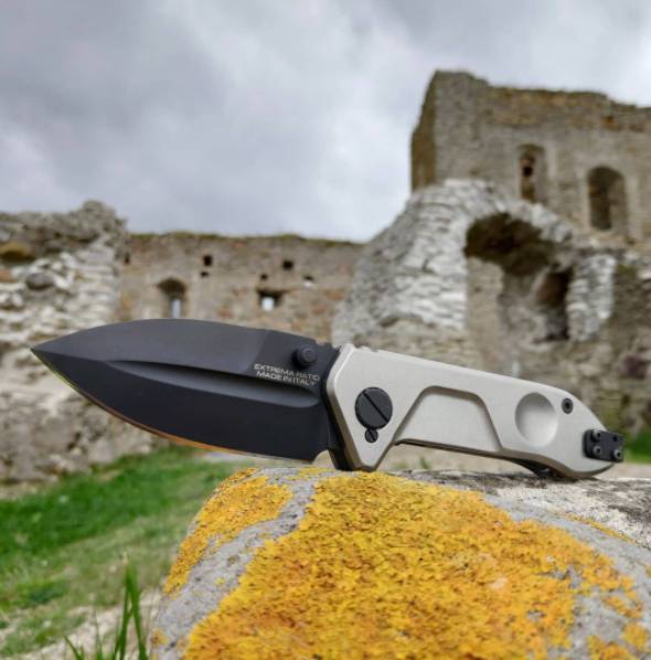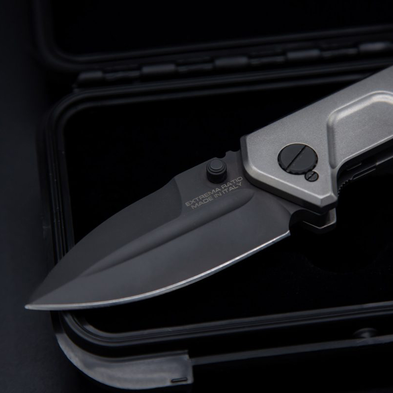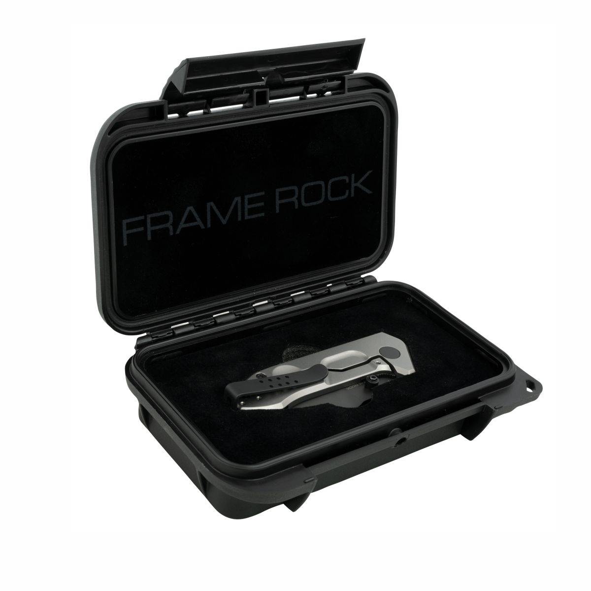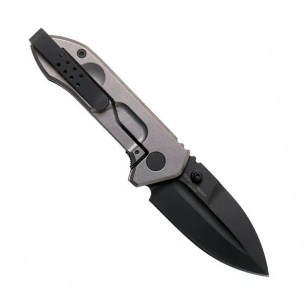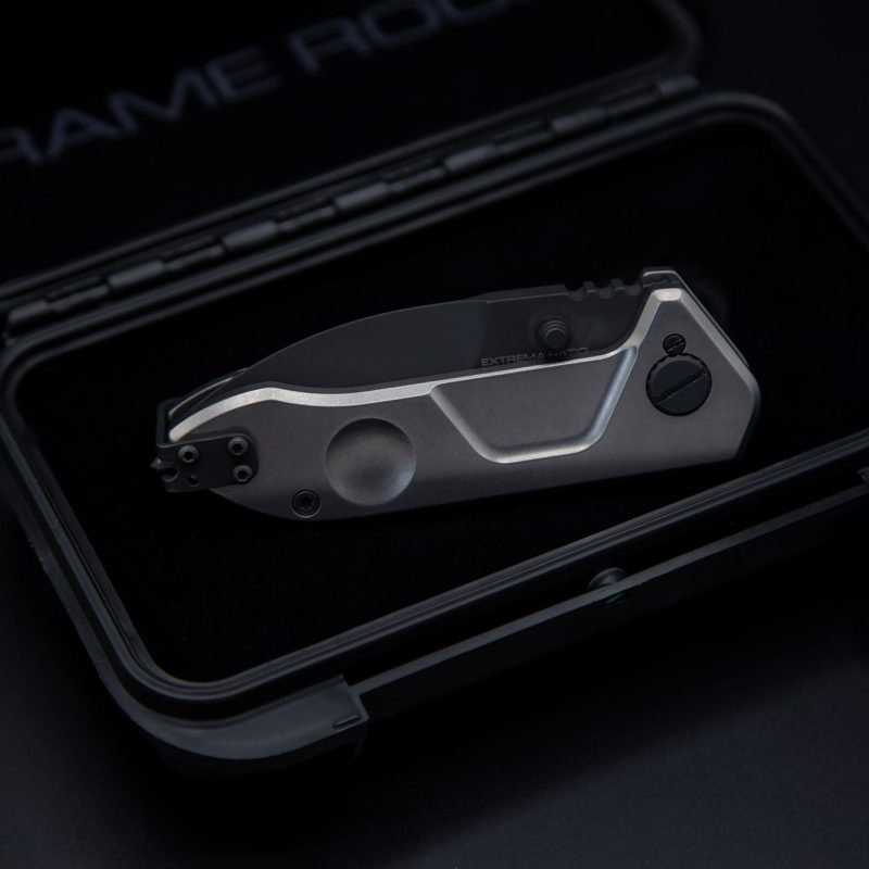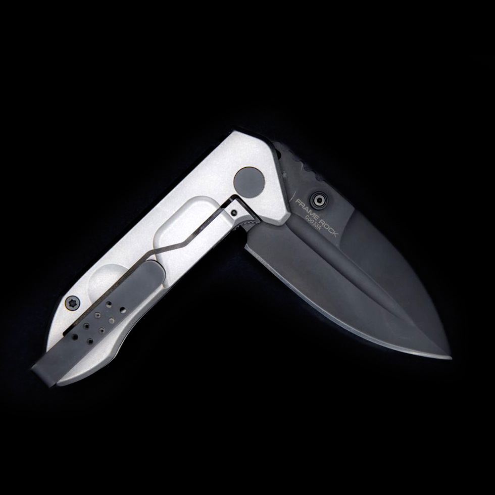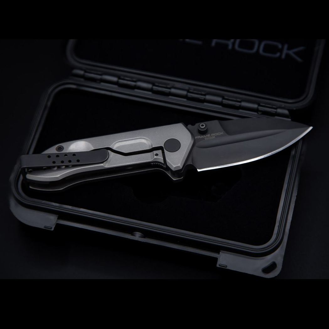 Extrema Ratio Frame Rock 是一款新刀,基于 Ti-Rock 的设计,Ti-Rock 是一款成功的框架锁定制刀,Extrema Ratio 为一家著名的意大利经销商实现了这一点。 Extrema Ratio Frame Rock 的特点是钛合金握把,具有出色的韧性,但非常轻。易于更换的热处理钢嵌件保证了框架锁的完整性和耐用性,防止磨损。与之前的水滴式刀头不同,Frame Rock 具有矛尖刀刃,长 75 毫米(3 英寸),厚 6.0 毫米(0.23 英寸),经过充分处理,更加轻盈。刀片采用 Bohler N690 钢制成,经过 58 HRC 热处理。它有黑色、DLC 处理或石洗饰面。为了使打开更加顺畅和轻松,刀片在滚珠轴承上旋转。该机构允许用户通过螺钉调节将刀片从关闭位置释放所需的力。双面夹子的形状允许在口袋中隐藏一个端口,使刀从外面看不见。握柄大且比例匀称,刀片厚实,使其能够应对繁重的任务。 Frame Rock 的重量仅为 9.6 盎司(270 克),对于这样一把坚固的刀来说相当轻。它配有一个特殊的 ABS 外壳。