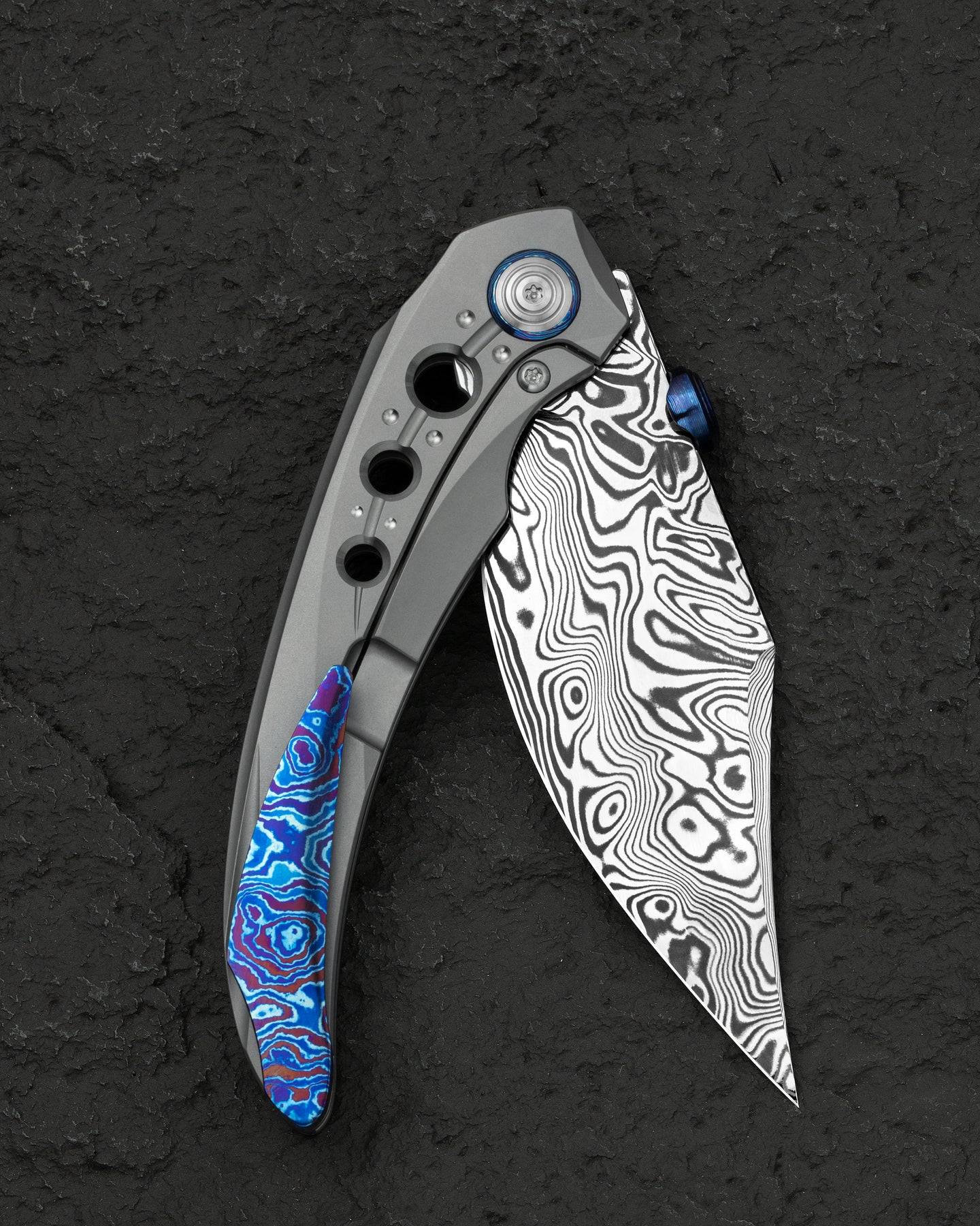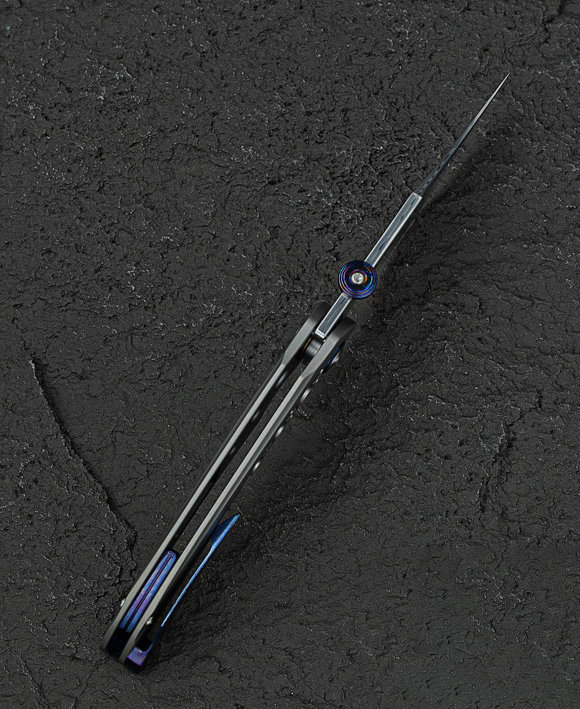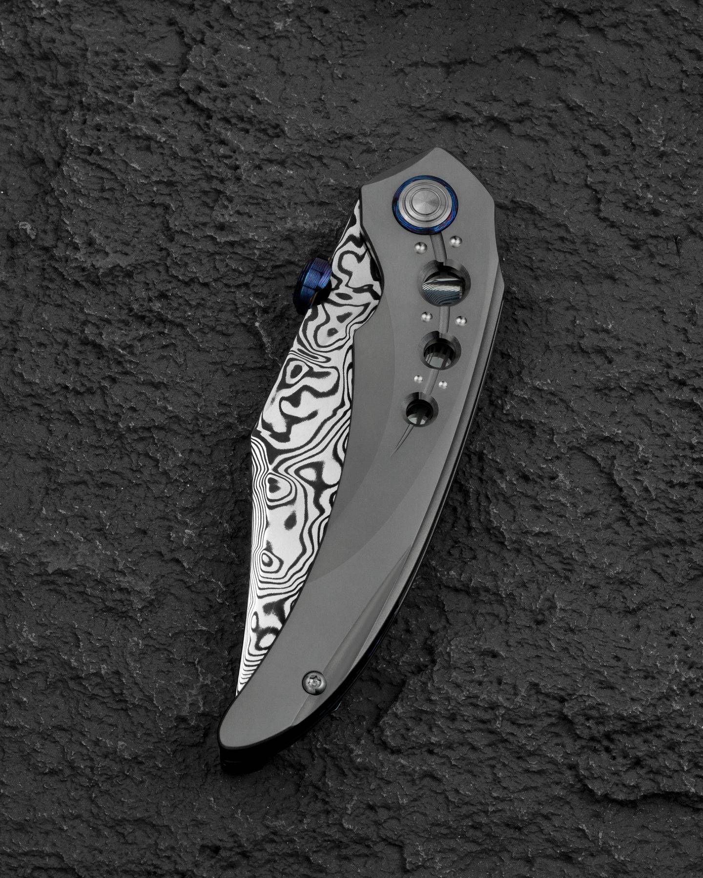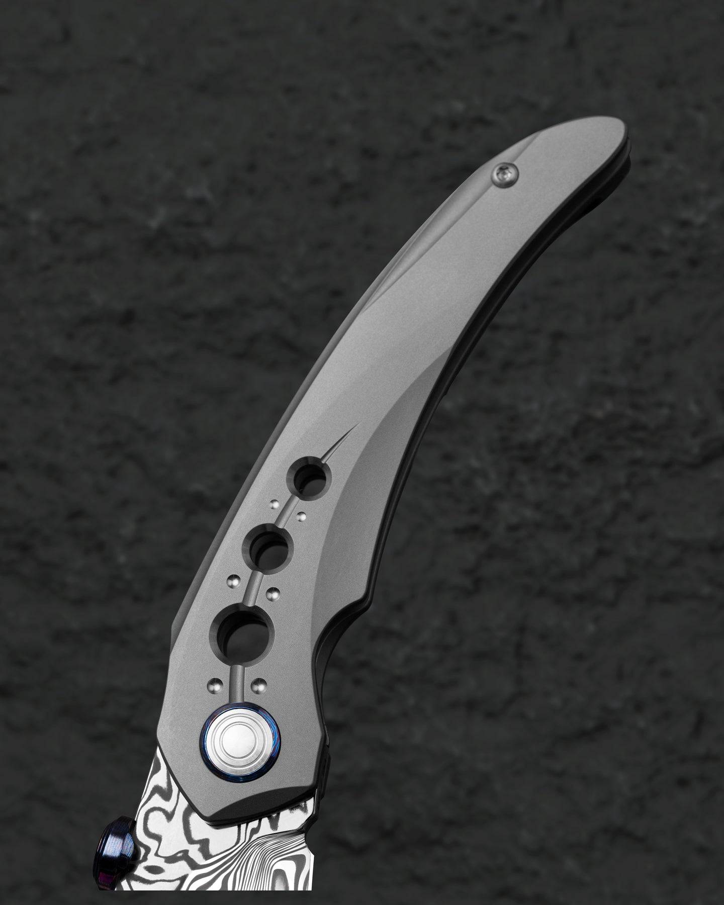 刀片表面处理:大马士革钢 手柄材质: 钛 描述:框架锁 手柄颜色:灰色 总长度:8.66 英寸(220 毫米) 闭合长度:4.79 英寸(121.7 毫米) 刀片长度:3.87 英寸(98.3 毫米) 刀片厚度:0.150 英寸(3.8 毫米) 刀片硬度:60-62HRC 夹子材质:钛马士革 后垫片:钛 滚珠轴承:陶瓷 刀重:116g