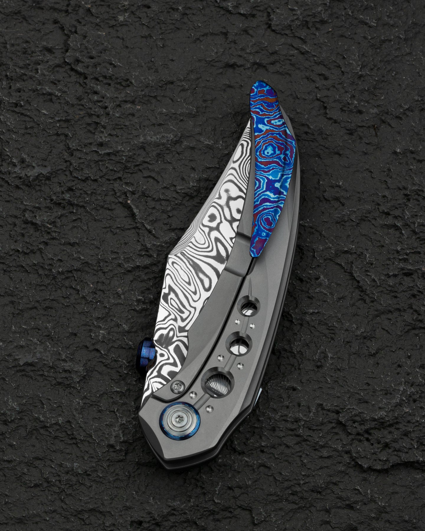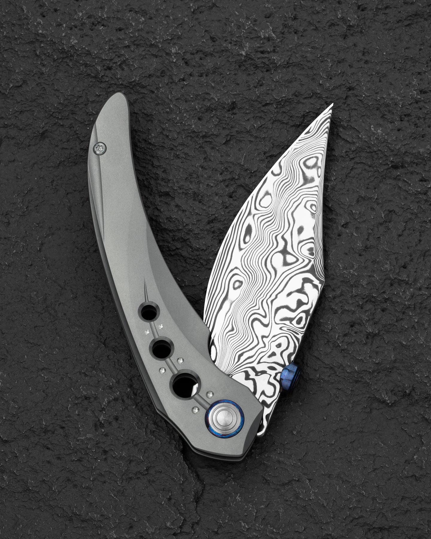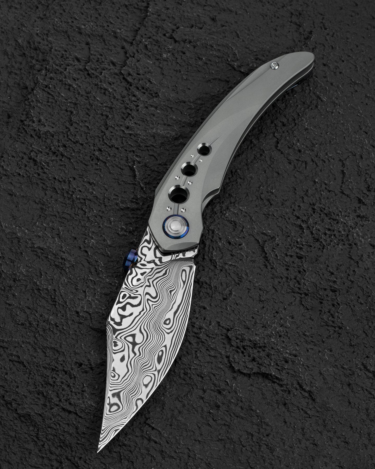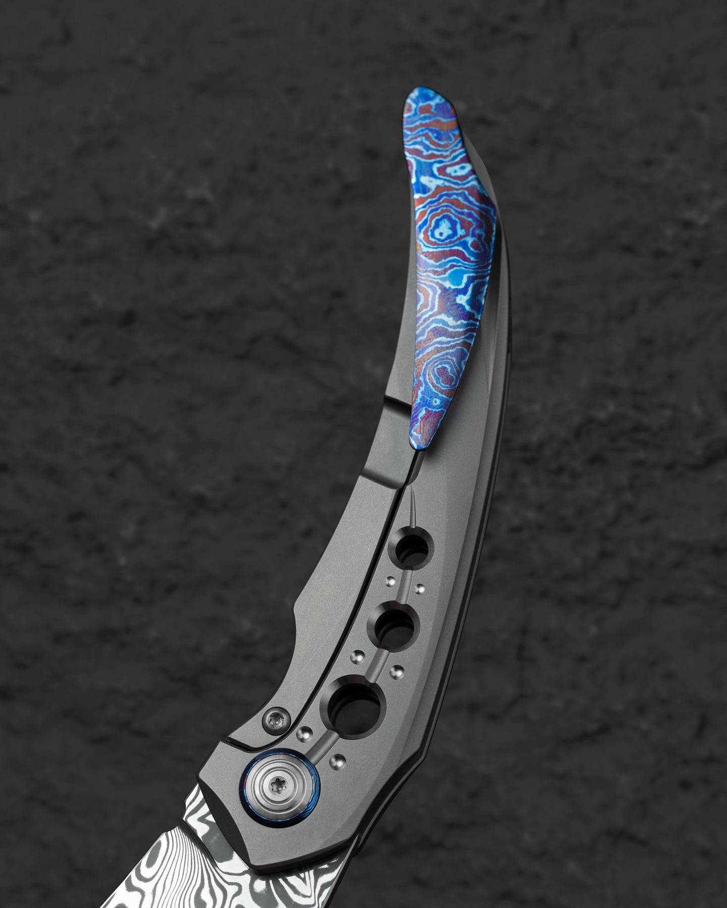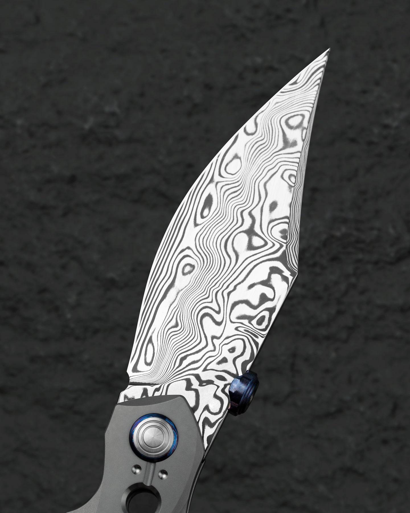 刀片表面处理:大马士革钢 手柄材质: 钛 描述:框架锁 手柄颜色:灰色 总长度:8.66 英寸(220 毫米) 闭合长度:4.79 英寸(121.7 毫米) 刀片长度:3.87 英寸(98.3 毫米) 刀片厚度:0.150 英寸(3.8 毫米) 刀片硬度:60-62HRC 夹子材质:钛马士革 后垫片:钛 滚珠轴承:陶瓷 刀重:116g