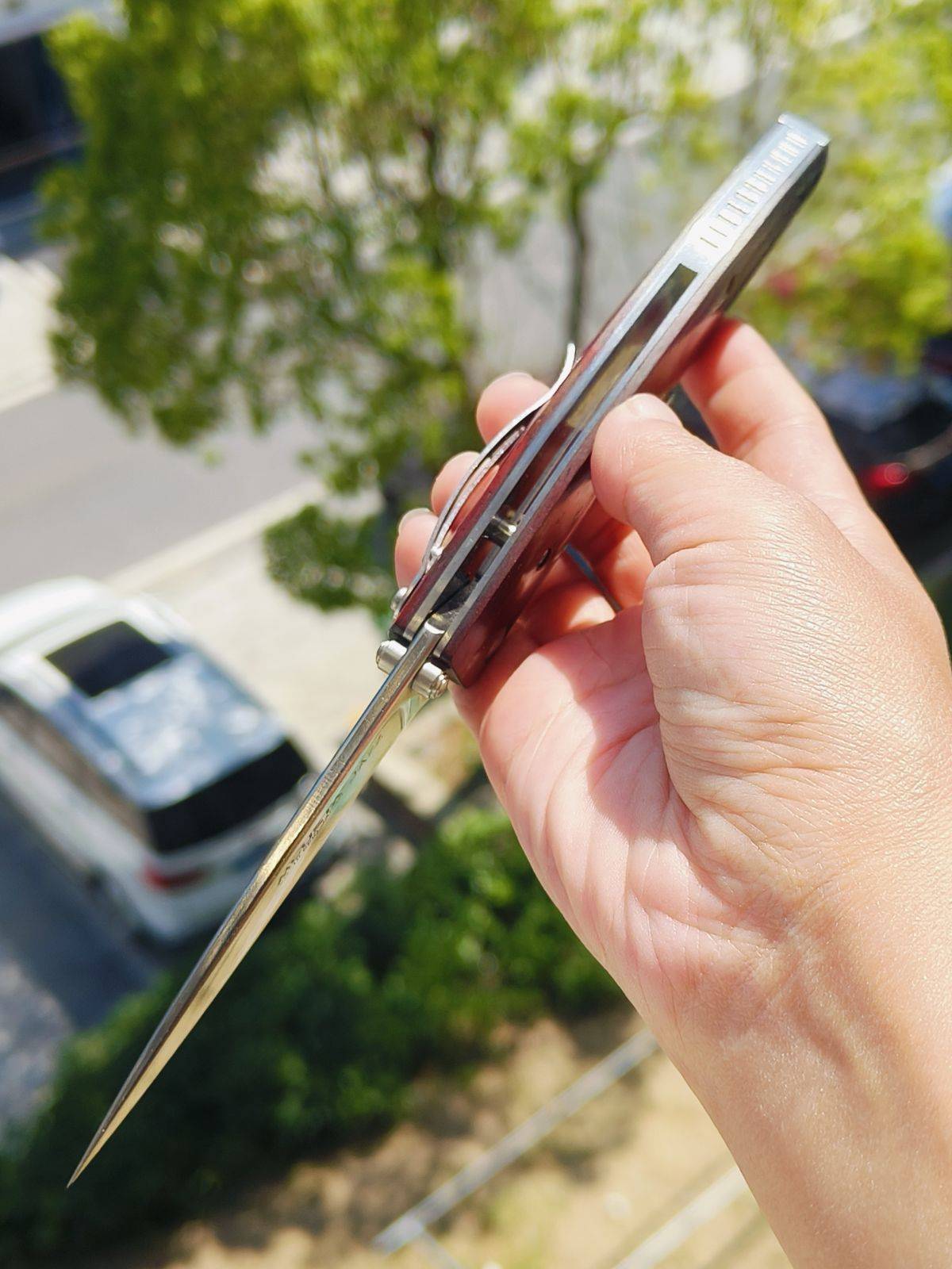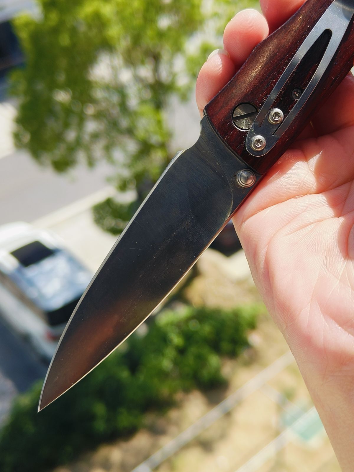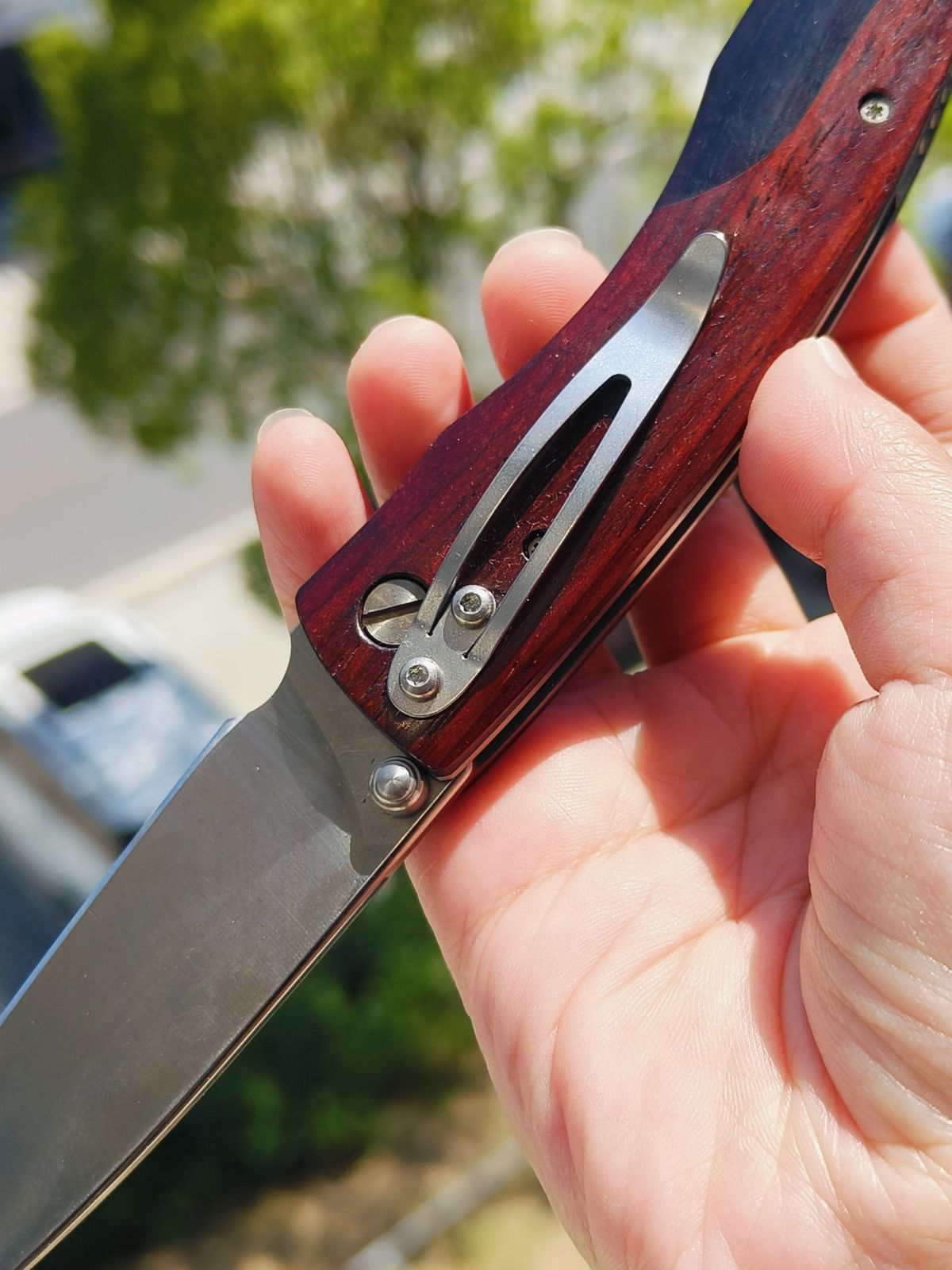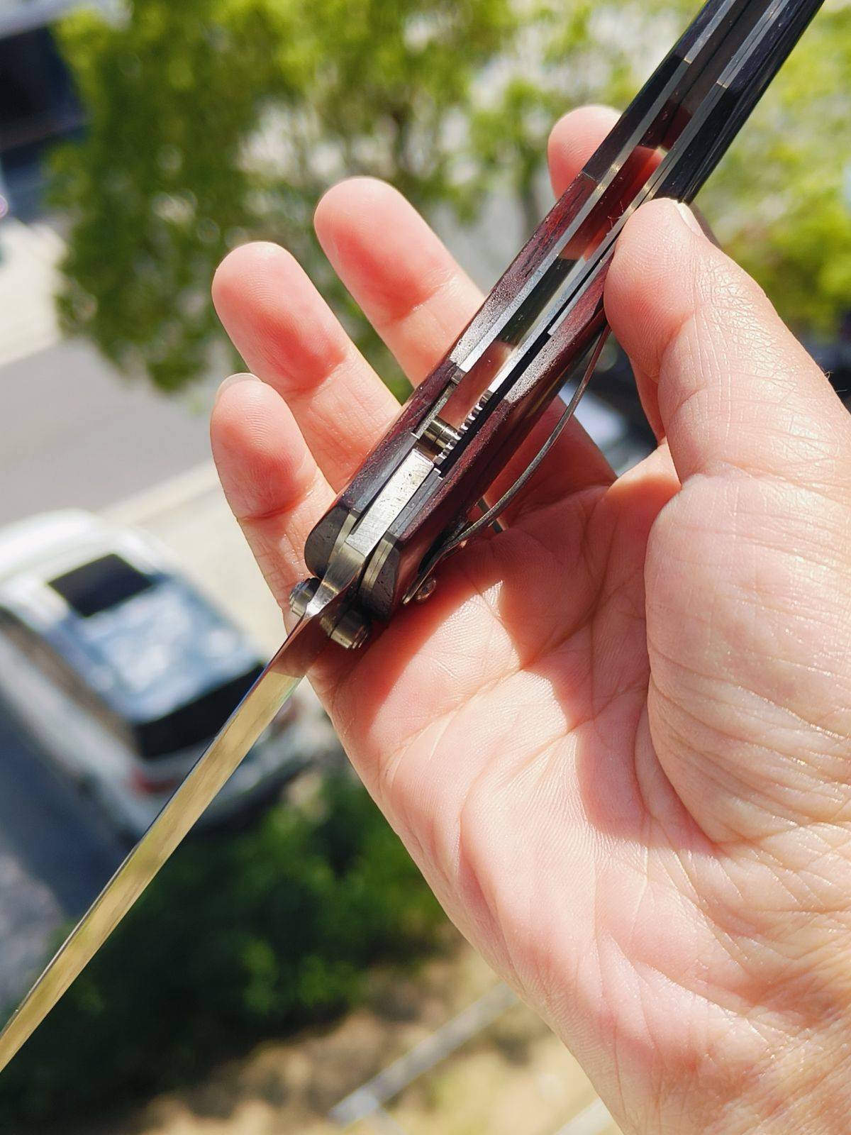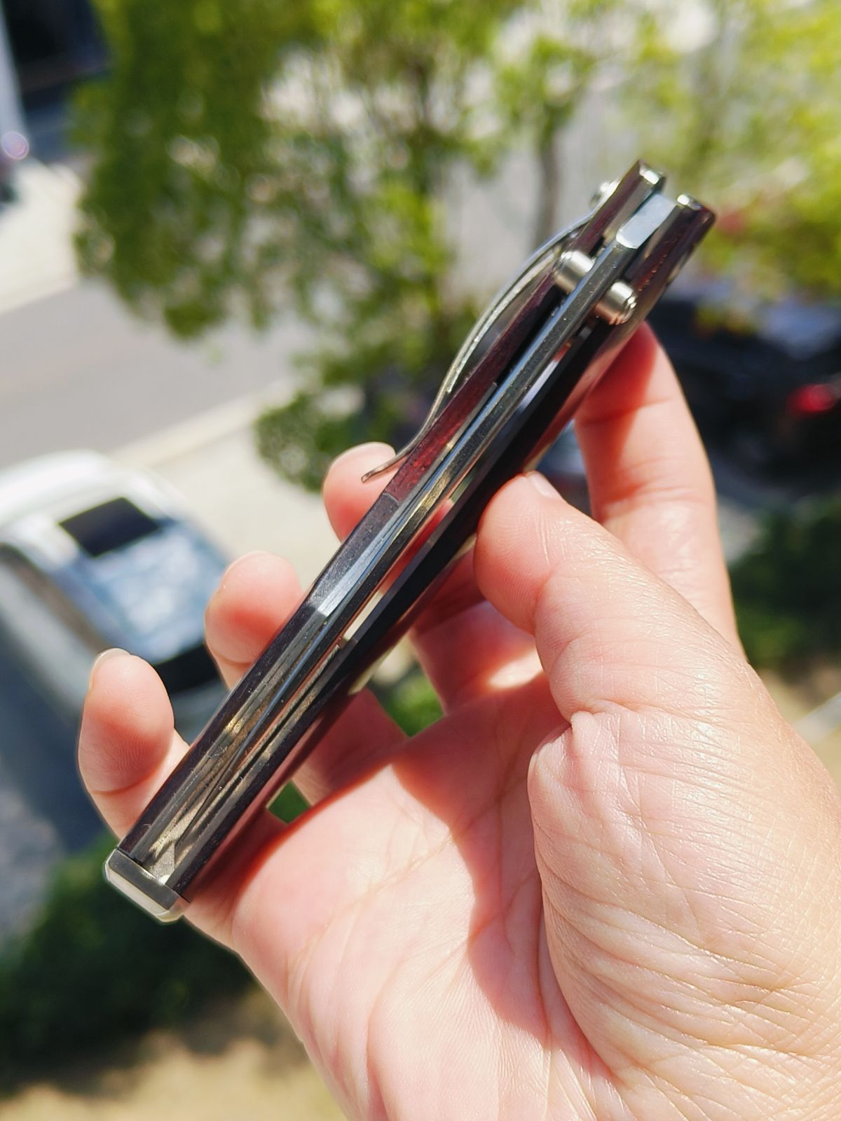 刀片: Jazz 的水滴头刀片采用实心 VG-10 不锈钢制成,配备全平面磨削,可实现出色的切片性能,同时保持良好的耐用性。冠状的书脊和抛光的缎面处理非常适合定制系列绅士文件夹。它可以通过与缎面枢轴硬件相匹配的双拇指螺柱在聚四氟乙烯垫圈上顺利打开。刀片美观、实用且实用。