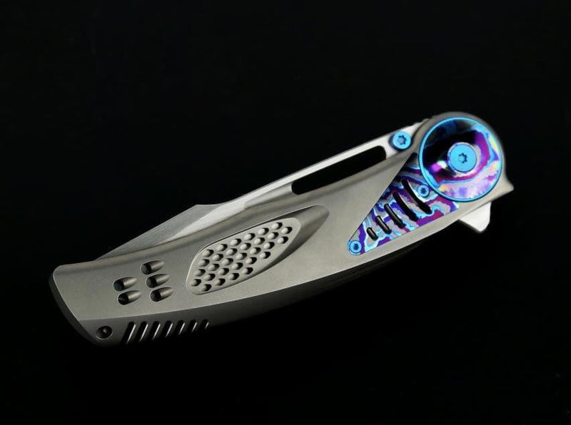 型号:GTR 全长:223mm 刃长:91mm 闭合长度:127mm 刃厚:4mm 钢材:M390 硬度:60HRC 表面处理:缎面 柄材处理:喷砂处理 镶嵌:Zircuti/锆 重量:156.7克