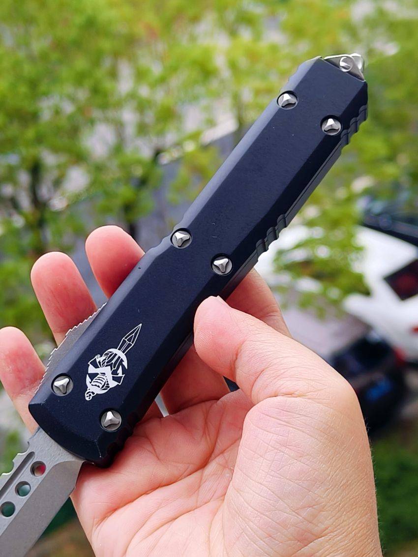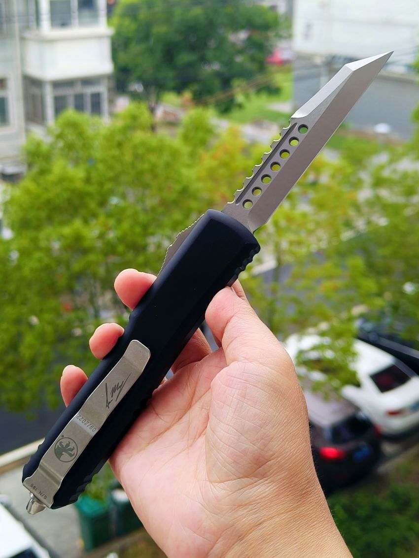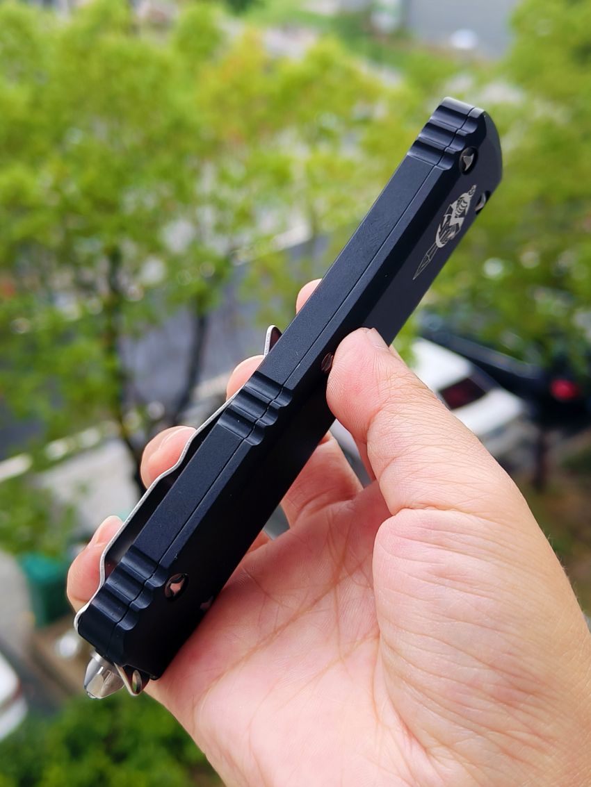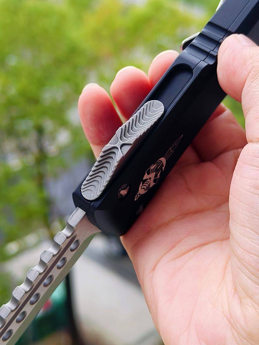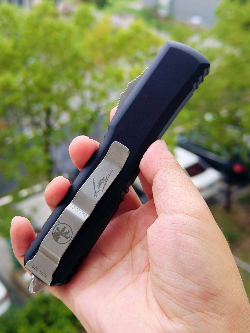 此款Microtech Ultratech Warhound战犬新款采用黑色铝柄,采用简洁有力的手推式设计,只需一个动作即可完成开刀或收刀的动作,弹力超强新款采用DLC黑铝握把与DLC组件,特别的石洗背齿平刃,精密的结构设计,无论在工艺与设计或是实用与美感都相当具有收藏价值。