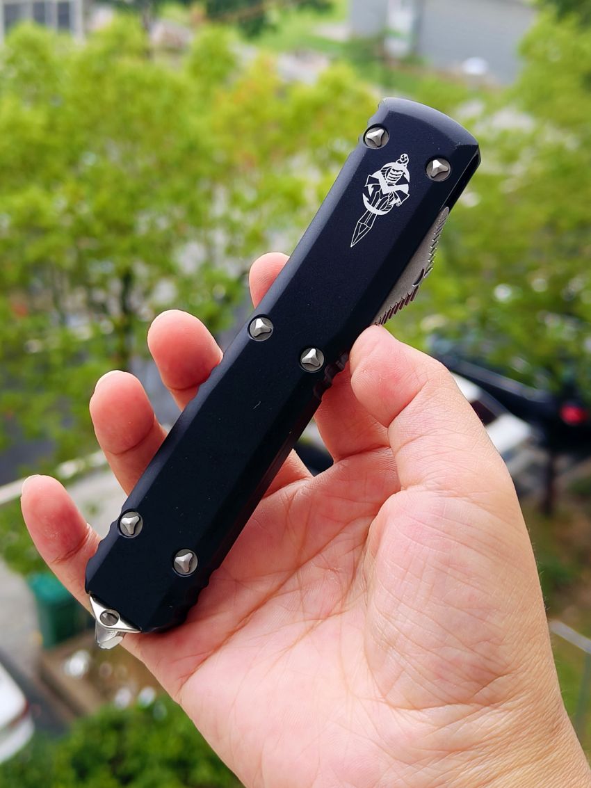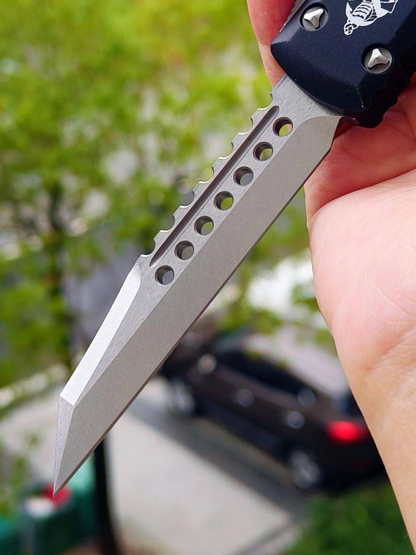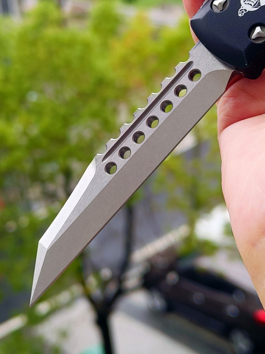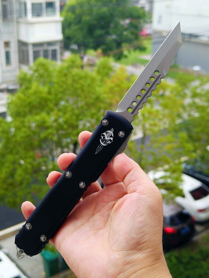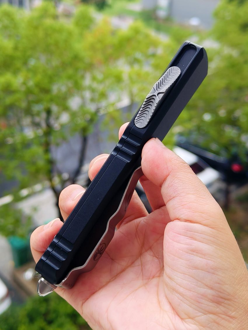 此款Microtech Ultratech Warhound战犬新款采用黑色铝柄,采用简洁有力的手推式设计,只需一个动作即可完成开刀或收刀的动作,弹力超强新款采用DLC黑铝握把与DLC组件,特别的石洗背齿平刃,精密的结构设计,无论在工艺与设计或是实用与美感都相当具有收藏价值。