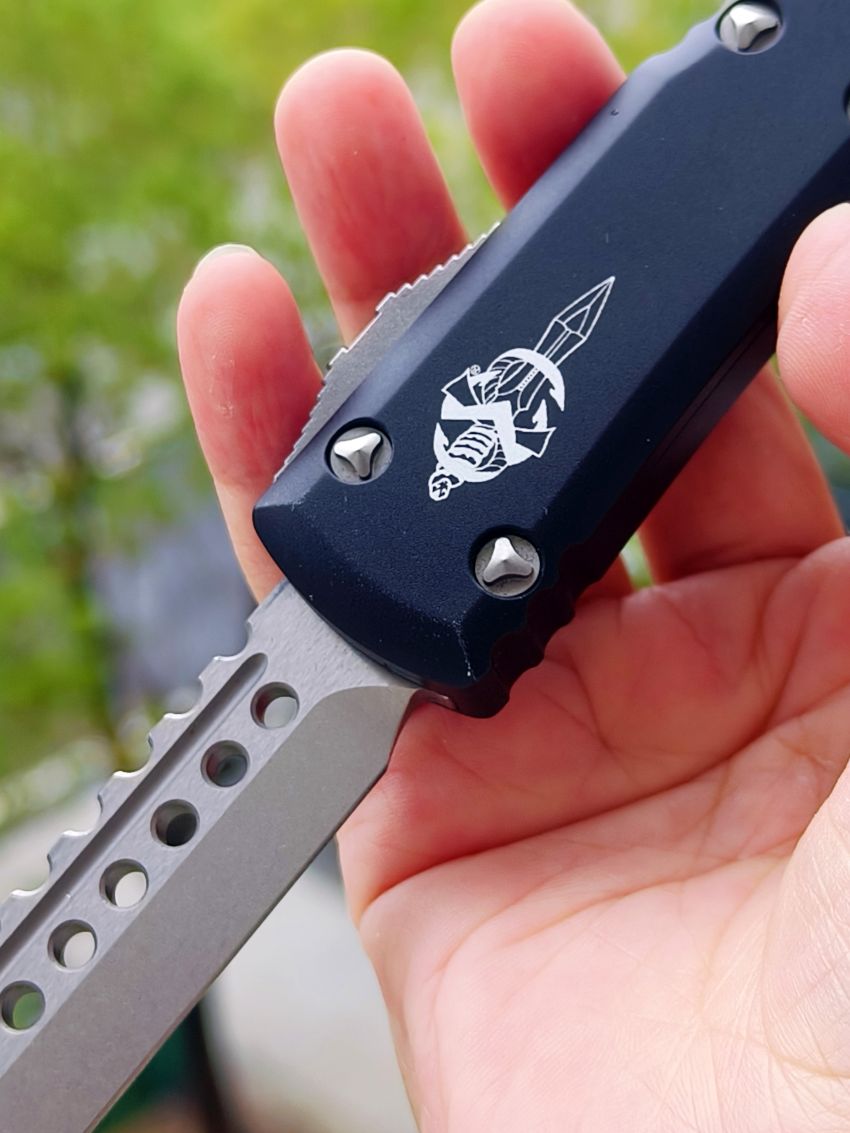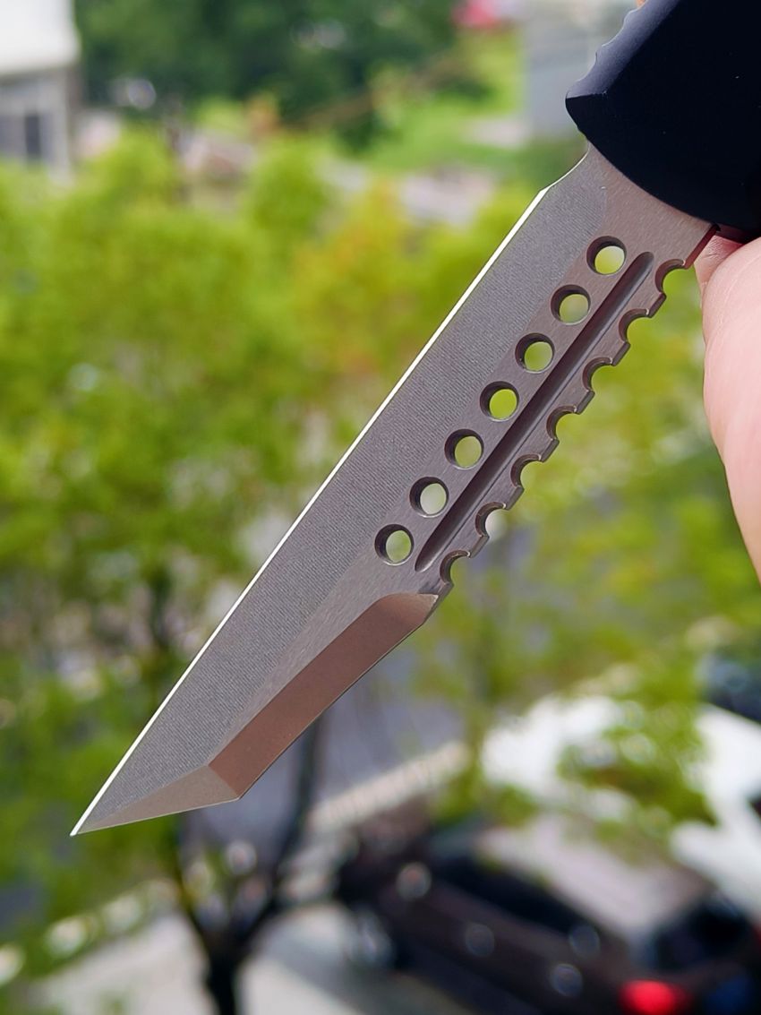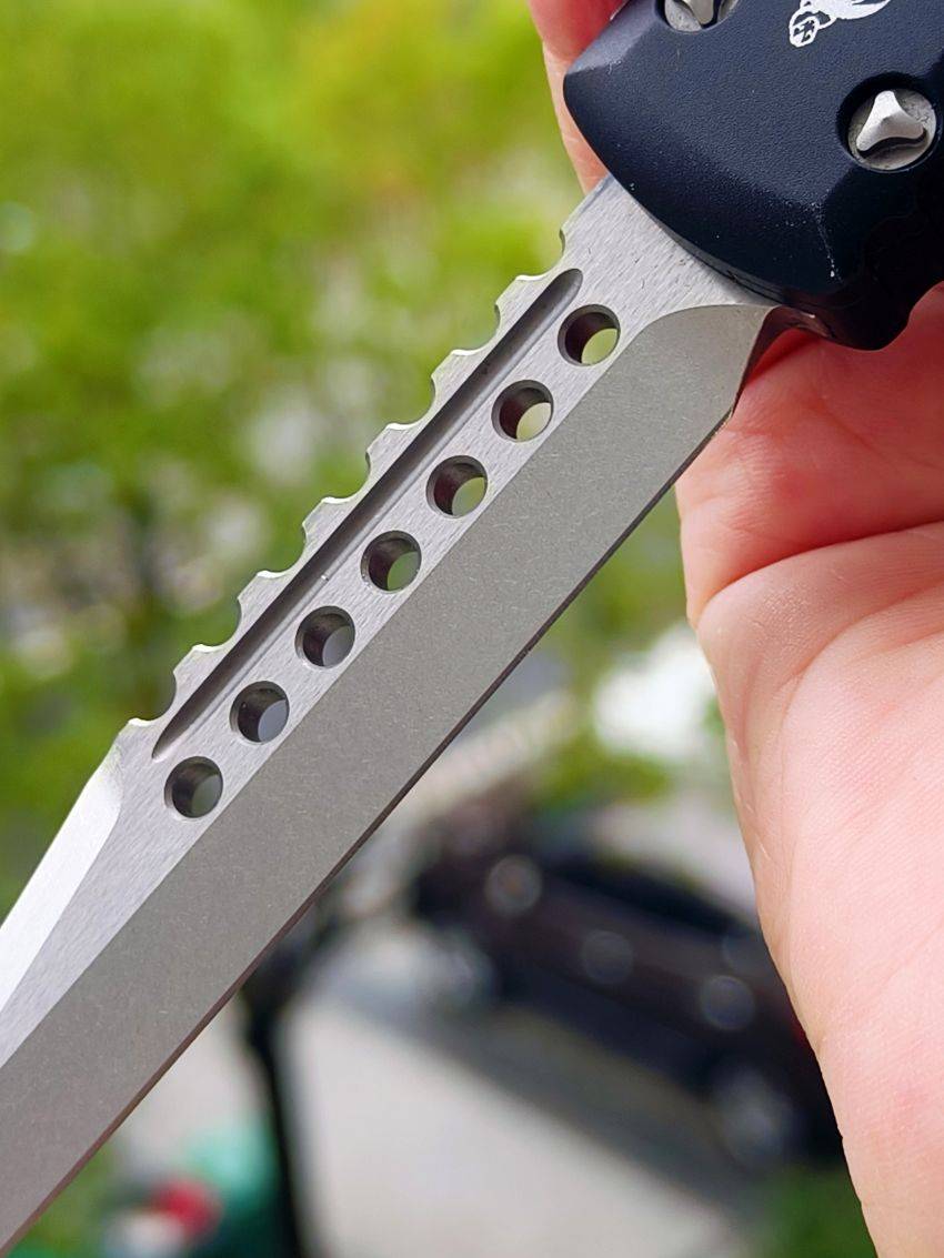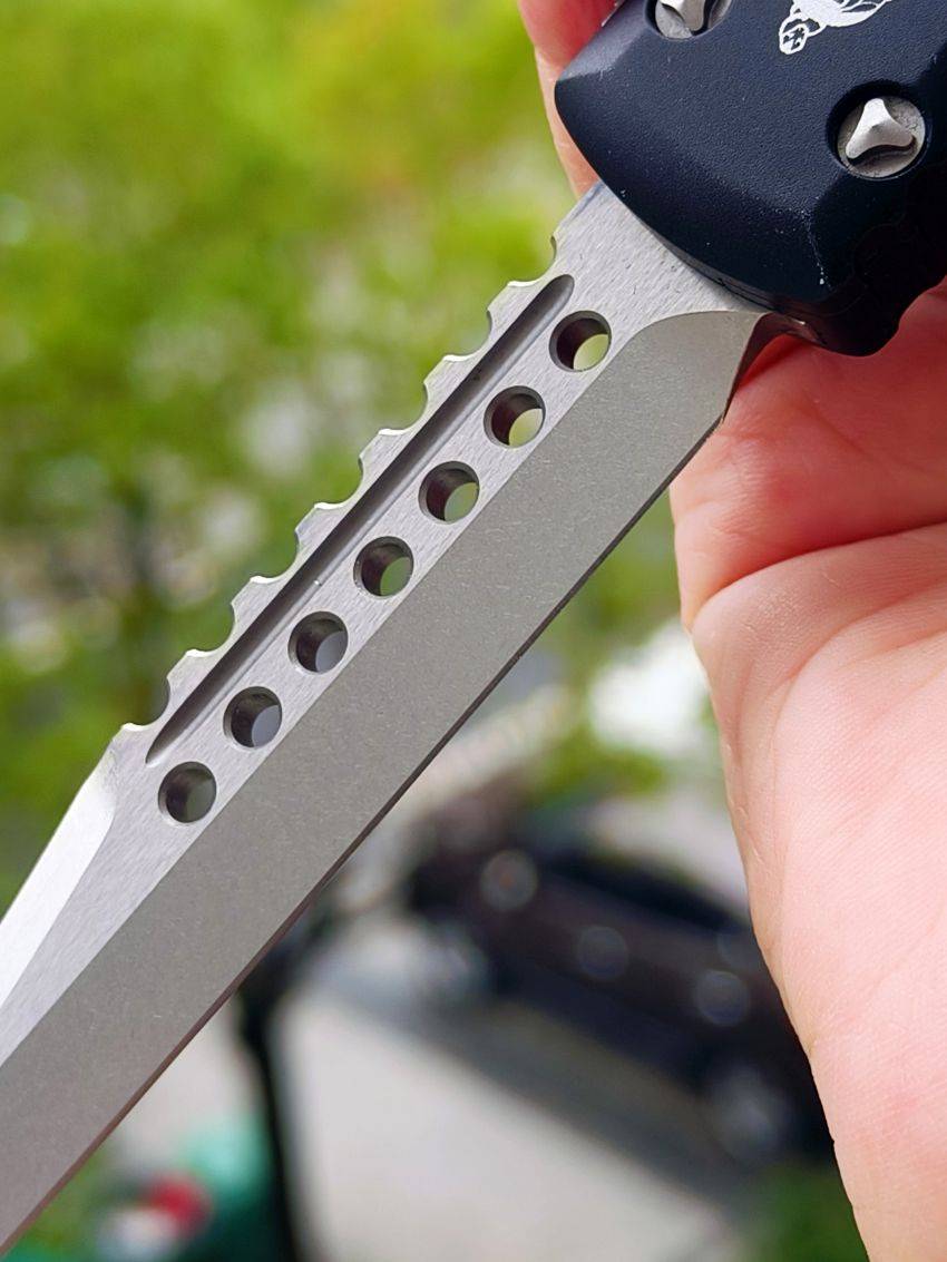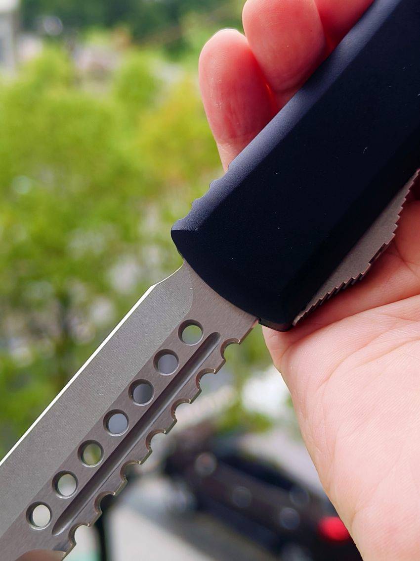 此款Microtech Ultratech Warhound战犬新款采用黑色铝柄,采用简洁有力的手推式设计,只需一个动作即可完成开刀或收刀的动作,弹力超强新款采用DLC黑铝握把与DLC组件,特别的石洗背齿平刃,精密的结构设计,无论在工艺与设计或是实用与美感都相当具有收藏价值。