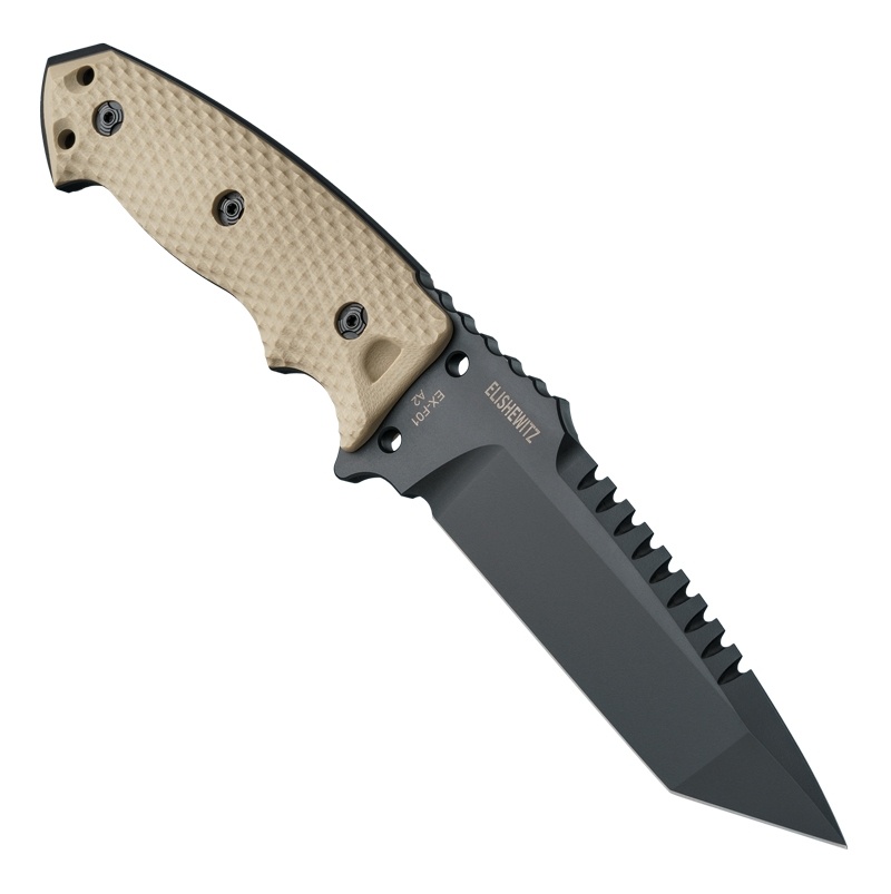 刀片 +轮廓:Tanto 带宽后锯齿 +厚度:0.235 英寸 +材质:A2 工具钢 +硬度:57-59 HRC +处理:低温热处理 +表面处理:黑色 Cerakote ® +平磨 - 手工磨光边缘