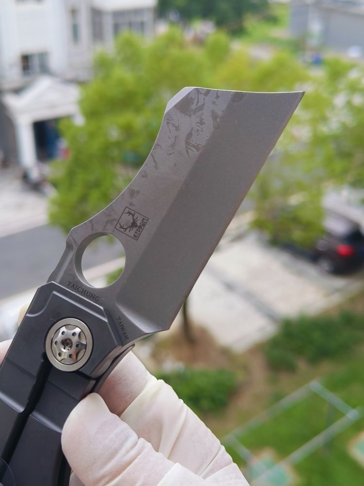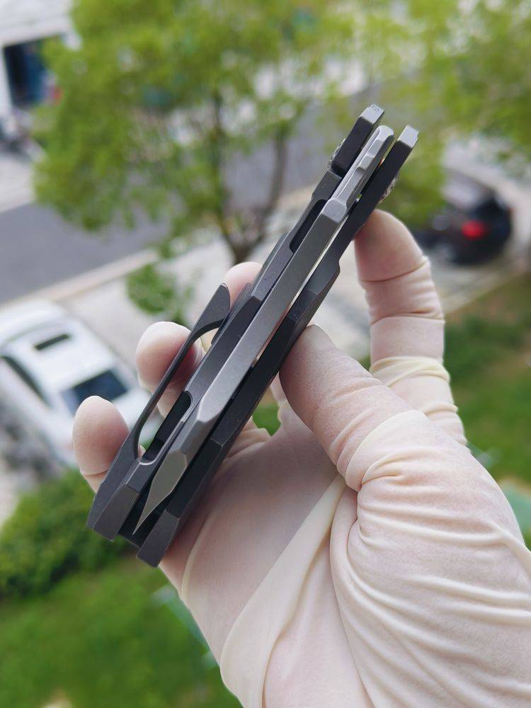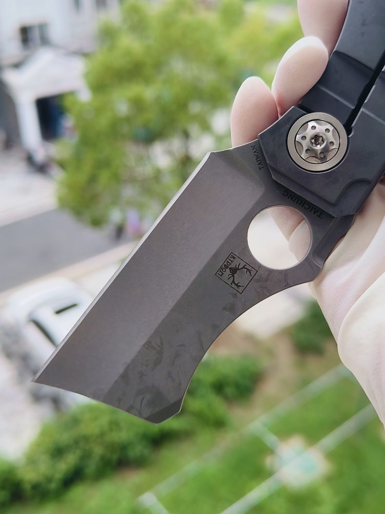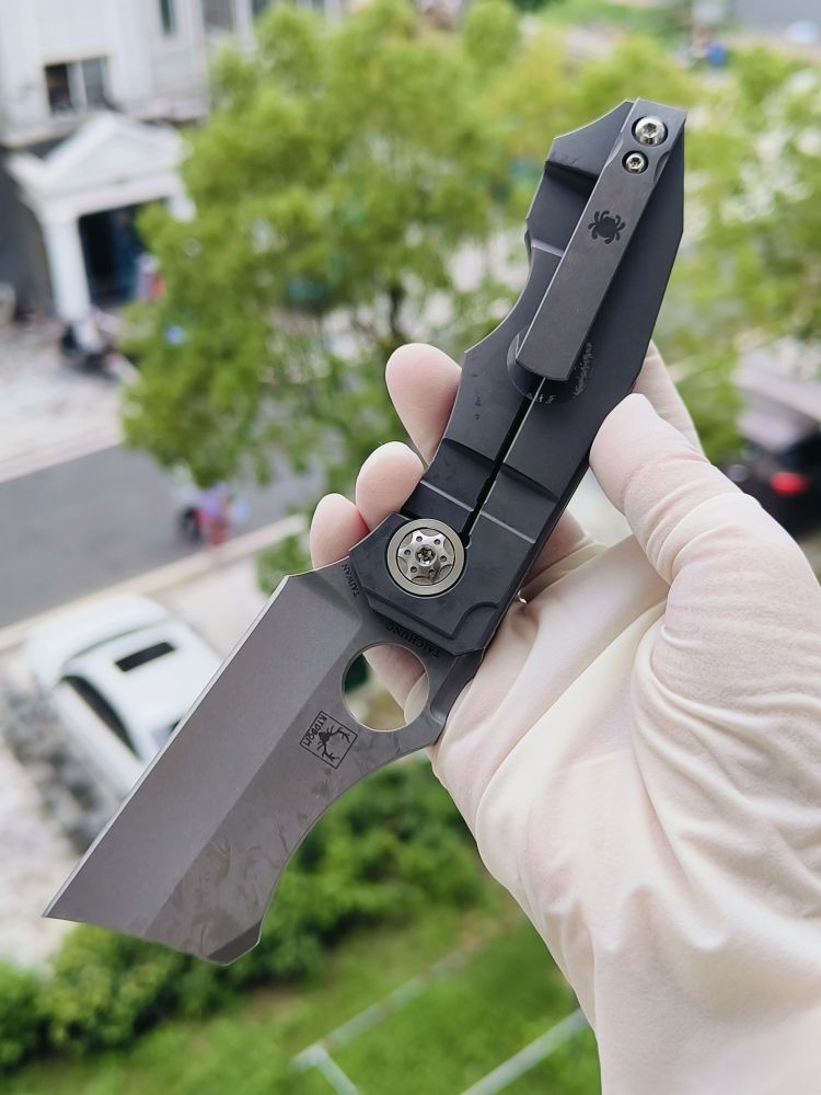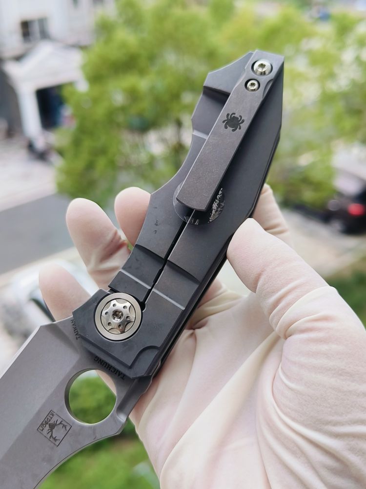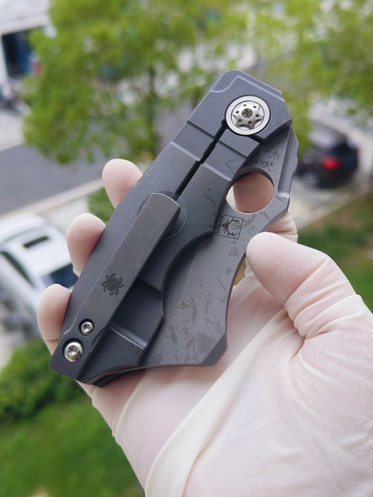 Stovepipe 的手柄由两块实心钛板制成,中间由钛背衬连接。两块钛板都经过精心加工,外部表面呈现精美的冠状,外形时尚而符合人体工程学。背面的钛板构成了刀具坚固的 Reeve Integral Lock (RIL) 机制的基础,该机制可在使用过程中将刀片牢固地锁定在打开状态。它还装有机械加工的钛夹,方便从右侧将刀尖朝上携带。夹子、钛板、背衬和刀片都拥有实用的工业风格石洗饰面。这与刀具的超大枢轴销形成鲜明对比,枢轴销经过加工,带有艺术细节,表面采用明亮的缎面处理,并兼作锁杆的超行程止动器。