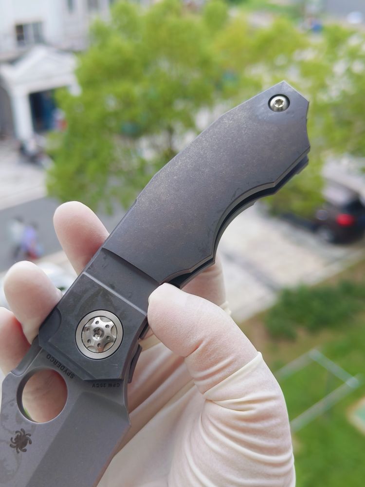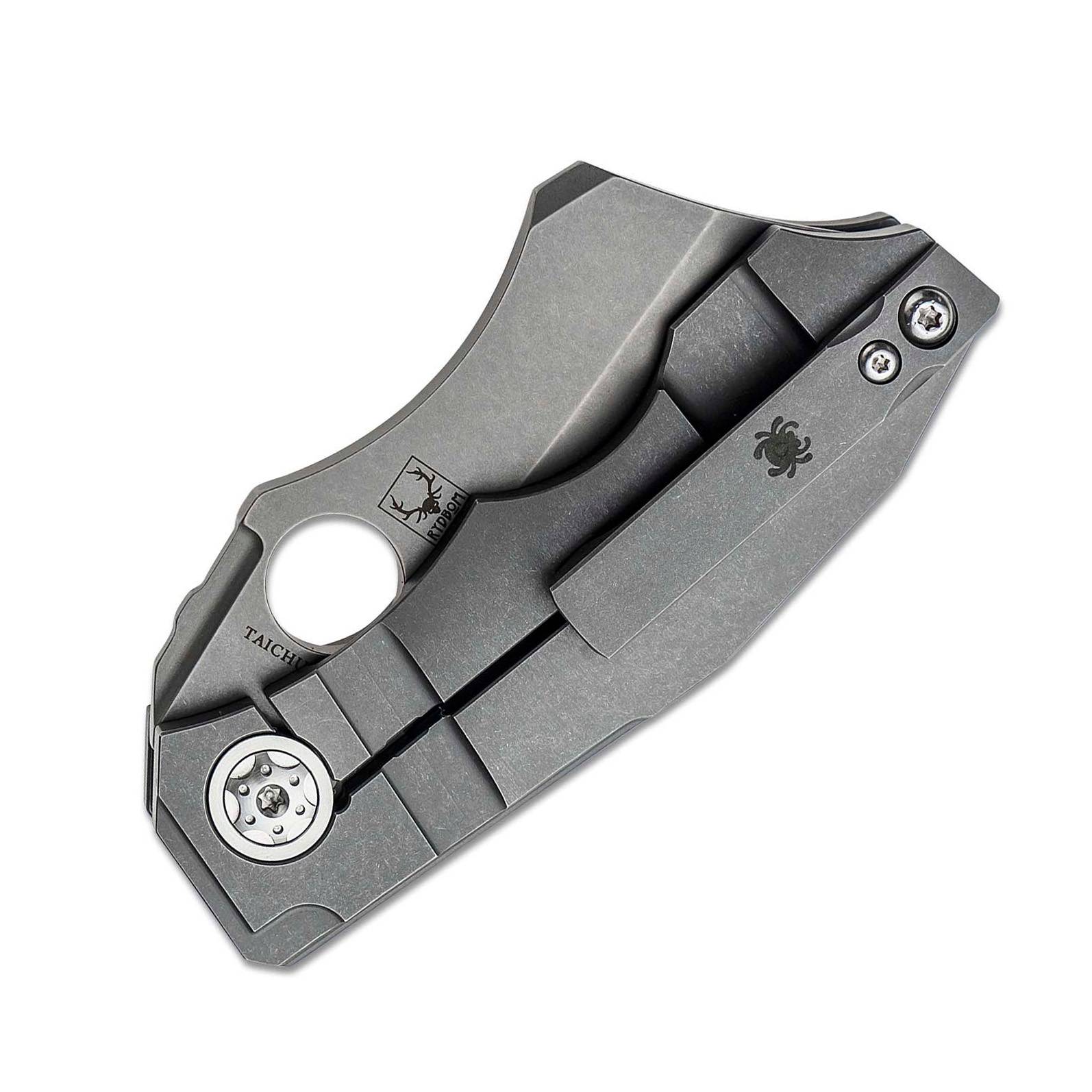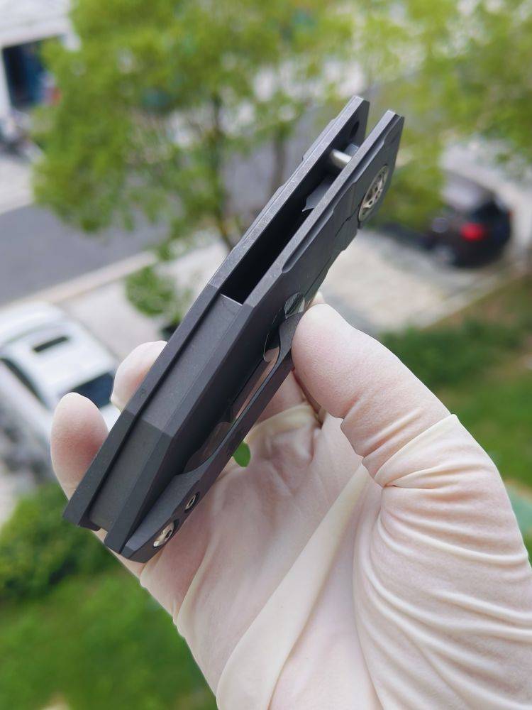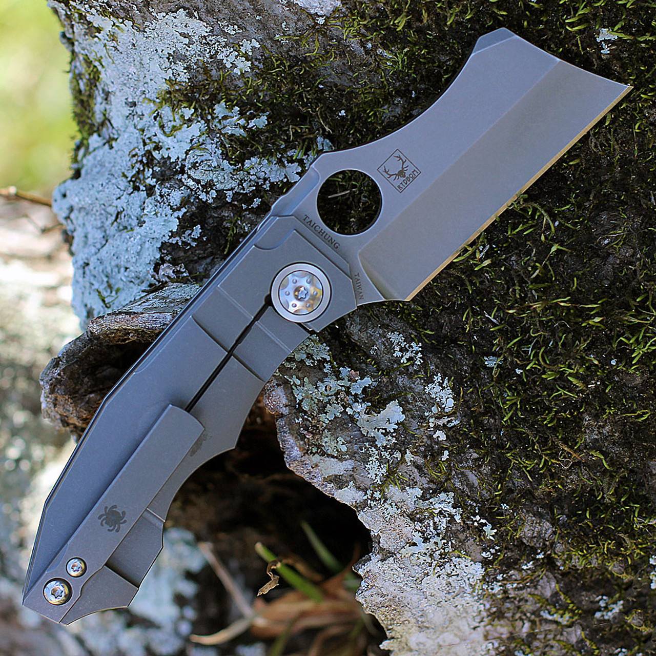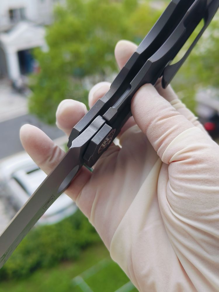 Stovepipe 的手柄由两块实心钛板制成,中间由钛背衬连接。两块钛板都经过精心加工,外部表面呈现精美的冠状,外形时尚而符合人体工程学。背面的钛板构成了刀具坚固的 Reeve Integral Lock (RIL) 机制的基础,该机制可在使用过程中将刀片牢固地锁定在打开状态。它还装有机械加工的钛夹,方便从右侧将刀尖朝上携带。夹子、钛板、背衬和刀片都拥有实用的工业风格石洗饰面。这与刀具的超大枢轴销形成鲜明对比,枢轴销经过加工,带有艺术细节,表面采用明亮的缎面处理,并兼作锁杆的超行程止动器。
