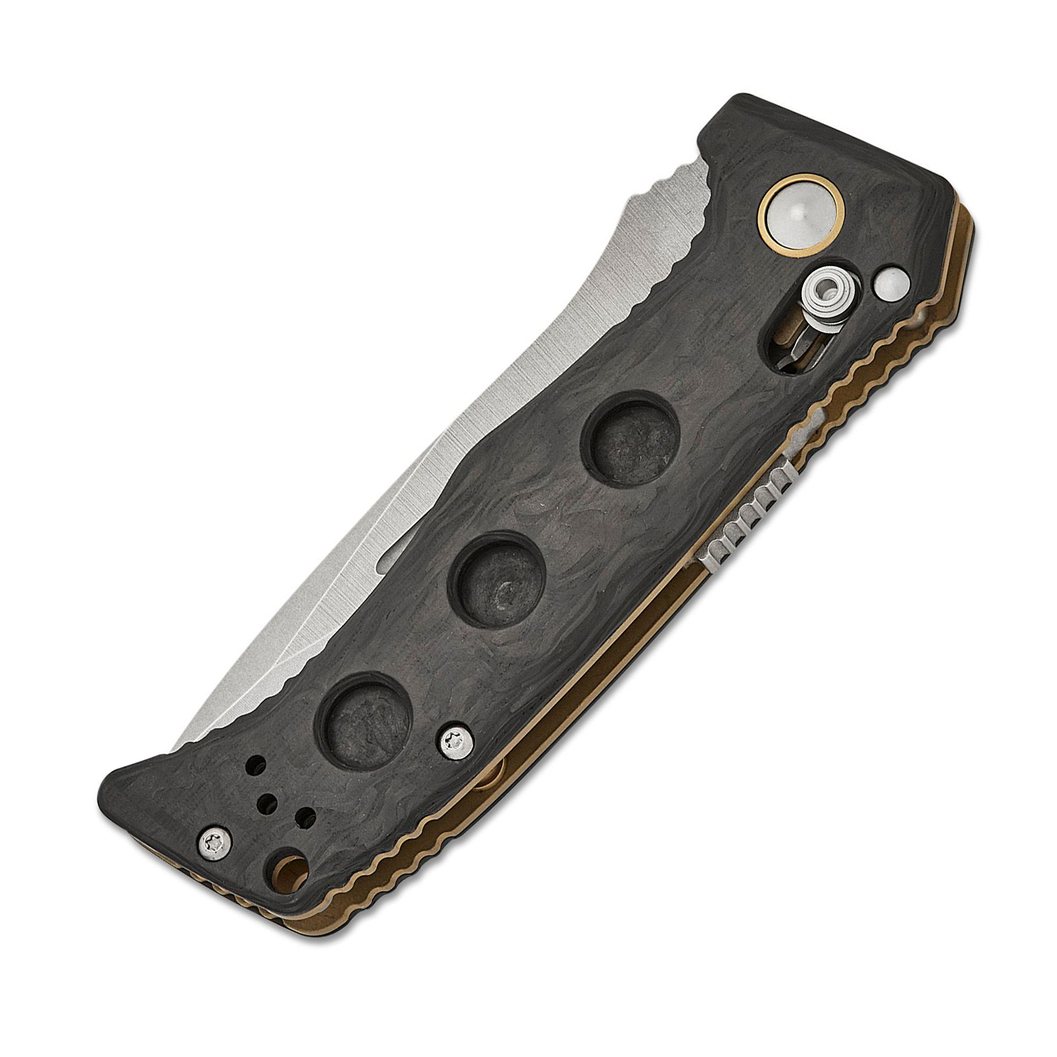 仿佛这款名为 Mini Auto Adamas 的紧凑型战术坦克已经无法再改进…… Benchmade必须努力让它变得更加出色。Mini Auto Adamas 2730-03 在广受欢迎的 Adamas 系列刀具中占据了明星地位,比全尺寸刀具更适合日常携带,是提升刀片钢材和手柄材料的变种。2730-03 拥有手感和 AXIS Automatic 能力,采用 CPM- MagnaCut钢材,配有令人惊叹的大理石纹碳纤维手柄,顶部配有高级时尚的五金配件。