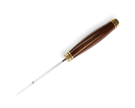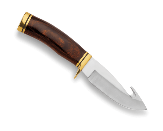 机制:固定刀片 刀片样式:滴尖式沟槽钩 刀片钢:420HC 手柄:DymaLux®,带抛光黄铜柄头和护手 护套:真皮,棕色,进口 刀片长度:4.125英寸(10.50 厘米) 刀片厚度:0.14 英寸(0.356 厘米)...
