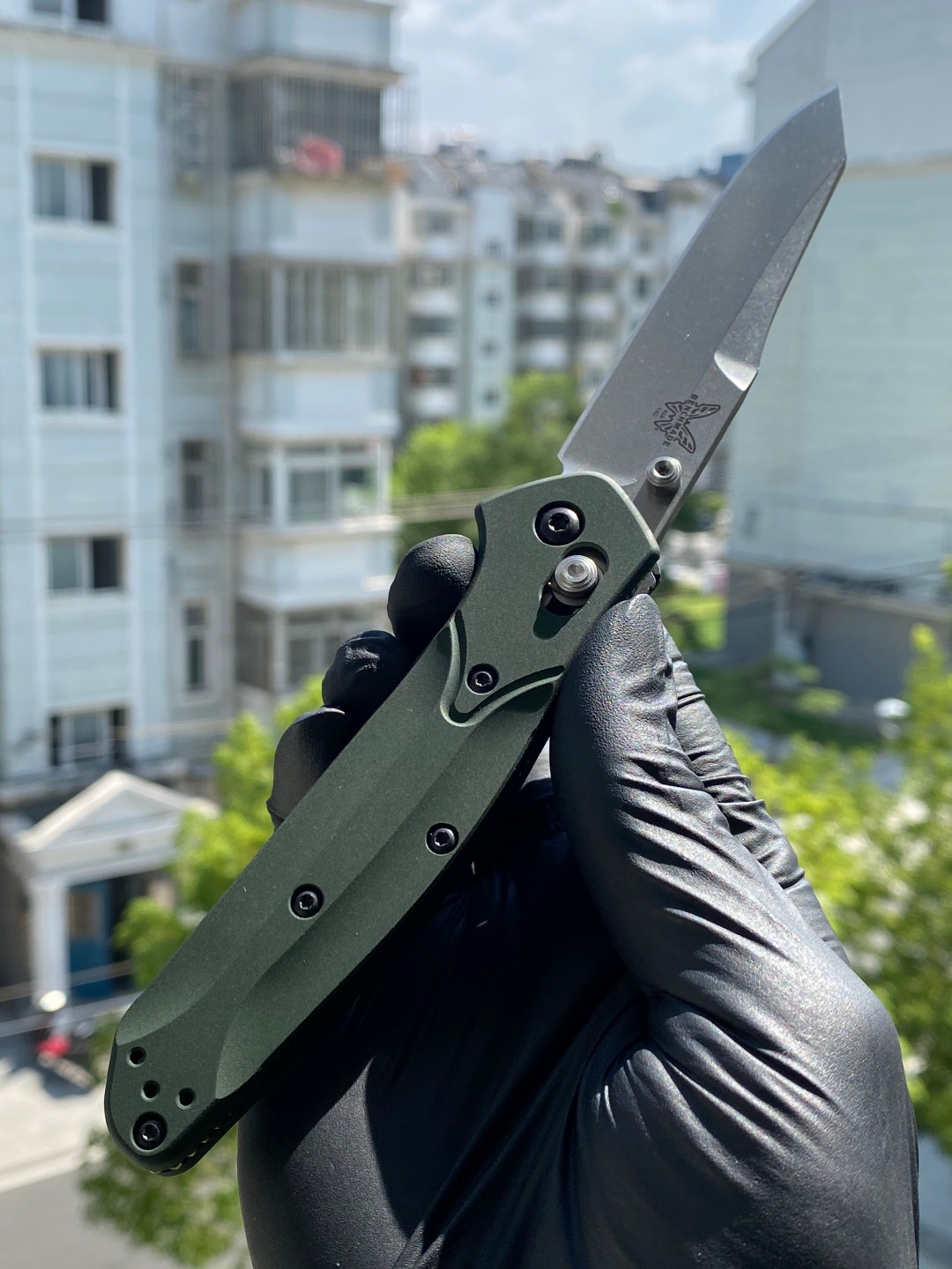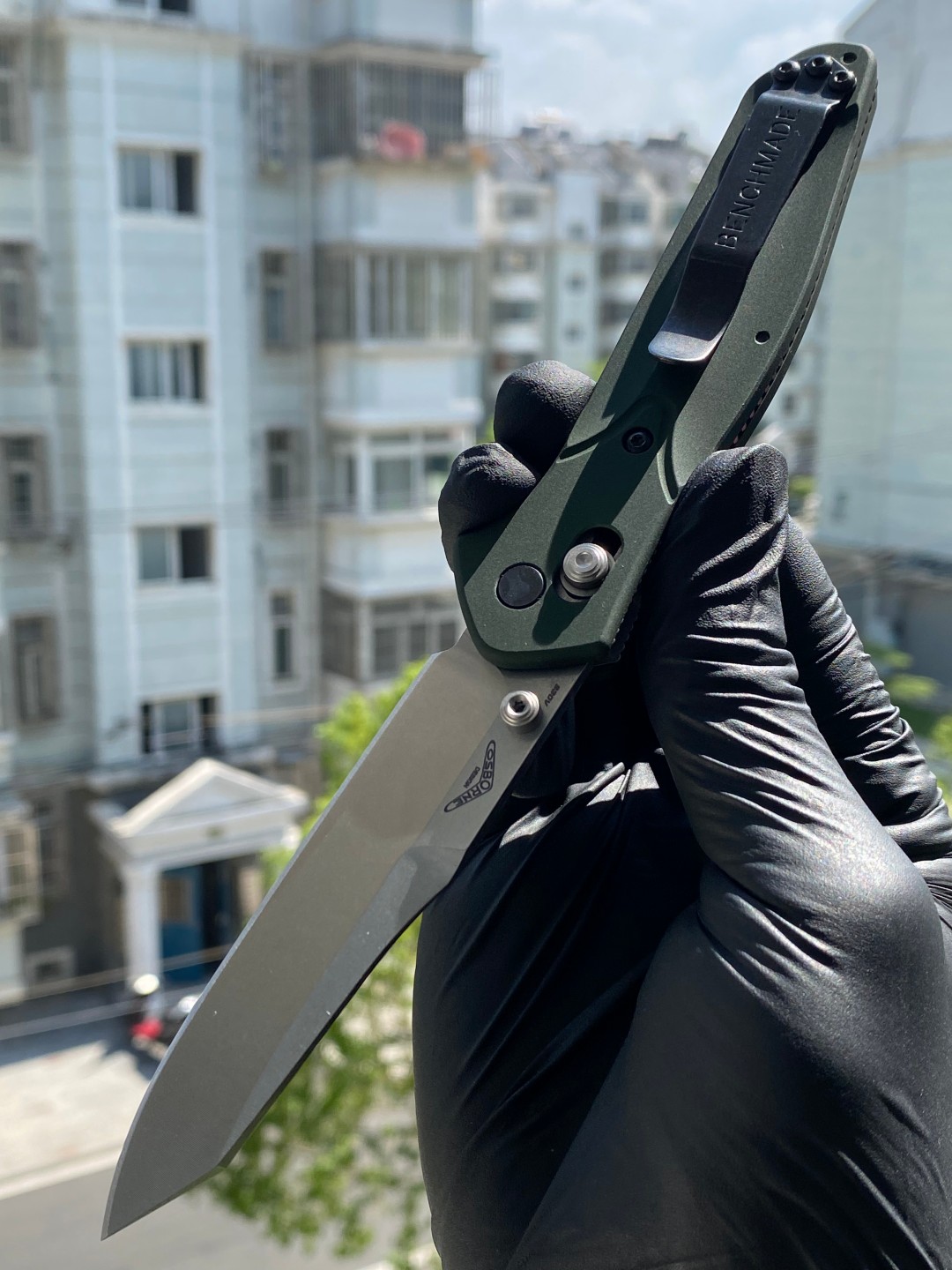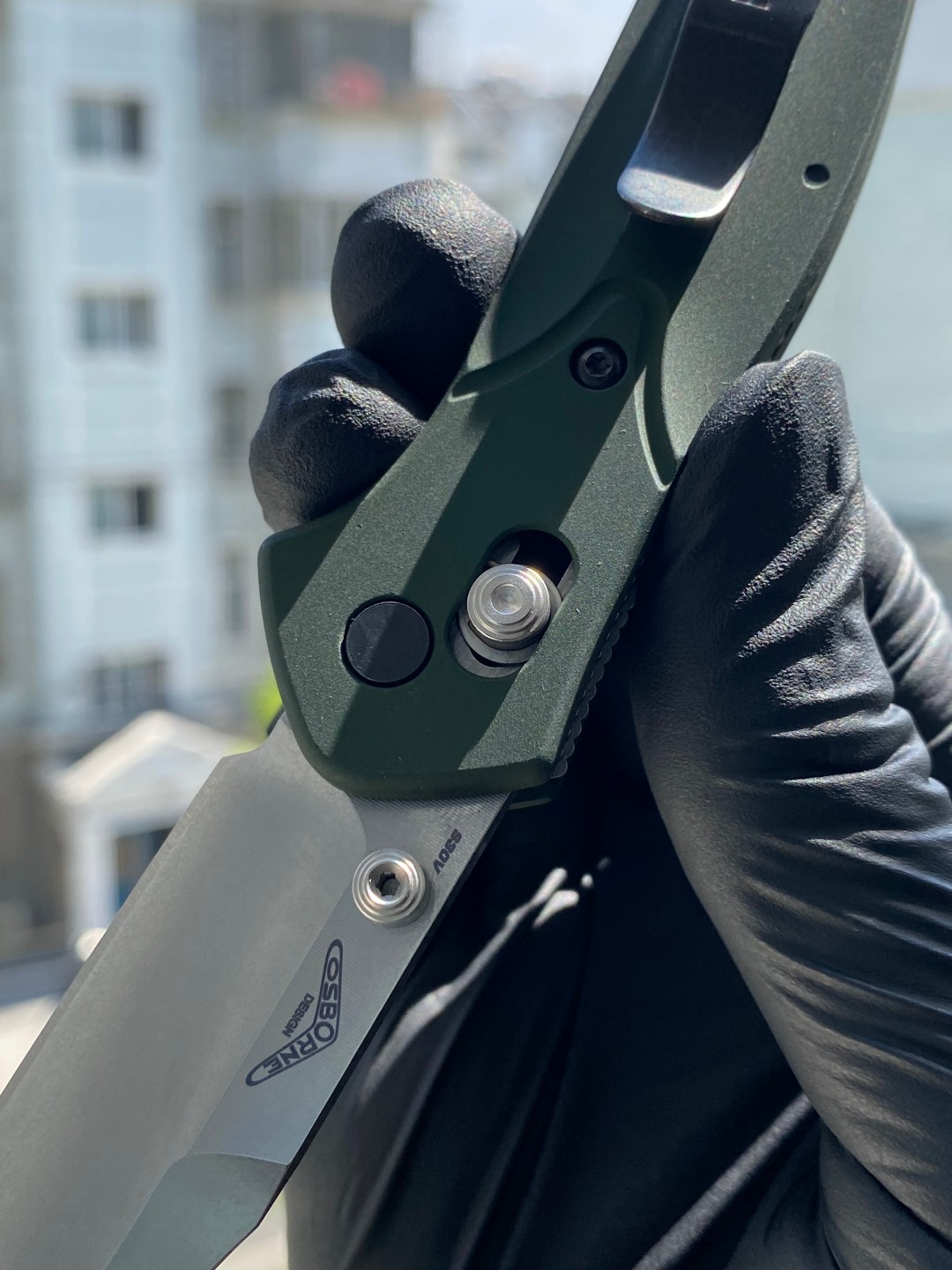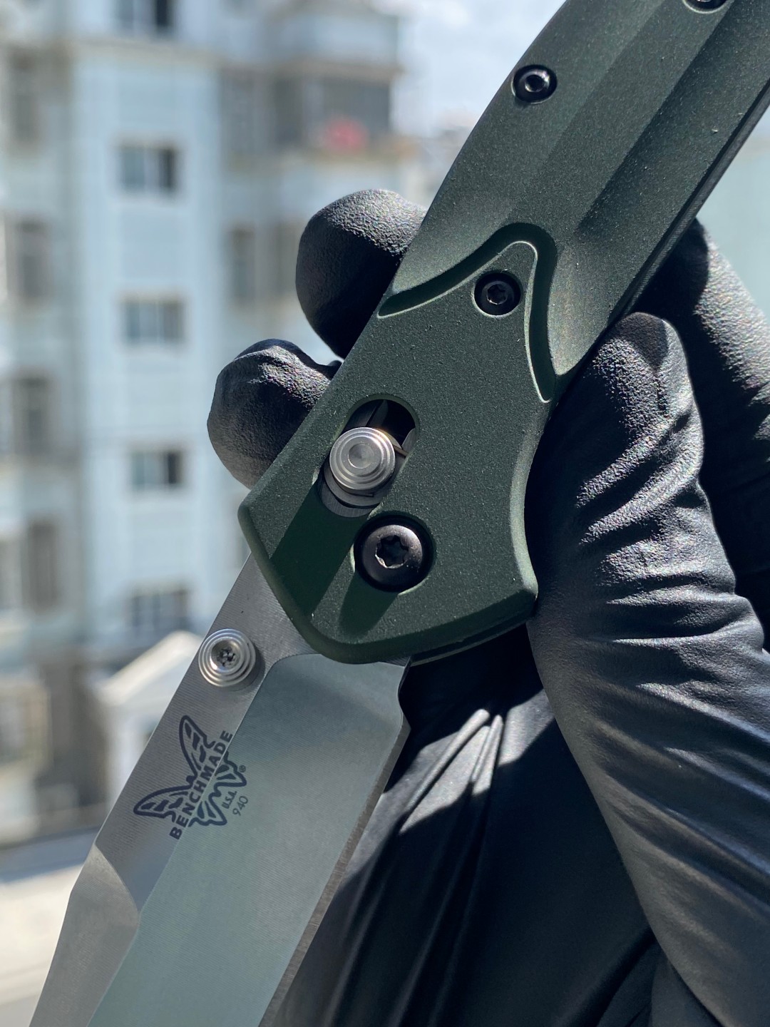 很酷。设计新颖,其外形体现了定制刀具制造商Warren Osborne认为功能和质量很重要的特质。940 型采用独特的 AXIS™ 锁定机制,功能流畅,与设计风格的纯粹性相得益彰。改良的反向 tanto 刀片形状由 S30V 不锈钢加工而成,具有双拇指螺柱开启器,可安全轻松地进行双手操作。手柄设计纤细,略有弯曲,并有凹陷轮廓,可确保握持稳定性。手柄鳞片由铝制成并经过深色阳极氧化处理,呈浓郁的绿色,由彩色阳极氧化钛背衬衬垫点缀。衬垫为 AXIS™ 锁提供可靠的功能,并具有微妙的手指踏板,可增加刀片控制。不锈钢携带夹可移动到手柄的任一侧,使 940 型成为 100% 完全双手通用的切割工具。现代设计、创新功能和更高标准的制造质量使新款 940 型具备卓越外形和功能所需的一切。
