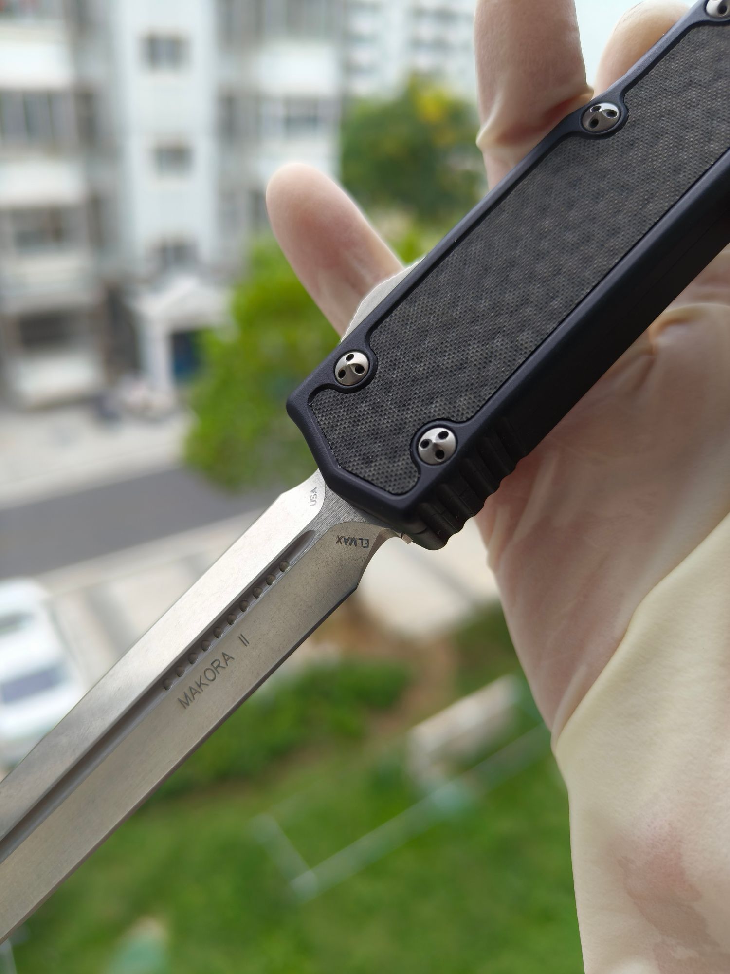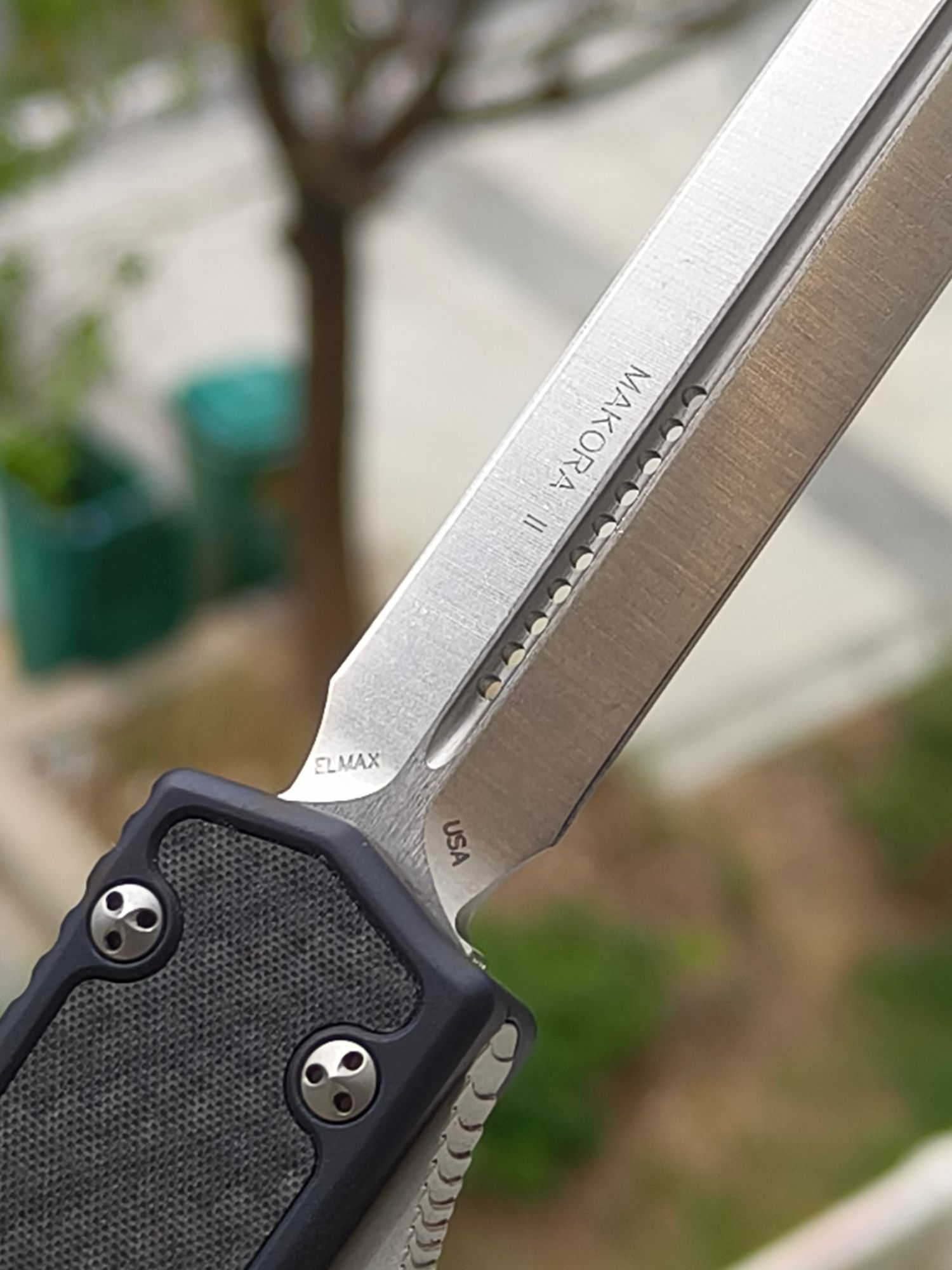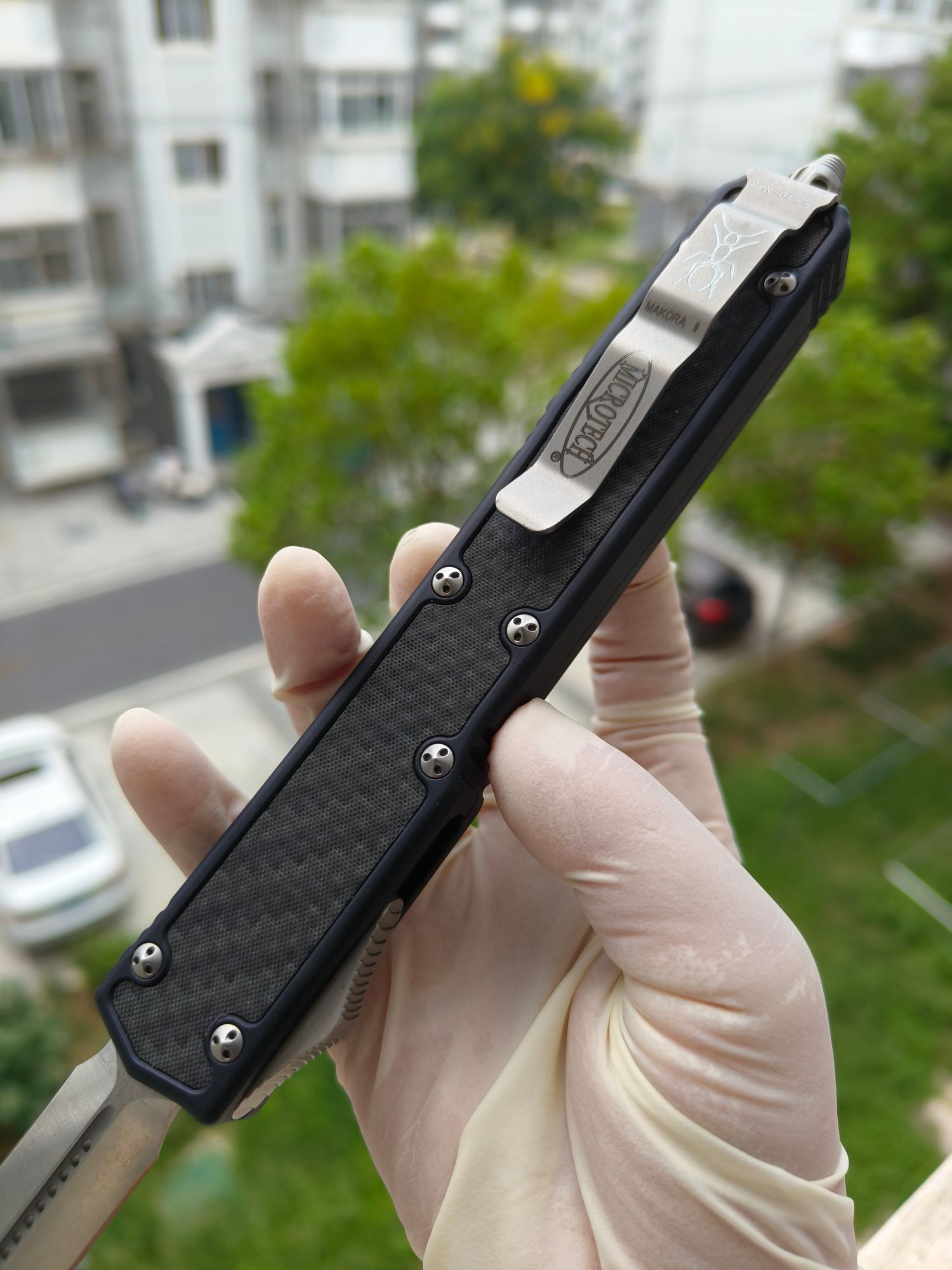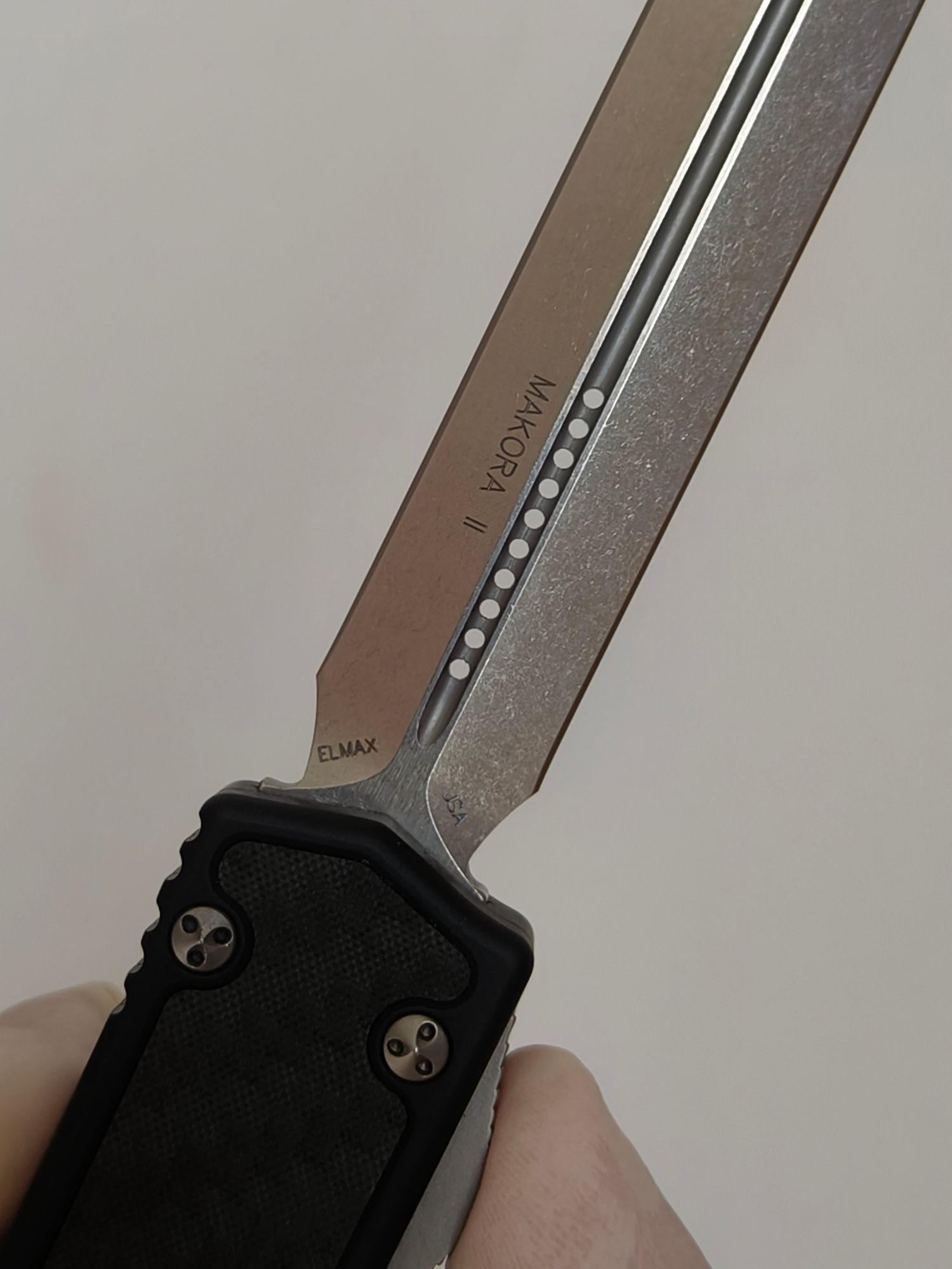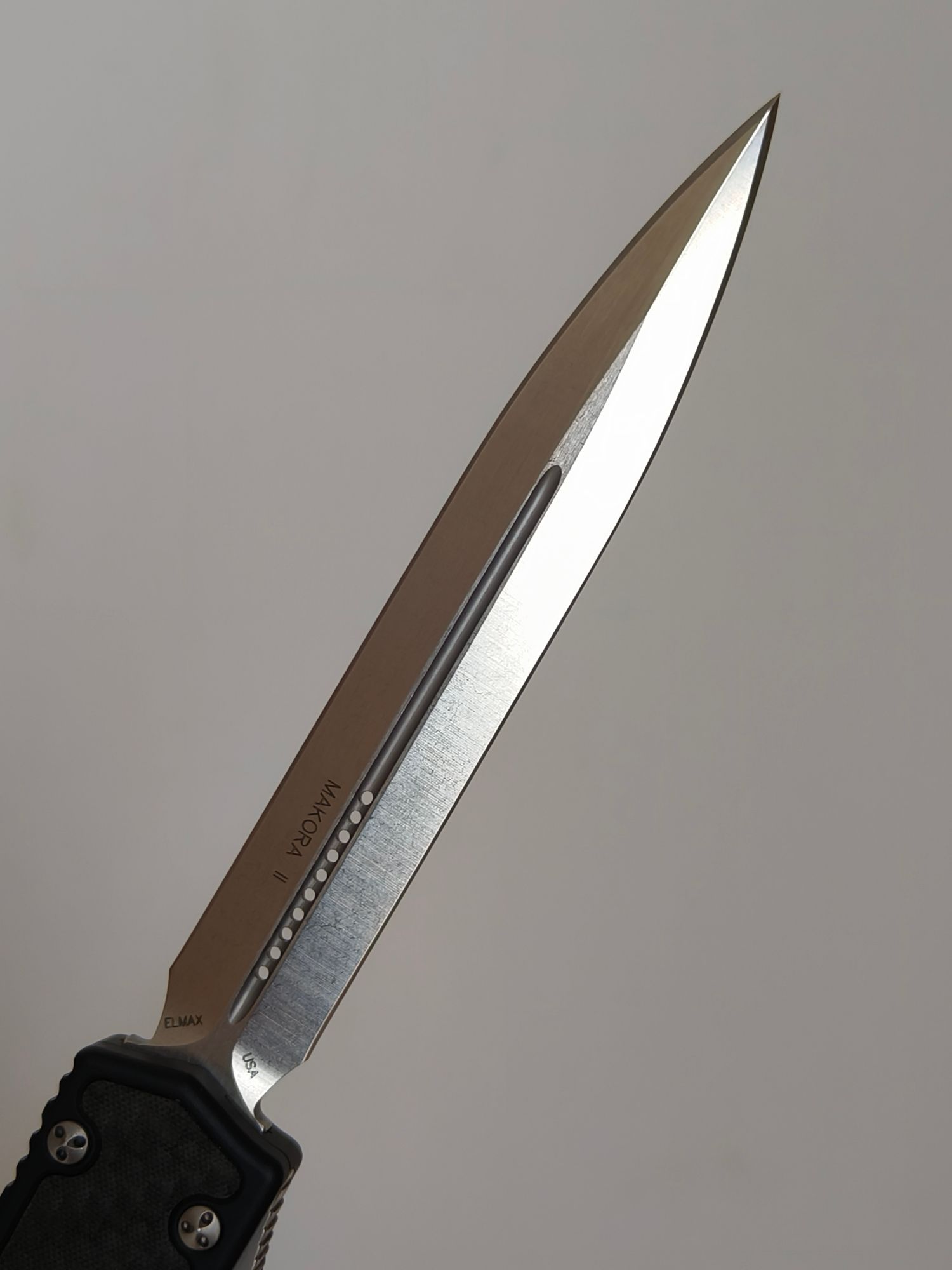 沿袭Ultratech的技术与概念,全新的Makora "圣蚂蚁" 汇集众多功能于一身;虽然拉长的握柄在外型较长,但不仅铝合金握柄轻量化整体重量,更进一步运用碳纤维材质减低重量。 Makora Ⅱ 石洗平刃弹簧刀采用ELMAX 粉末钢钢材,握柄尾端附有玻璃击破器与可左右对调的背夹适用于任何用刀习惯;阶梯式的开关钮设计同时针对手戴手套时仍可灵活且扎实地使用。