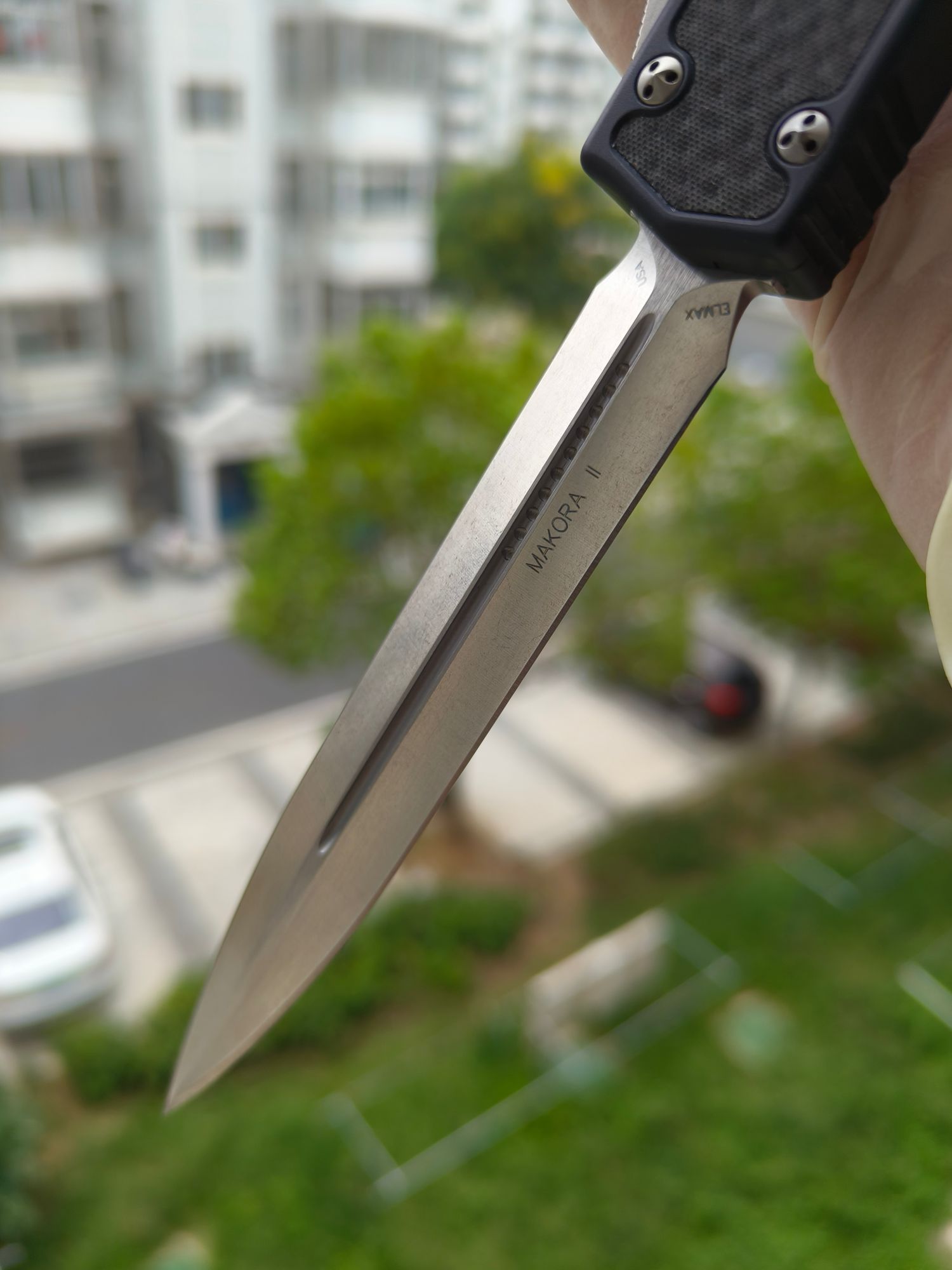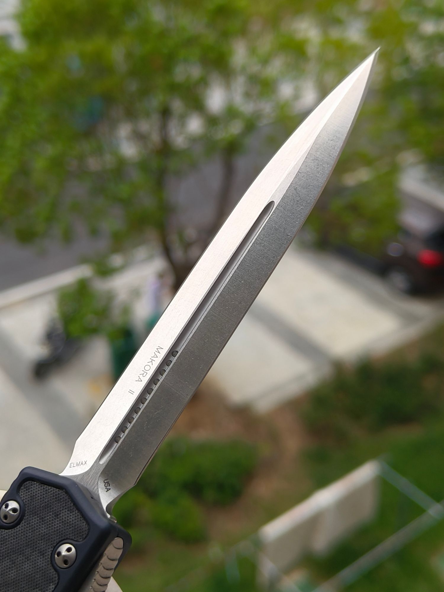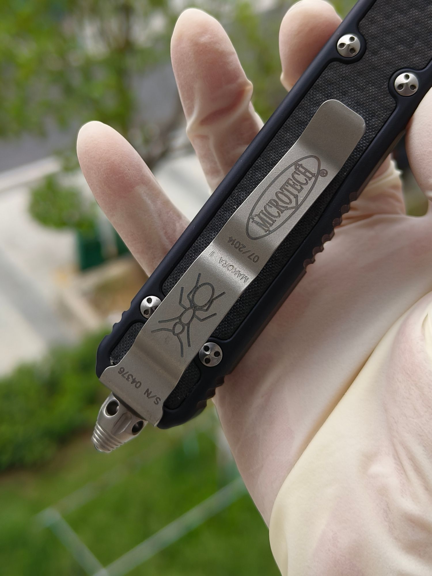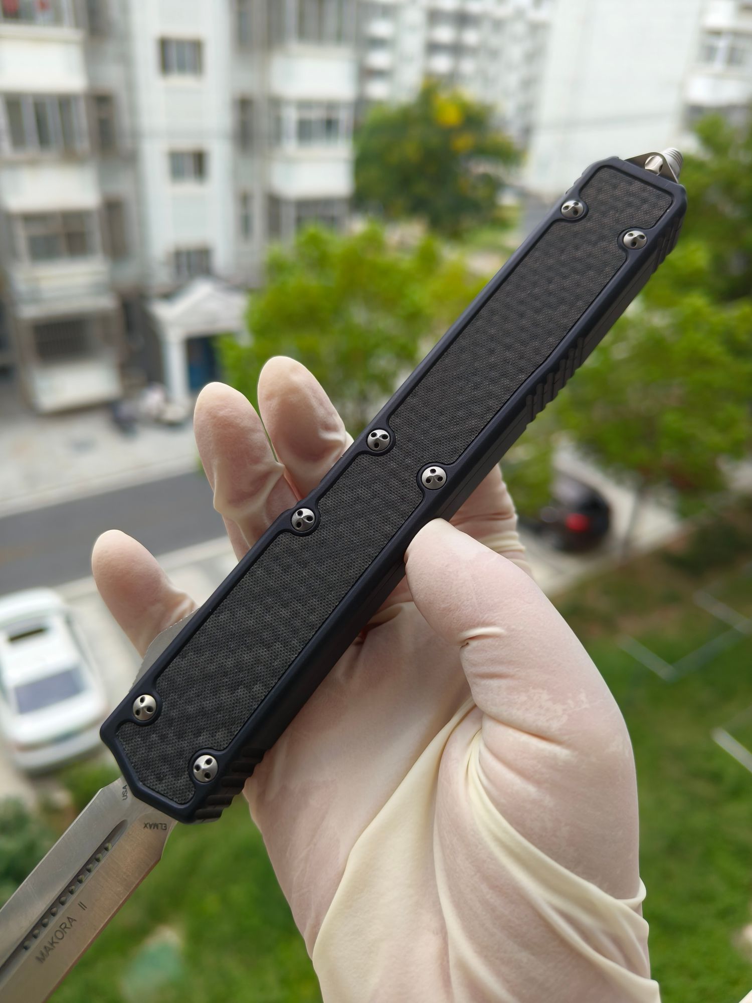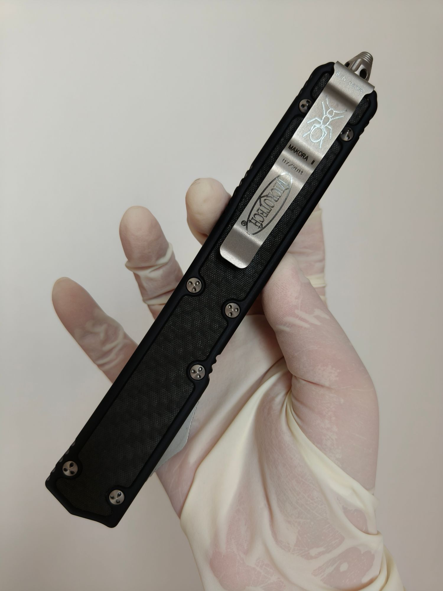 沿袭Ultratech的技术与概念,全新的Makora "圣蚂蚁" 汇集众多功能于一身;虽然拉长的握柄在外型较长,但不仅铝合金握柄轻量化整体重量,更进一步运用碳纤维材质减低重量。 Makora Ⅱ 石洗平刃弹簧刀采用ELMAX 粉末钢钢材,握柄尾端附有玻璃击破器与可左右对调的背夹适用于任何用刀习惯;阶梯式的开关钮设计同时针对手戴手套时仍可灵活且扎实地使用。