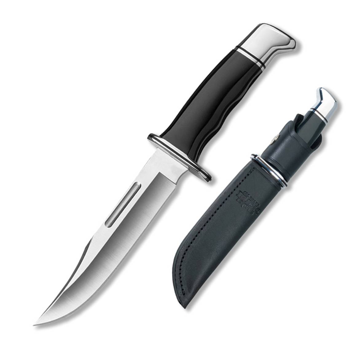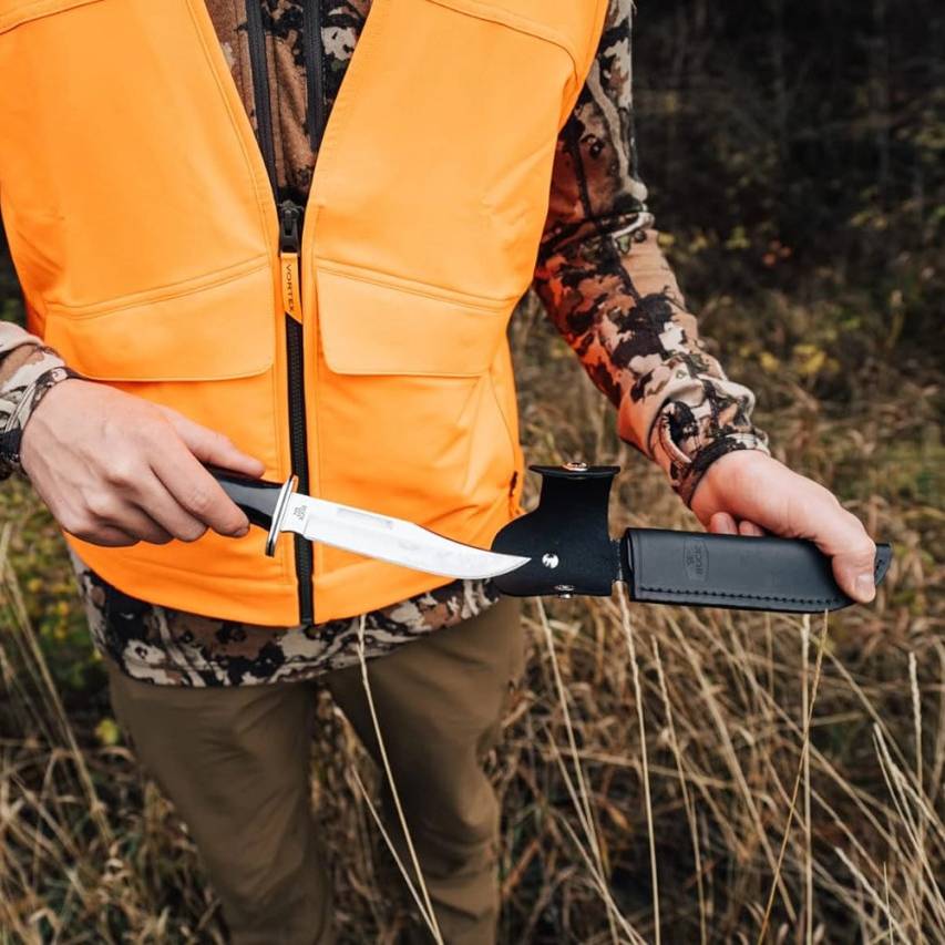Buck 119 Special 是 Buck Knives 系列 50 多年来的经典款式。Hoyt 和 Al Buck 过去在他们的二人小店里手工制作它们。如今,这款较大的猎刀配有 6.0 英寸的大刀片,非常适合在狭窄的地方进行精细工作、穿刺和切割,以增加控制力,并且像以往一样受欢迎。黑色酚醛树脂手柄配有抛光铝制柄头和护手。每把 Buck 119 Special 都配有坚固的黑色皮带护套。