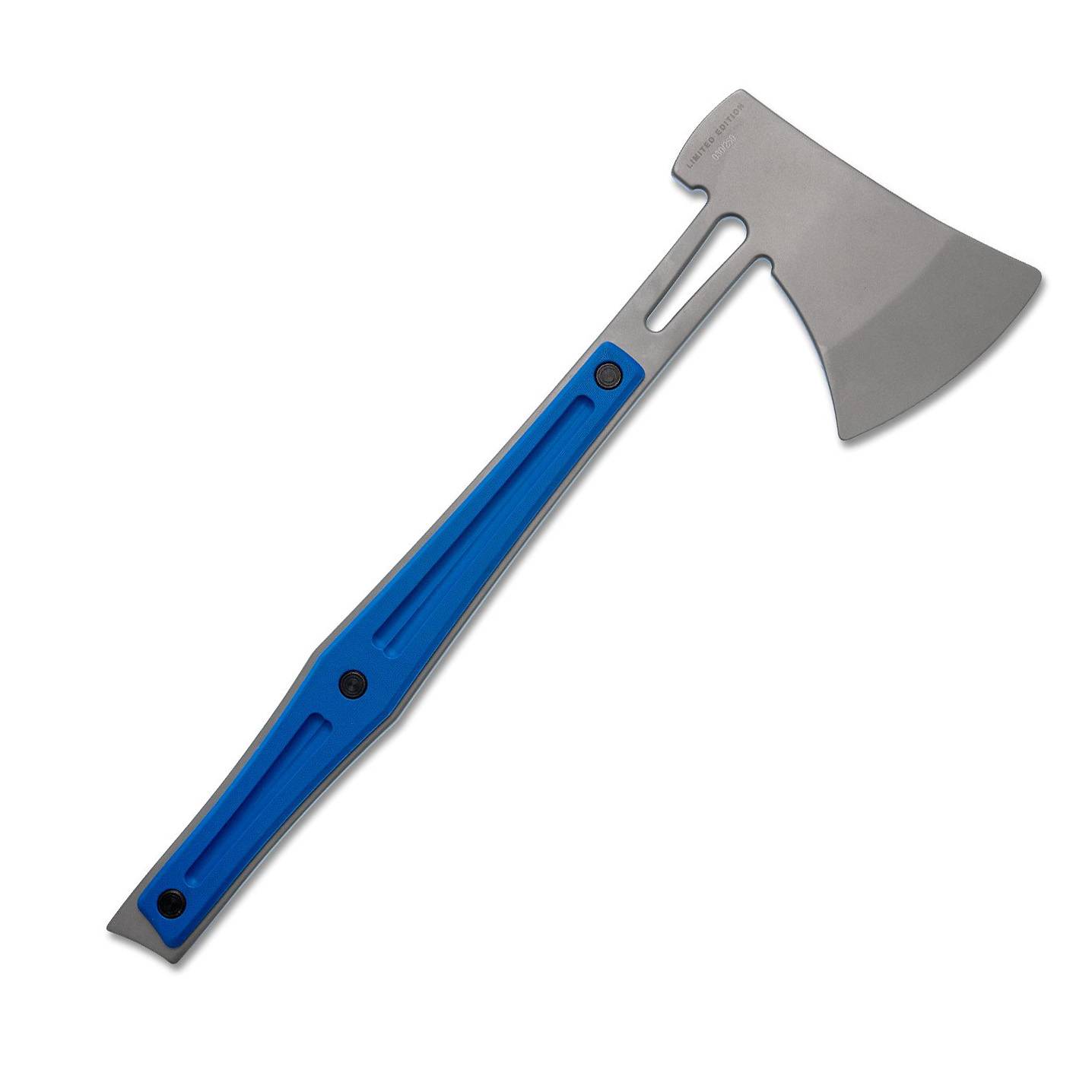 这款独特的定制飞斧是限量版,仅生产 250 把。这把 15 英寸的飞斧配有蓝色纹理 G10 手柄和 420HC 不锈钢喷砂刀片。附带一个皮革护套,方便安全轻松携带。