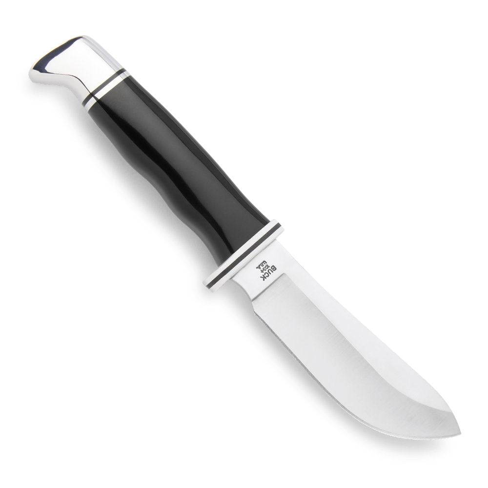这把猎刀的刀柄是黑色酚醛树脂,配有铝制刀柄/护手。