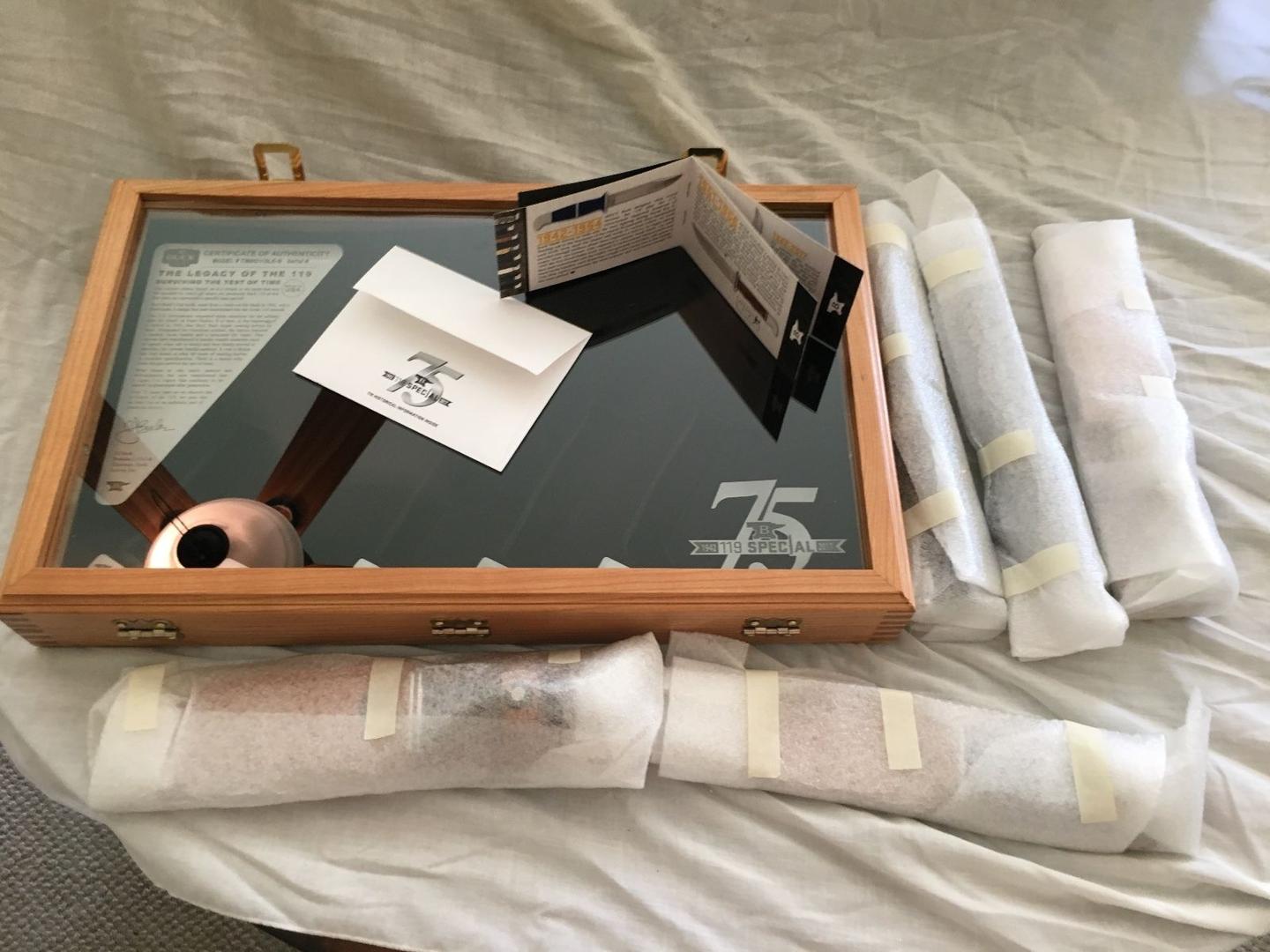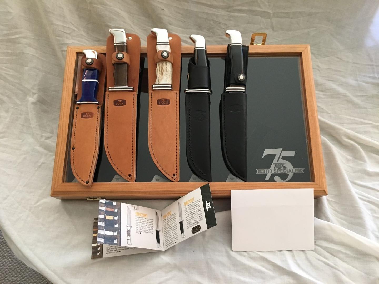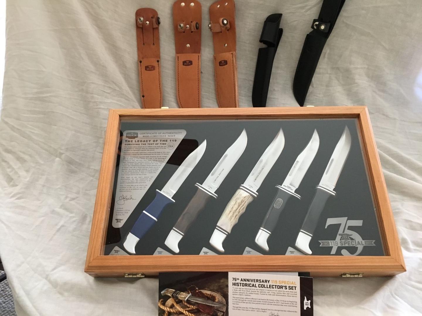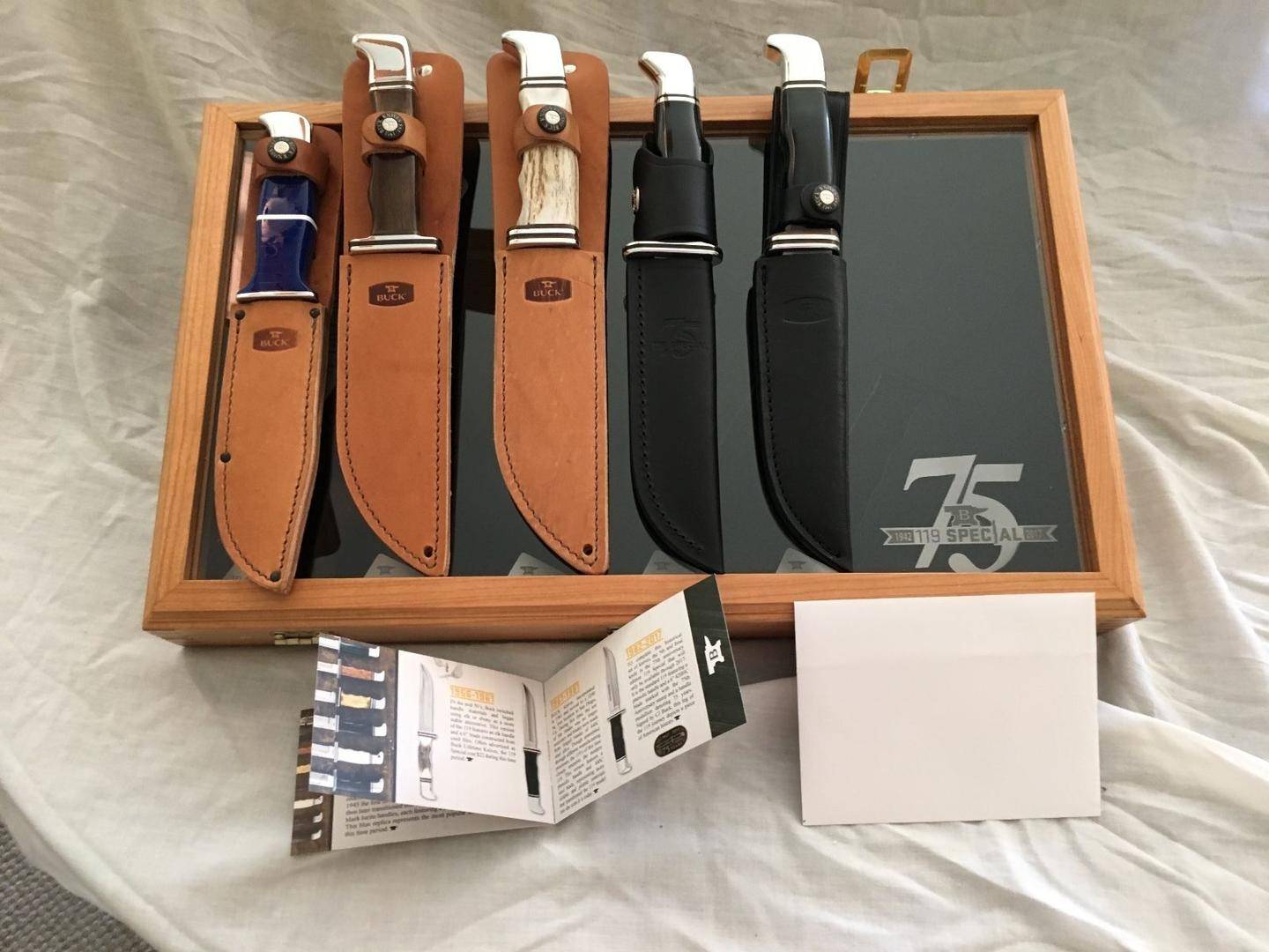 为了完成这套具有历史意义的刀具,第五把也是最后一把刀是 75 周年纪念版 119 Special,仅在 2017 年才有售。它是标准的 119,具有酚醛树脂手柄和 6 英寸 420HC 刀片,带有 75 周年纪念印章和代表 75 年的手柄徽章。由 CJ Buck 签名,119 旅程的这一部分描绘了一段美国历史。