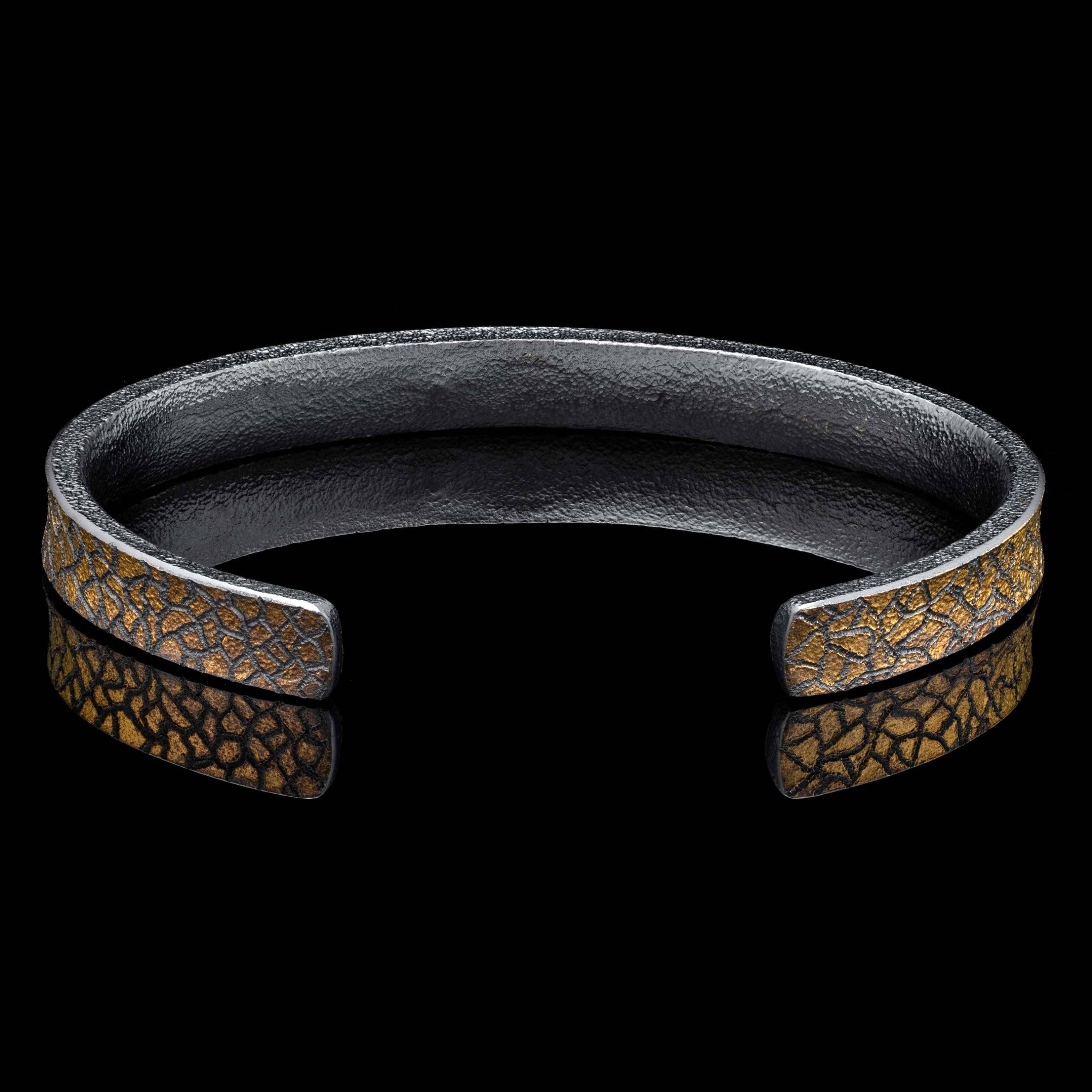 这款窄袖口手镯以古铜色纯银精心打造而成,彰显个性的深度。其表面采用古老的粘合技术 Keum-Boo 和手工雕刻细节装饰 23.5k 金,彰显了古代与现代设计的巧妙融合。