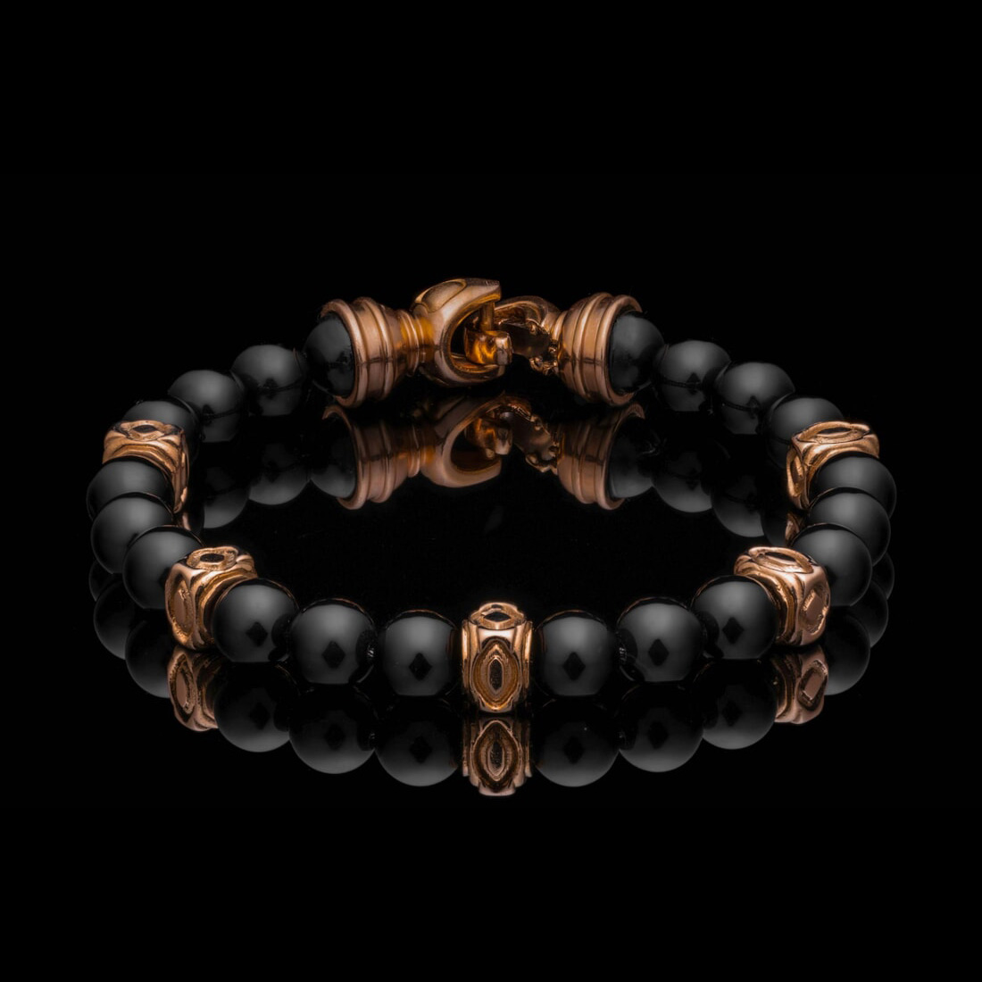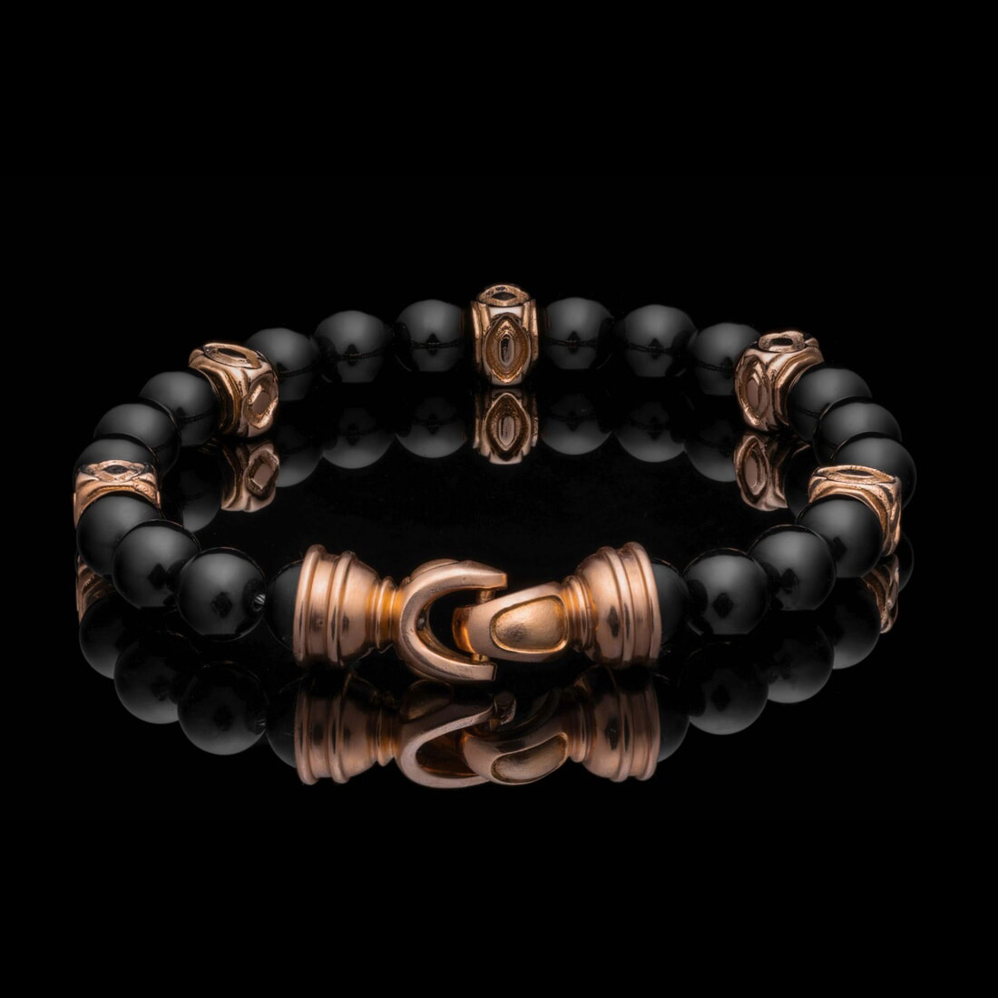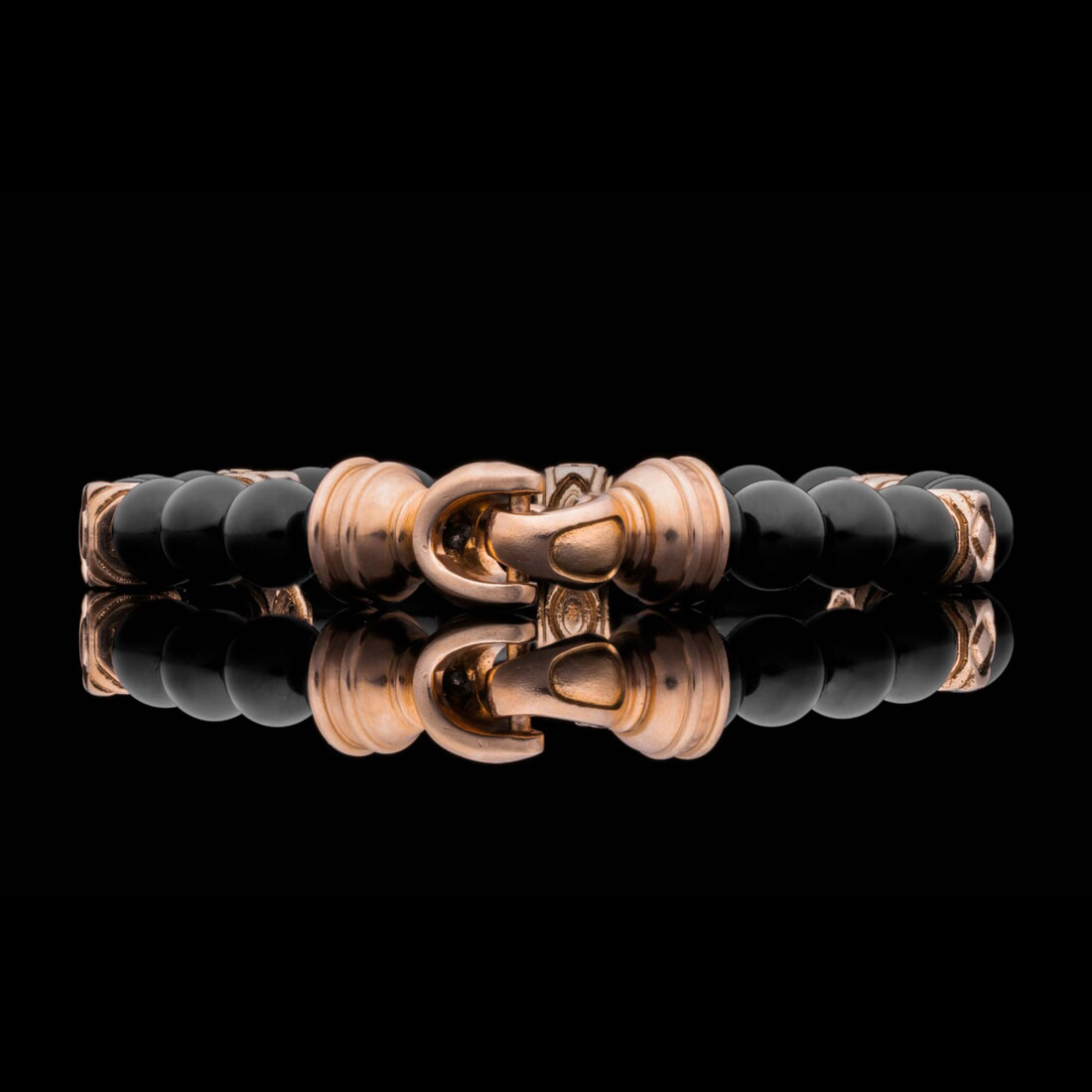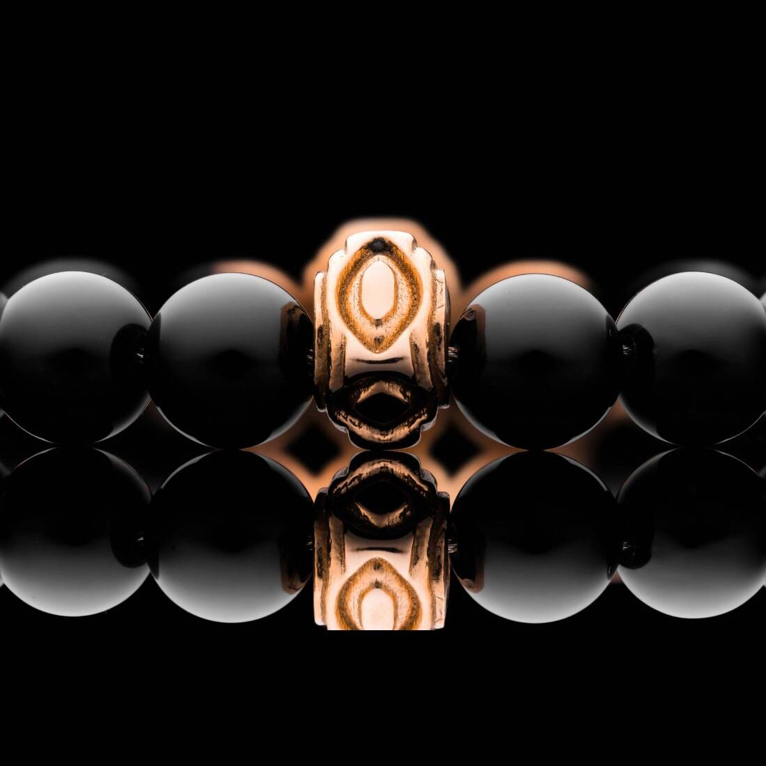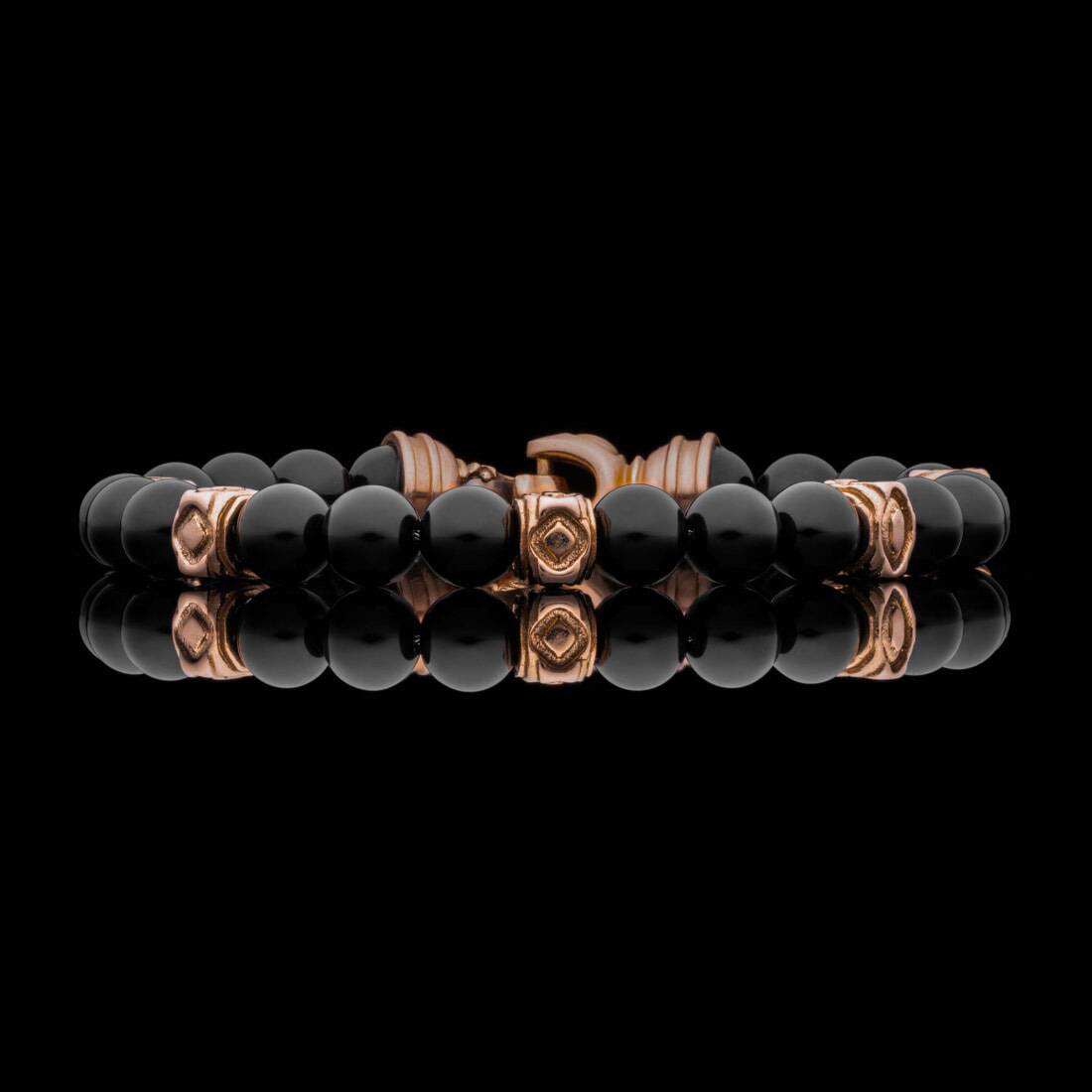 尽情享受我们“Copan”串珠手链的光芒。这款手链的灵感来自玛雅装饰复兴建筑,采用黑色玛瑙珠子,两侧是光泽的 18k 玫瑰金端盖和受阿兹特克和玛雅几何启发的焦点珠子。这款手链散发着奢华气息,向永恒的传统和现代设计致敬,邀请您用重新构想的历史来装饰自己。
