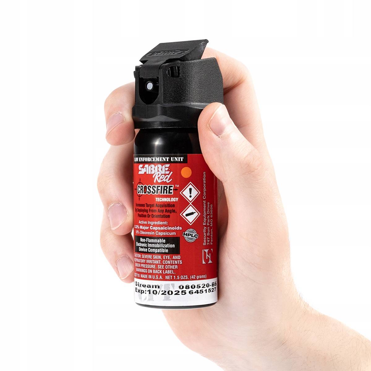 1.33%辣椒素含量(Sabre Red,最高辣度等级),紫外线示踪剂。1.5盎司(44毫升),可提供10次每次1秒的点射,射程4.6-6米。独家HPLC实验室验证。交叉火力全角度喷射技术。5年保质期。眼睛,皮肤和吸入测试支持。目标确认,紫外标记(UV)染料。非易燃/ EID兼容。高温暴露试验。低温接触试验。出厂前的试验。PSI的精度检验,出厂前。出厂前防渗漏试验。ISO 9001-2008质量保证体系认证 加拿大卫生署认证 对人体无持续伤害。使用温度-29-50摄氏度
