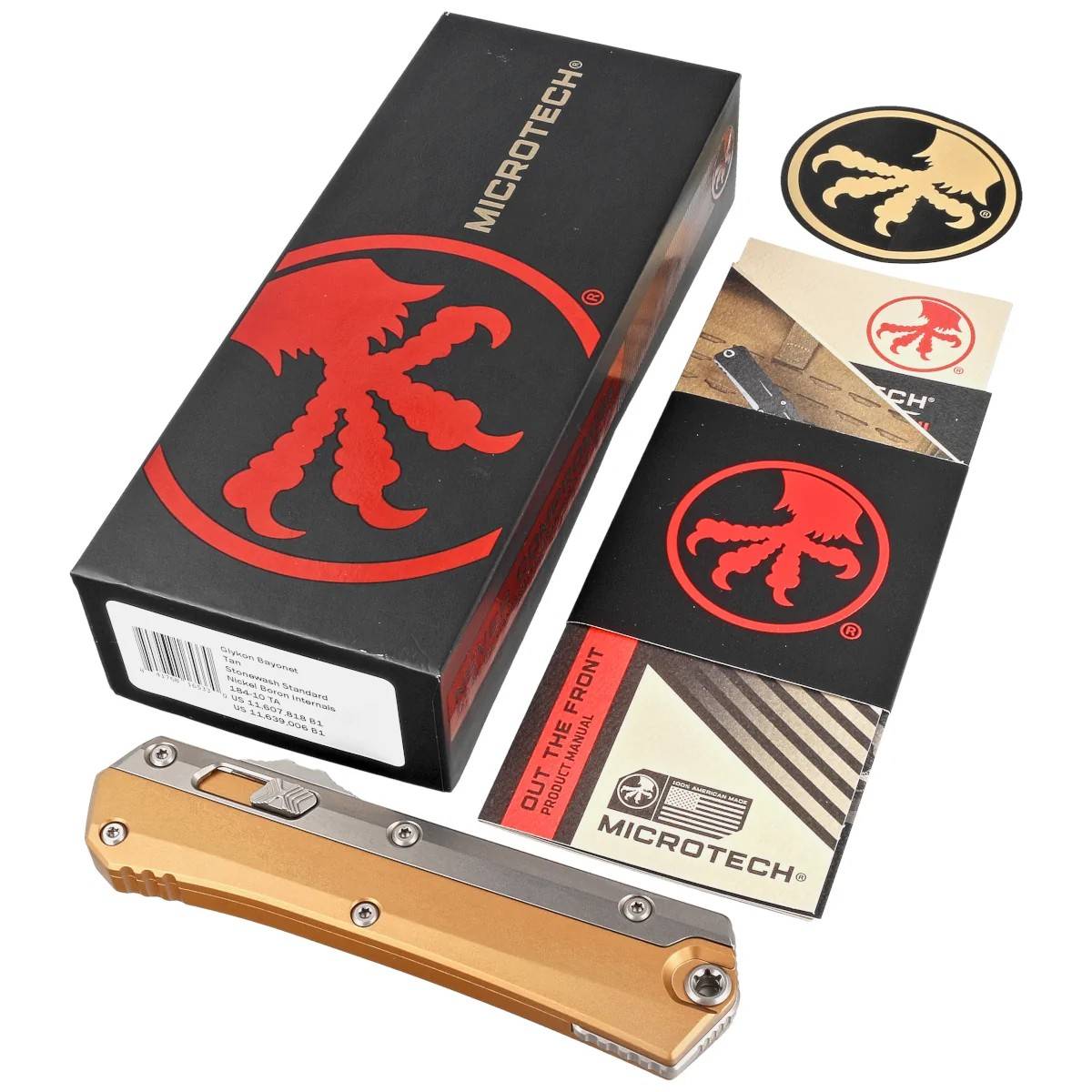 Glykon Bayonet 棕褐色铝/钛,石洗,是 Glykon 系列的一款大型 OTF(Out The Front)自动刀。这是第一款带有三向按钮的 OTF 自动刀,可实现完全的双手操作,它具有超快的机制,可伸出锋利的刀片。100% 在美国制造和组装。由 Microtech Knives 的 Anthony 和 Sean Marfione 设计。