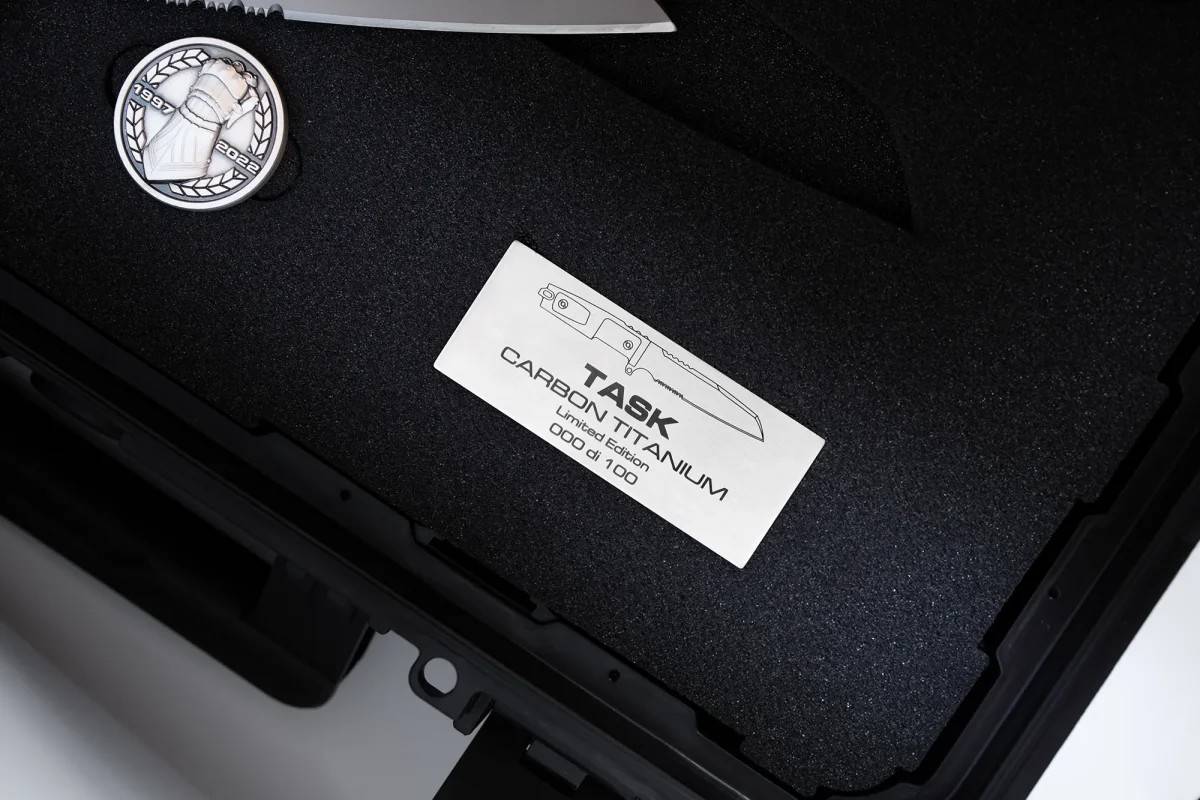 该系列限量生产 100 件,灵感来自著名的 Task 型号,这是 Extrema Ratio 制造的最具代表性的多用途刀具之一。与其灵感来源的型号不同,此版本采用全钛结构。