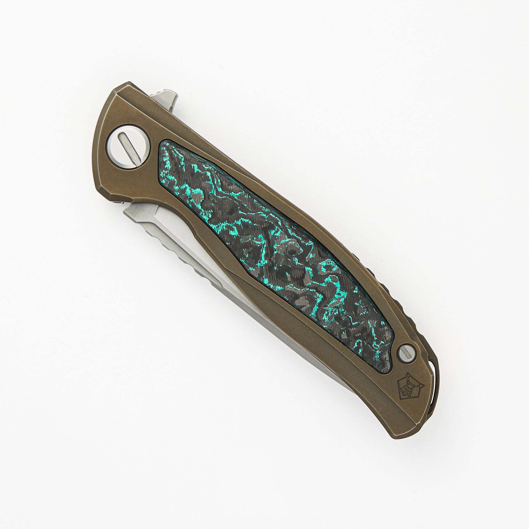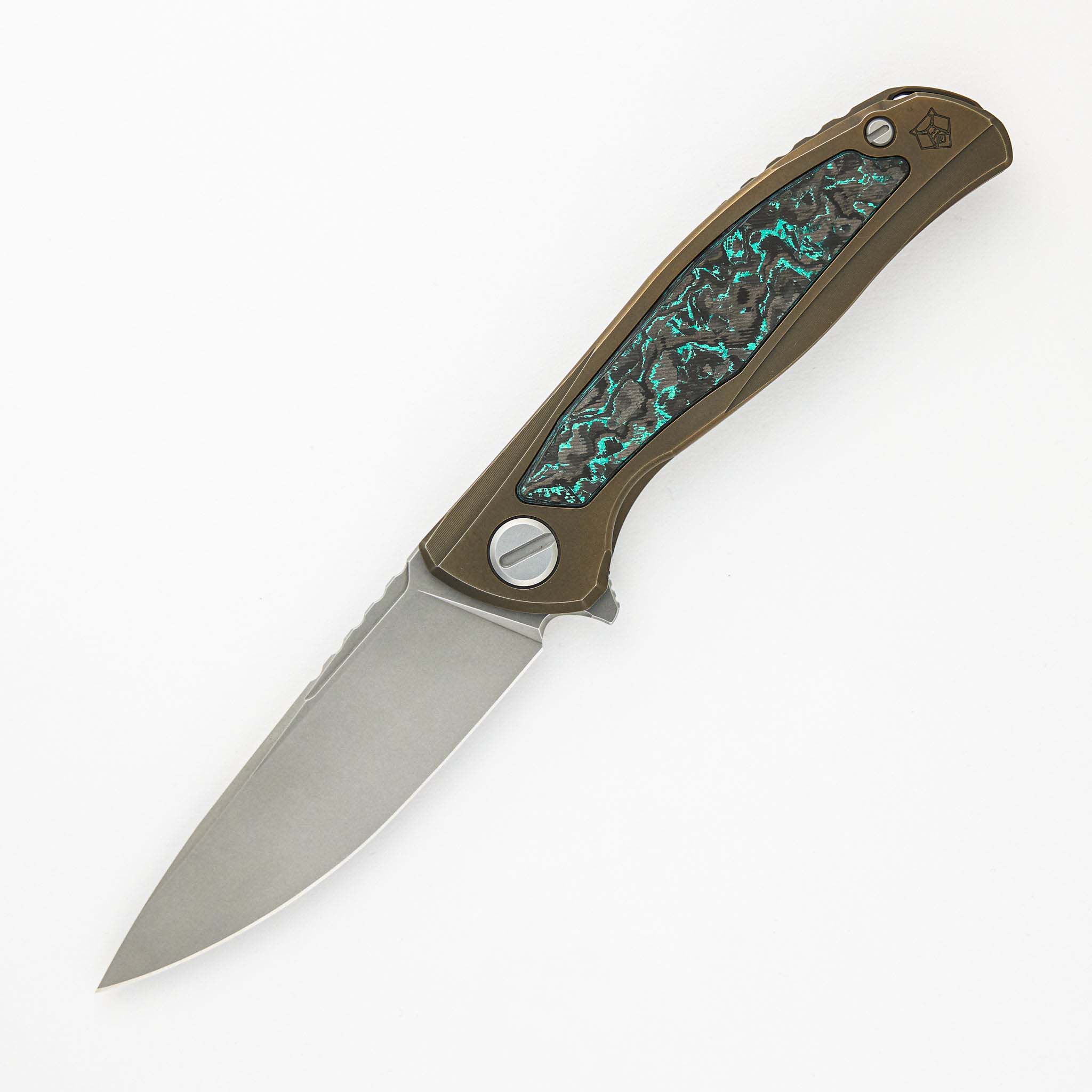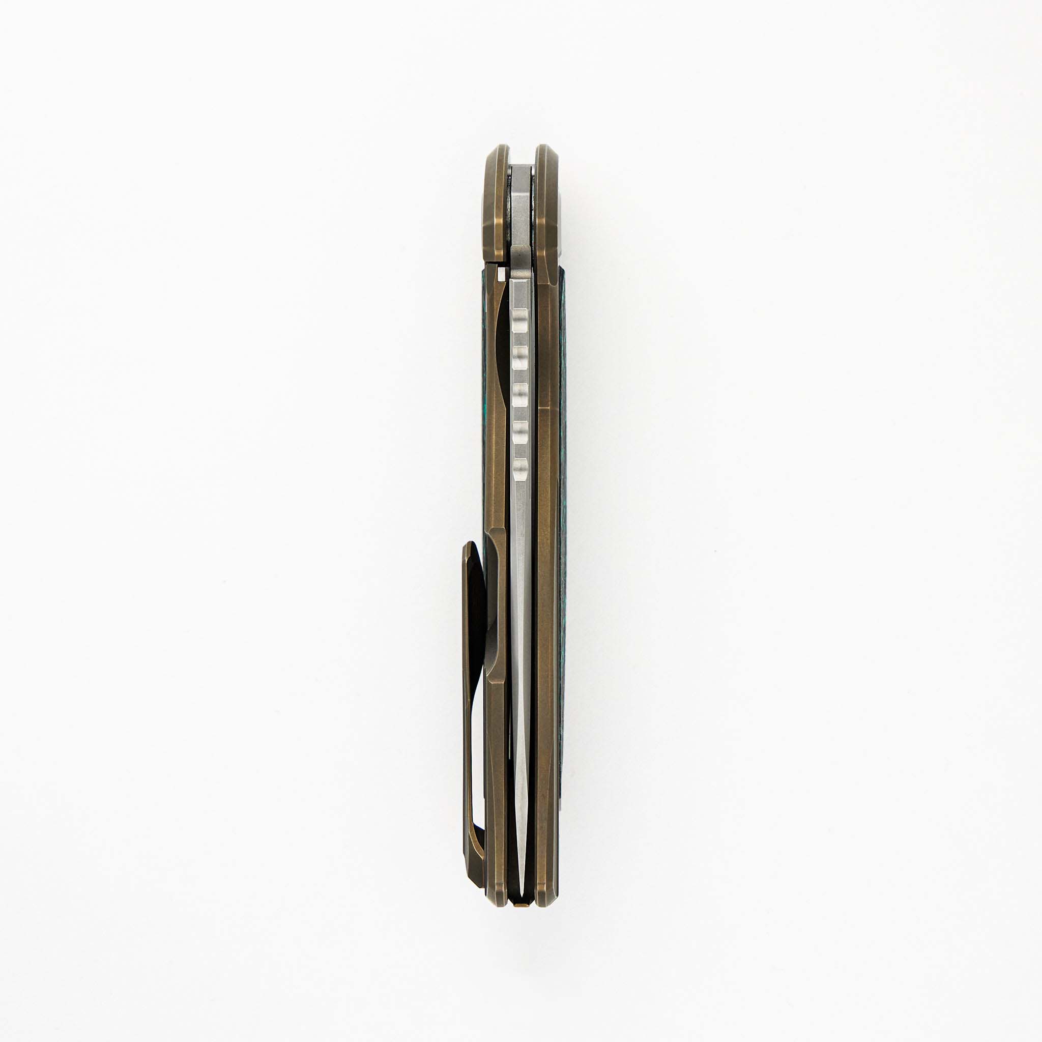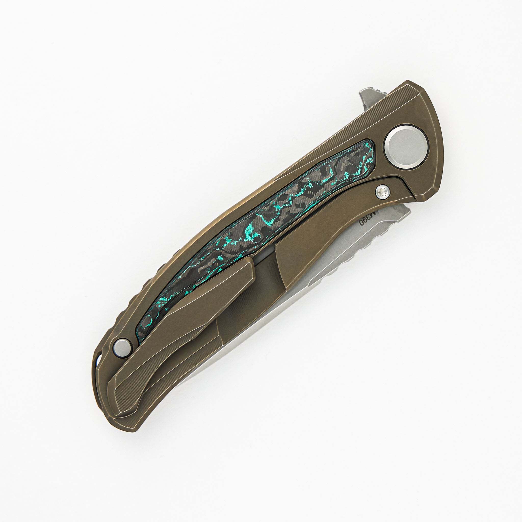 3.75 英寸石洗 M390 刀片,脊部有锯齿状花纹,刀刃为 4.00 英寸 总长度 8.75 英寸 重量 4.4 盎司 采用 MRBS(多列轴承系统)运行 石洗钢五金件和枢轴螺丝 石洗/青铜阳极氧化钛框架锁手柄刻度...