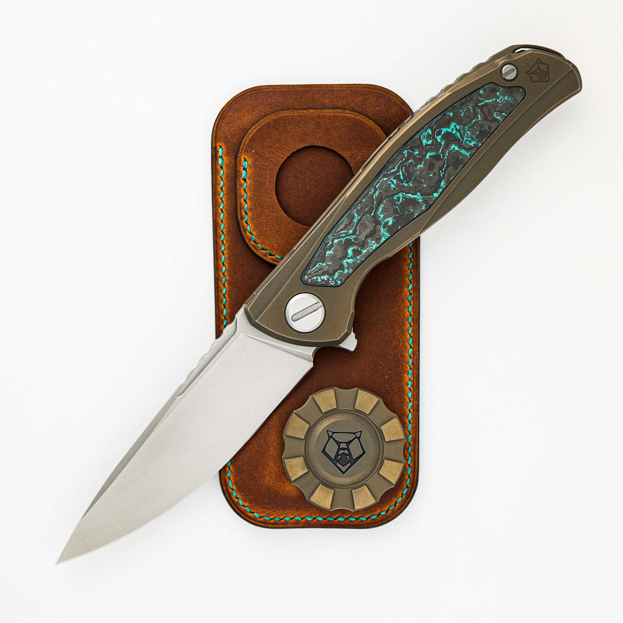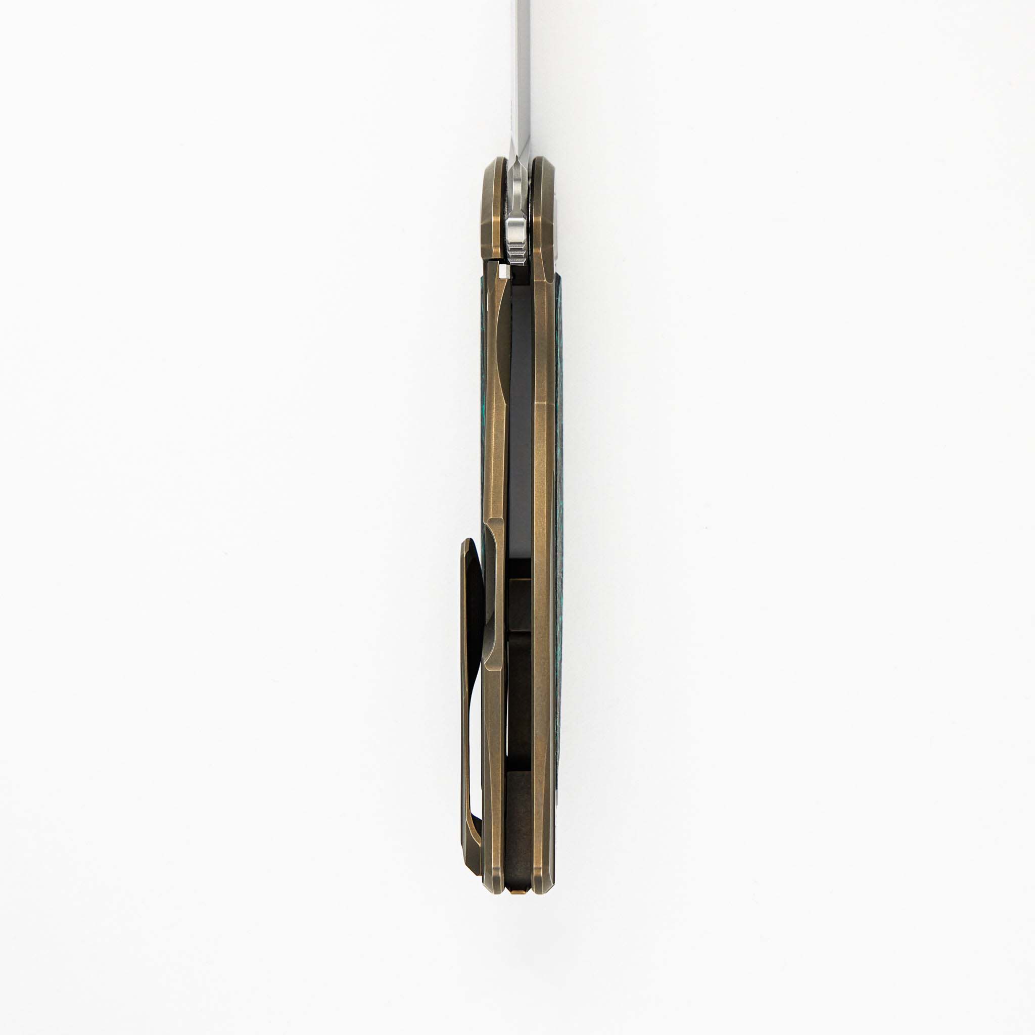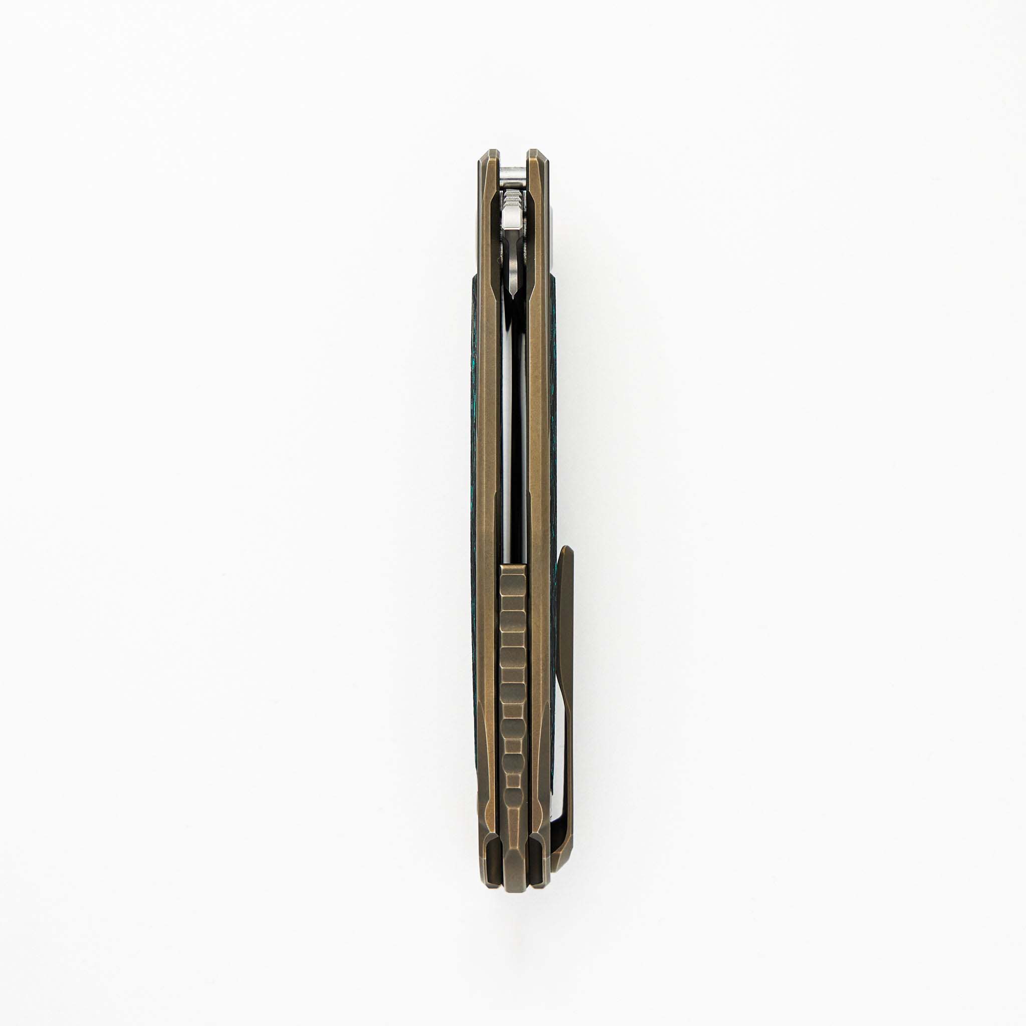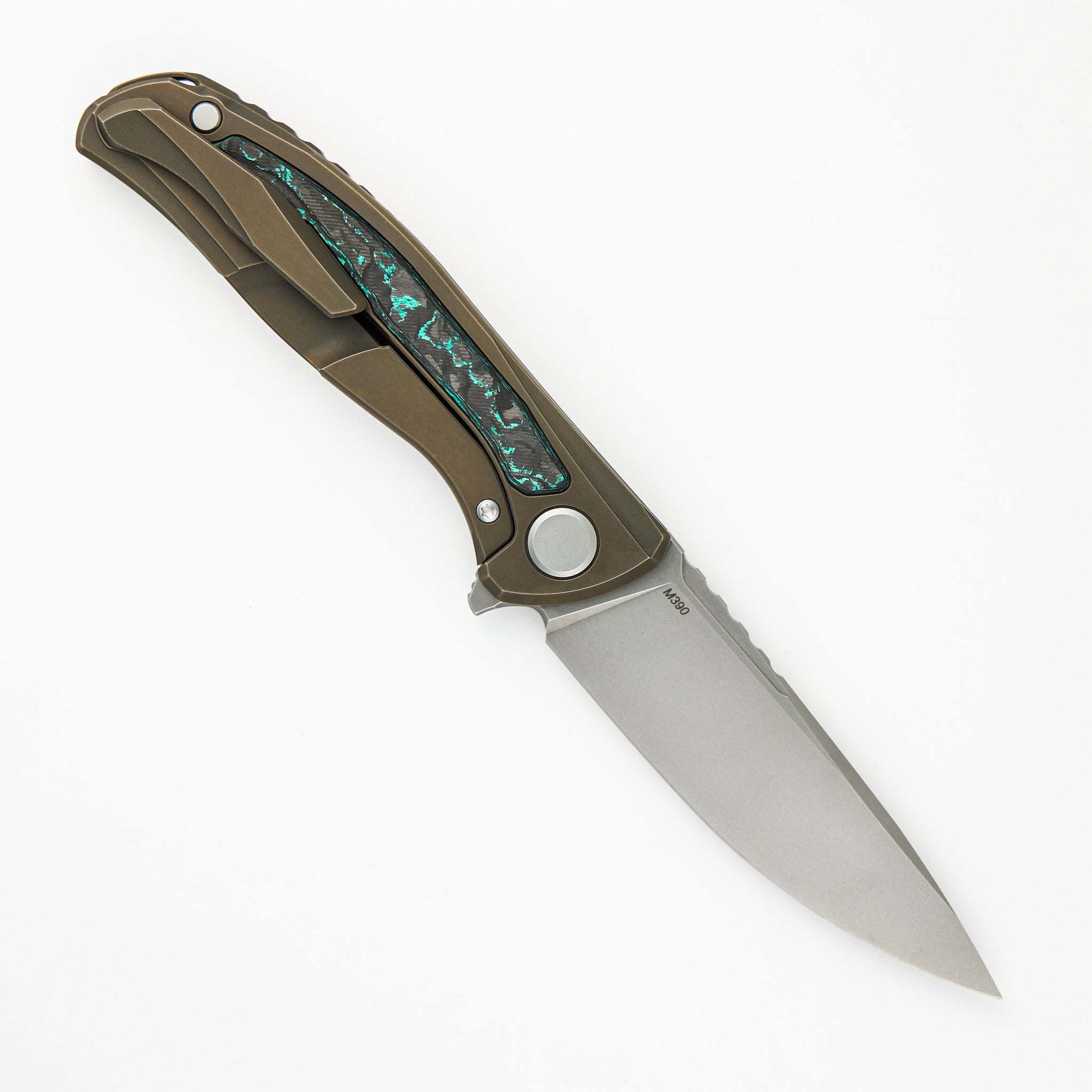 3.75 英寸石洗 M390 刀片,脊部有锯齿状花纹,刀刃为 4.00 英寸 总长度 8.75 英寸 重量 4.4 盎司 采用 MRBS(多列轴承系统)运行 石洗钢五金件和枢轴螺丝 石洗/青铜阳极氧化钛框架锁手柄刻度...
