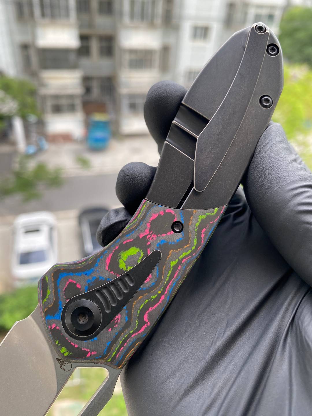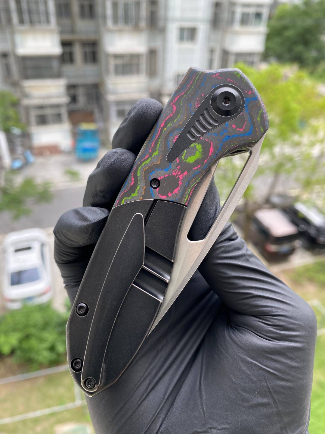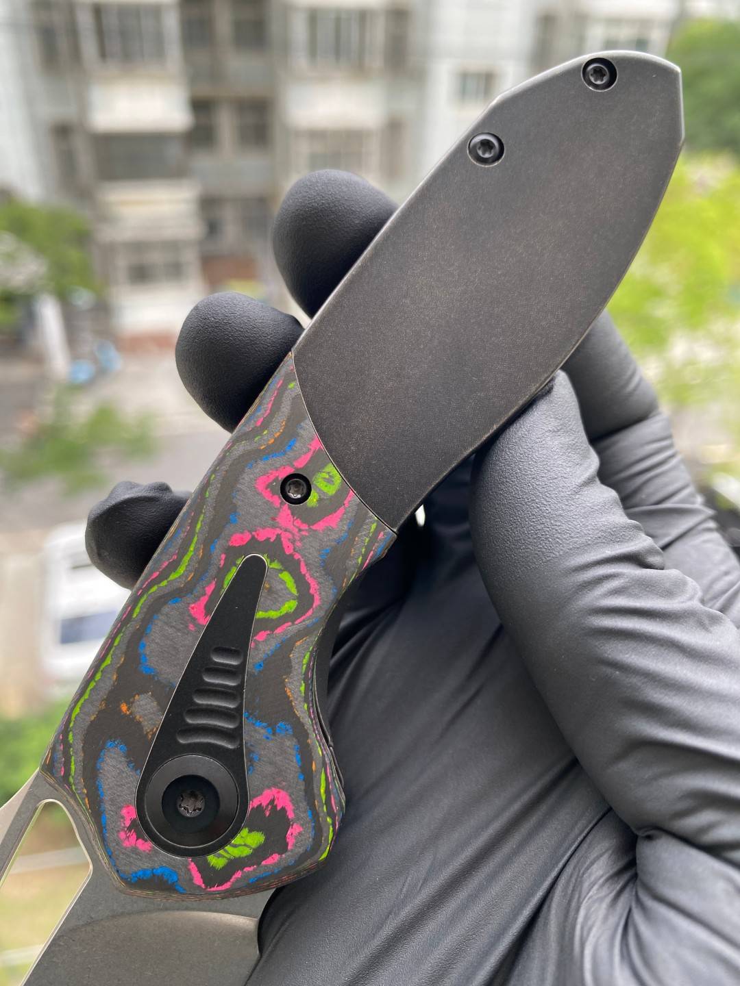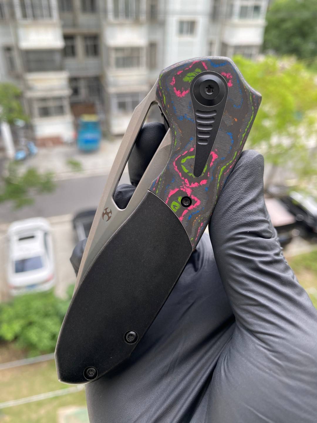 -手柄采用双材料结构,将钛与碳纤维或 Timascus 镶嵌物无缝结合。这种材料组合增强了刀的美感和触觉体验,为其设计增添了一丝优雅和精致。