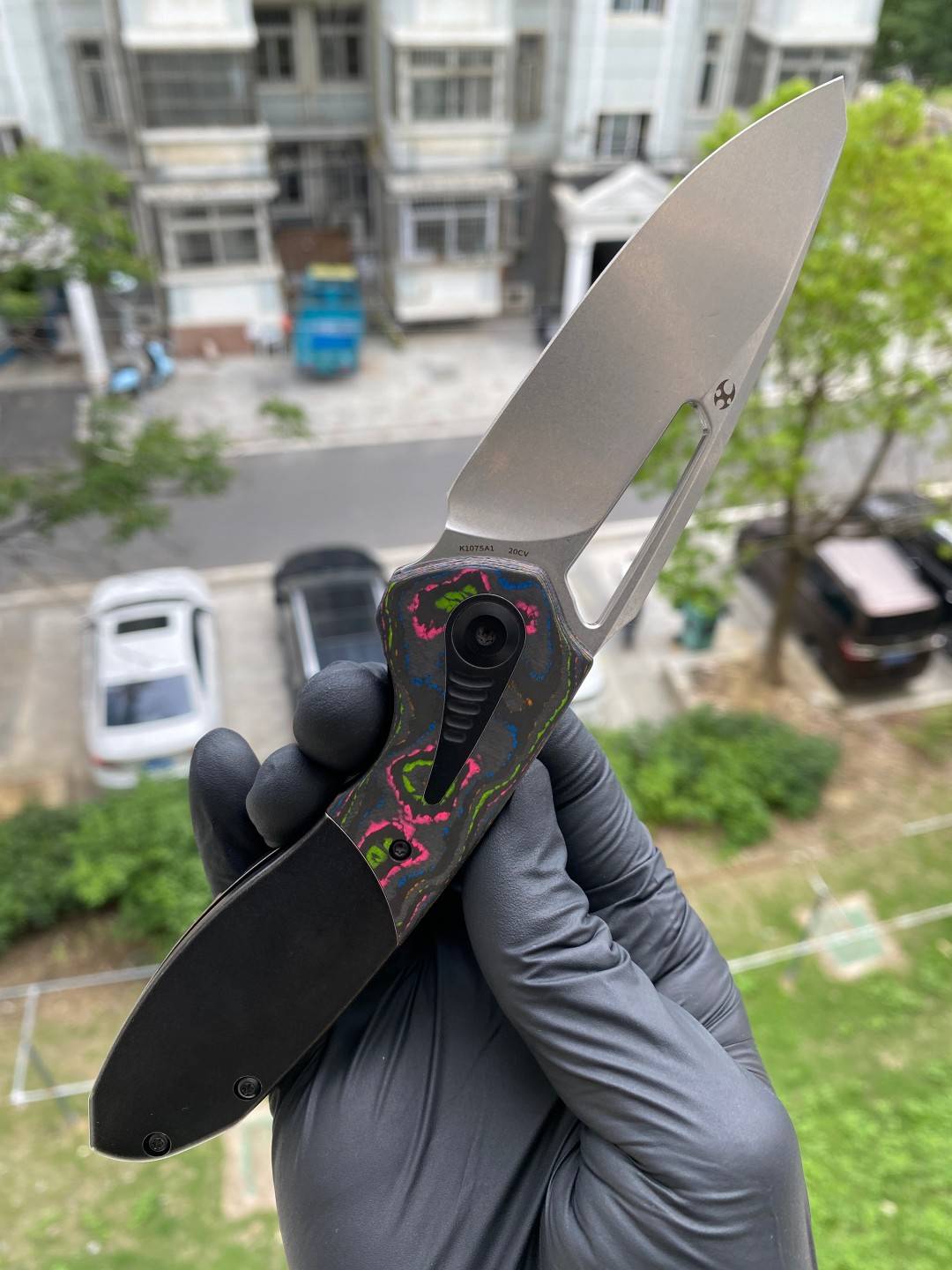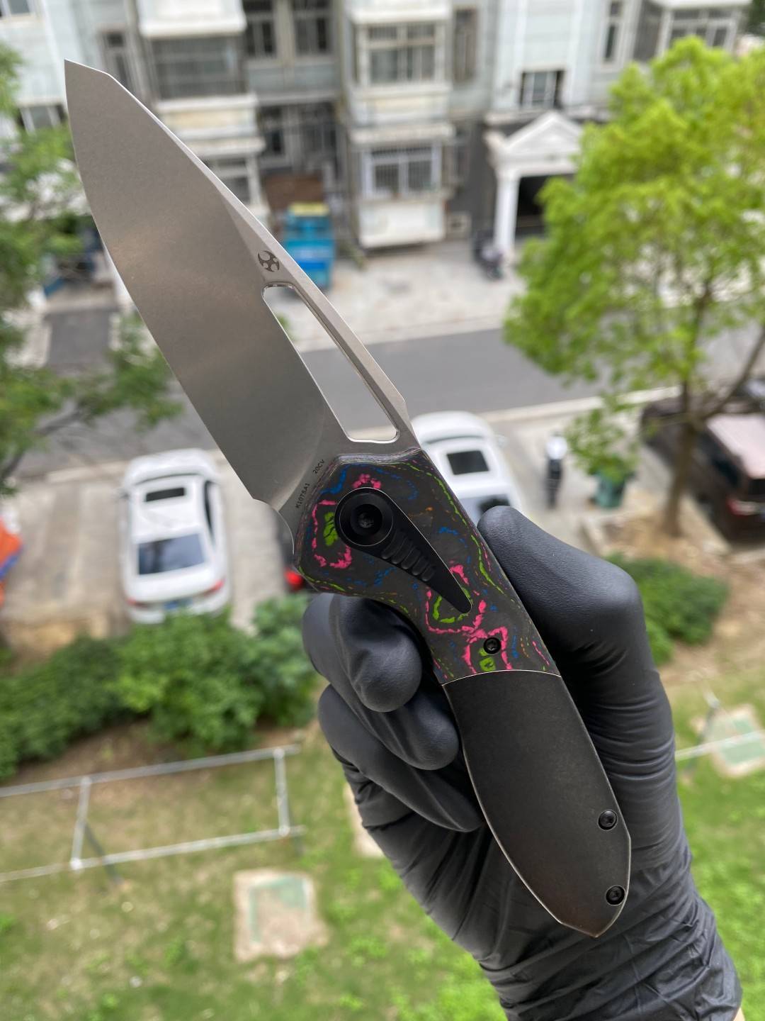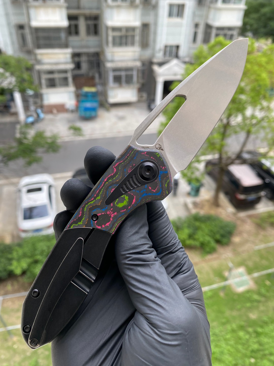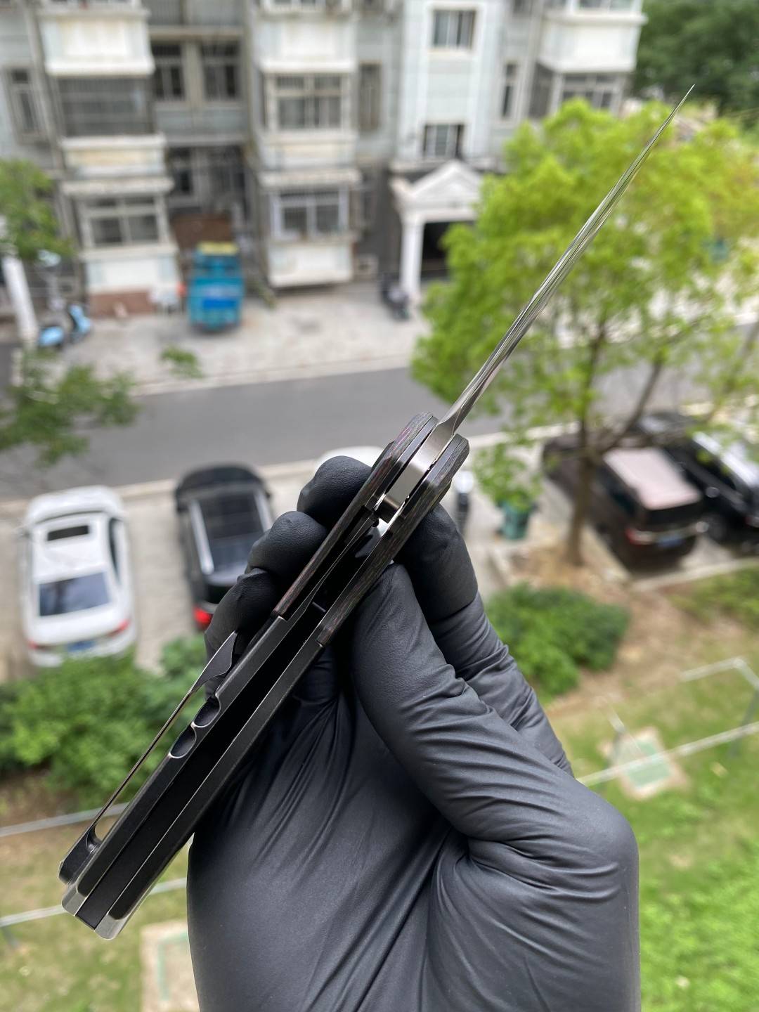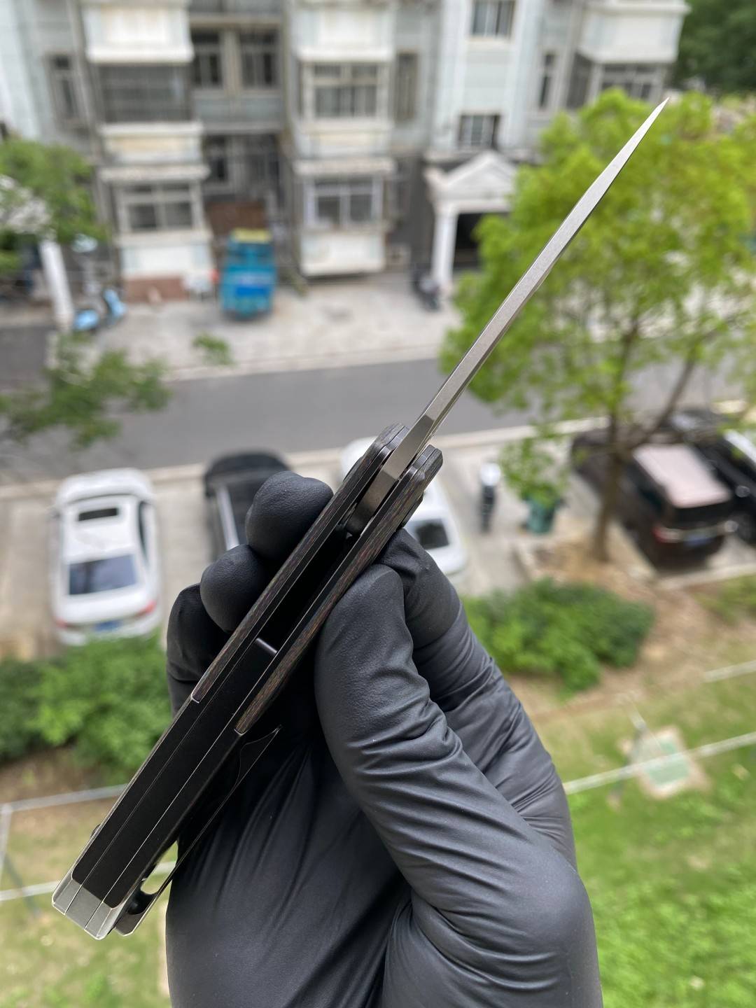 -手柄采用双材料结构,将钛与碳纤维或 Timascus 镶嵌物无缝结合。这种材料组合增强了刀的美感和触觉体验,为其设计增添了一丝优雅和精致。