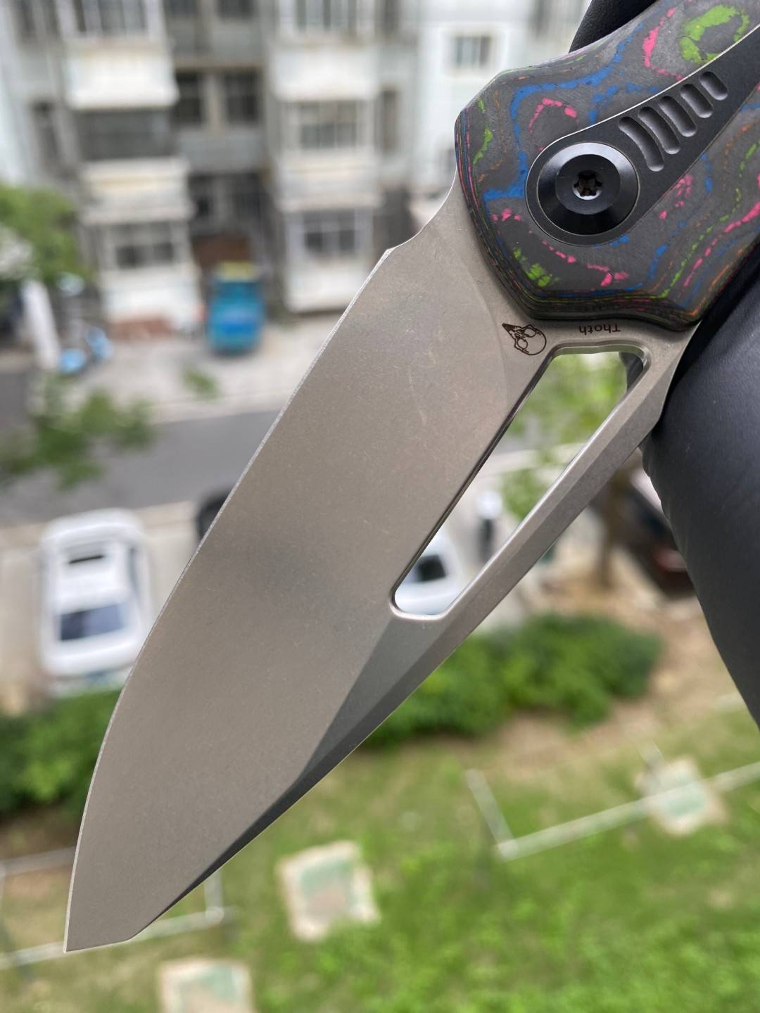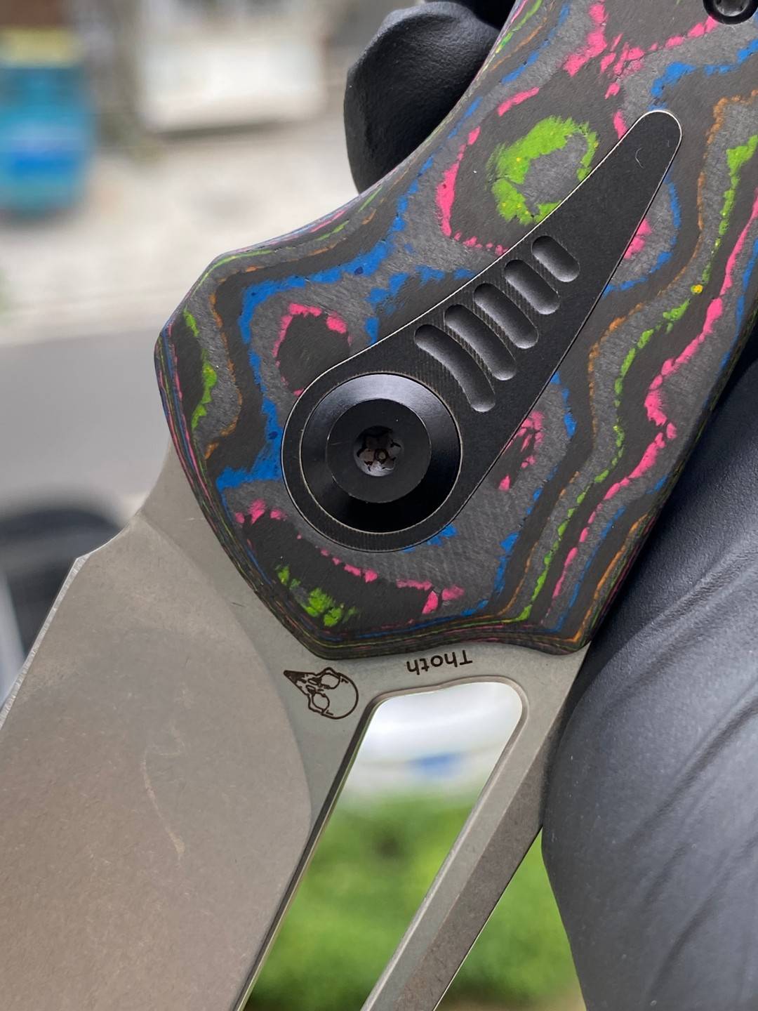 -Thoth 采用改良的 Wharncliffe 刀片,体现了精准性和功能性。这款刀片采用优质 CPM 20CV 钢或高品质大马士革钢制成,确保出色的耐用性和边缘保持性。凹磨表面增强了其切片能力,提供干净、轻松的切割。
