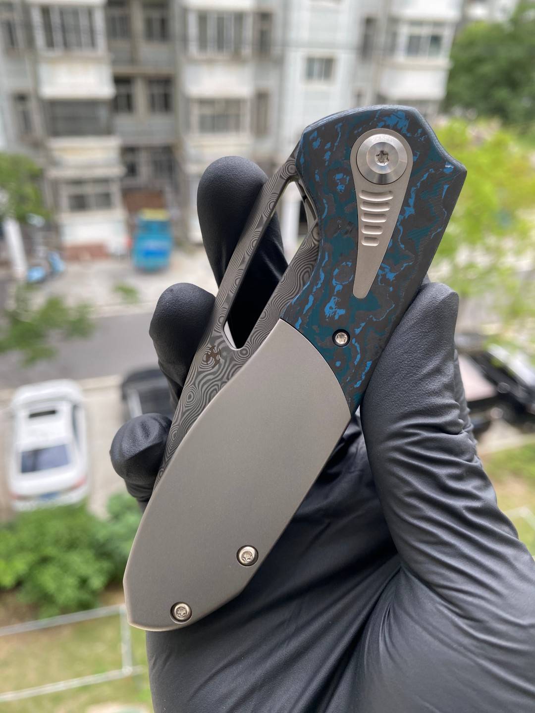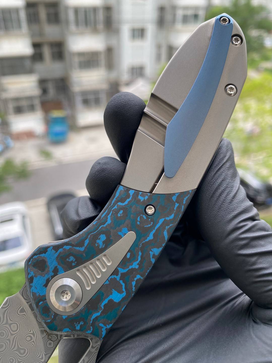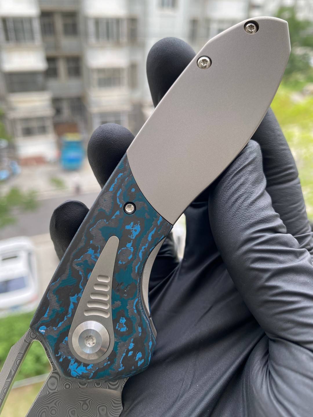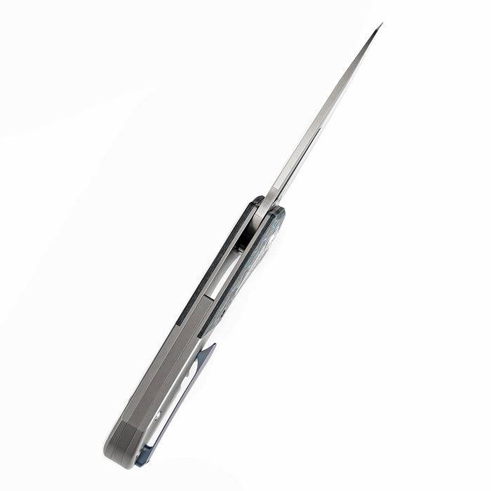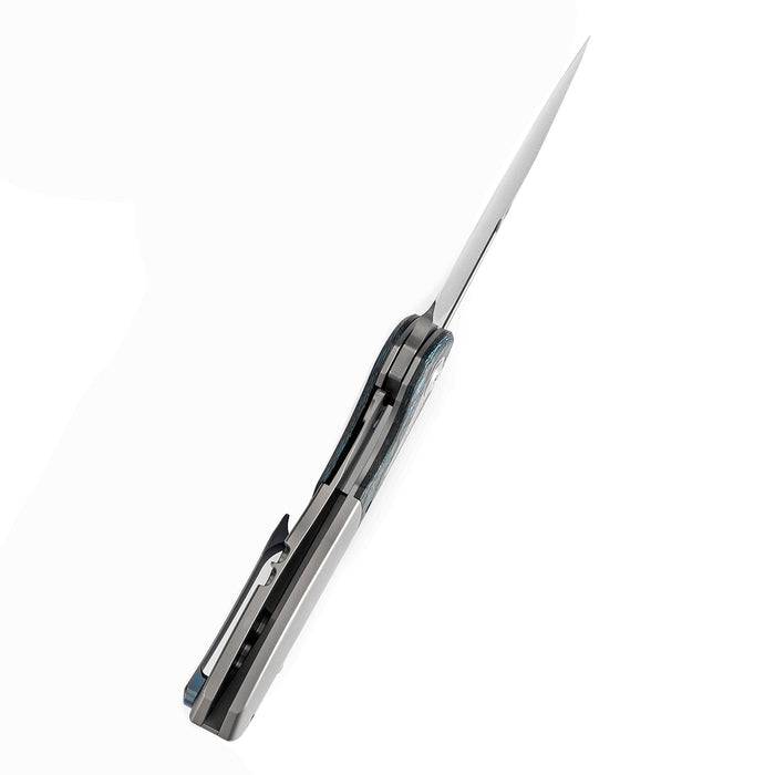 -手柄采用双材料结构,将钛与碳纤维或 Timascus 镶嵌物无缝结合。这种材料组合增强了刀的美感和触觉体验,为其设计增添了一丝优雅和精致。