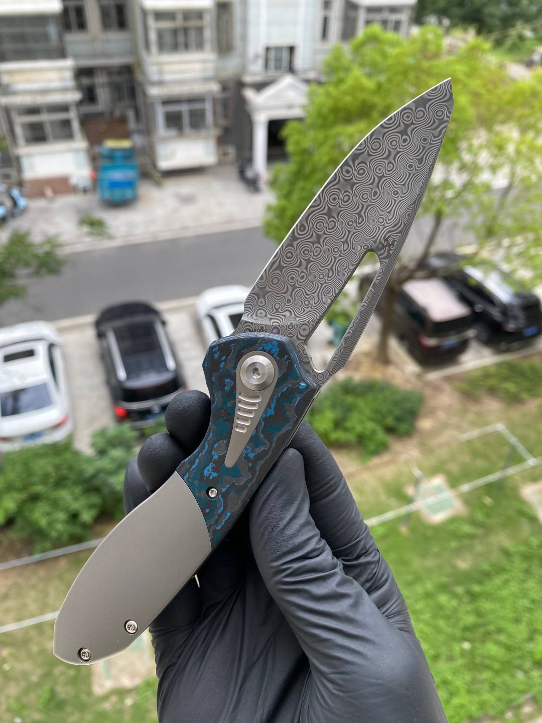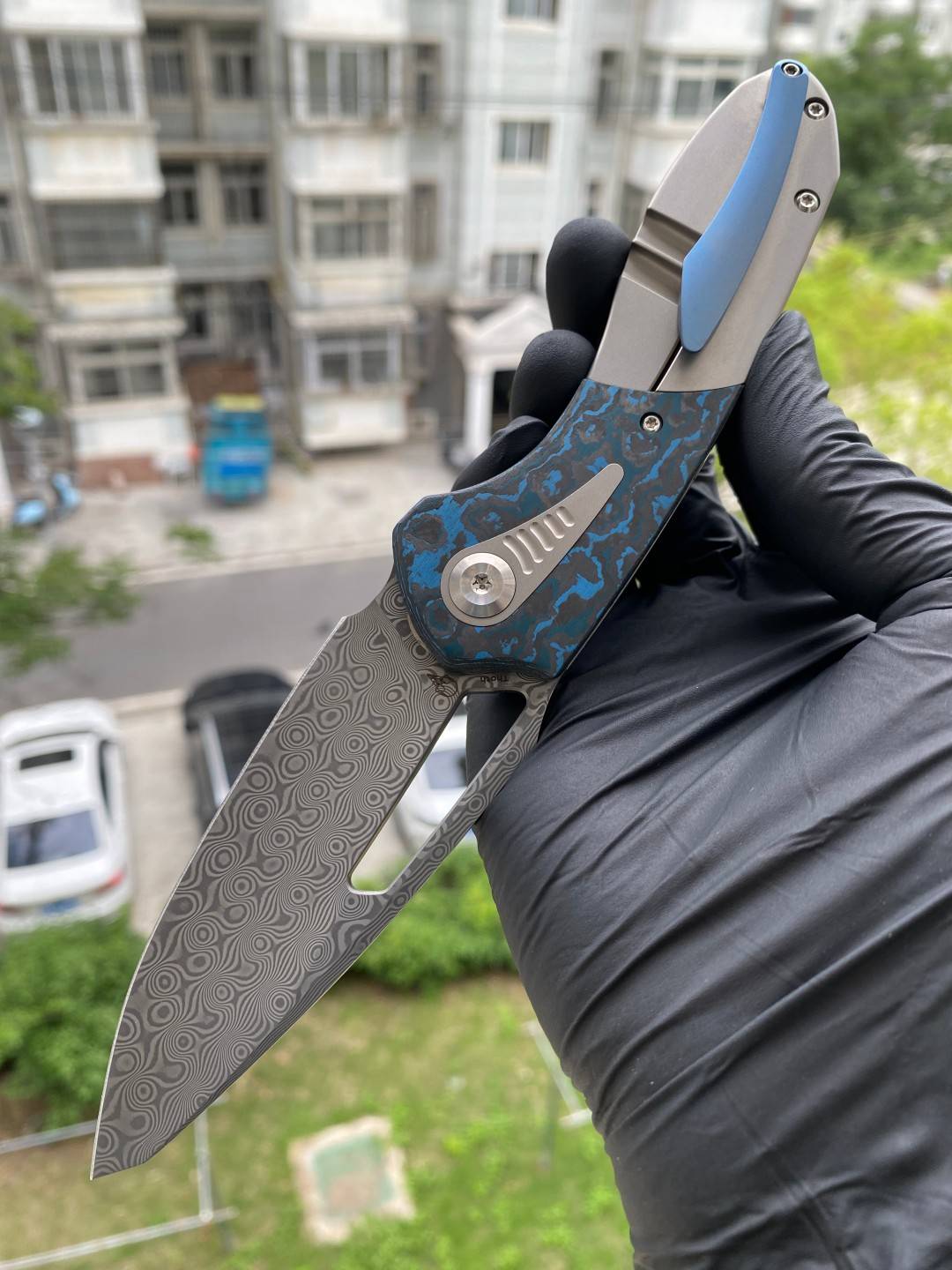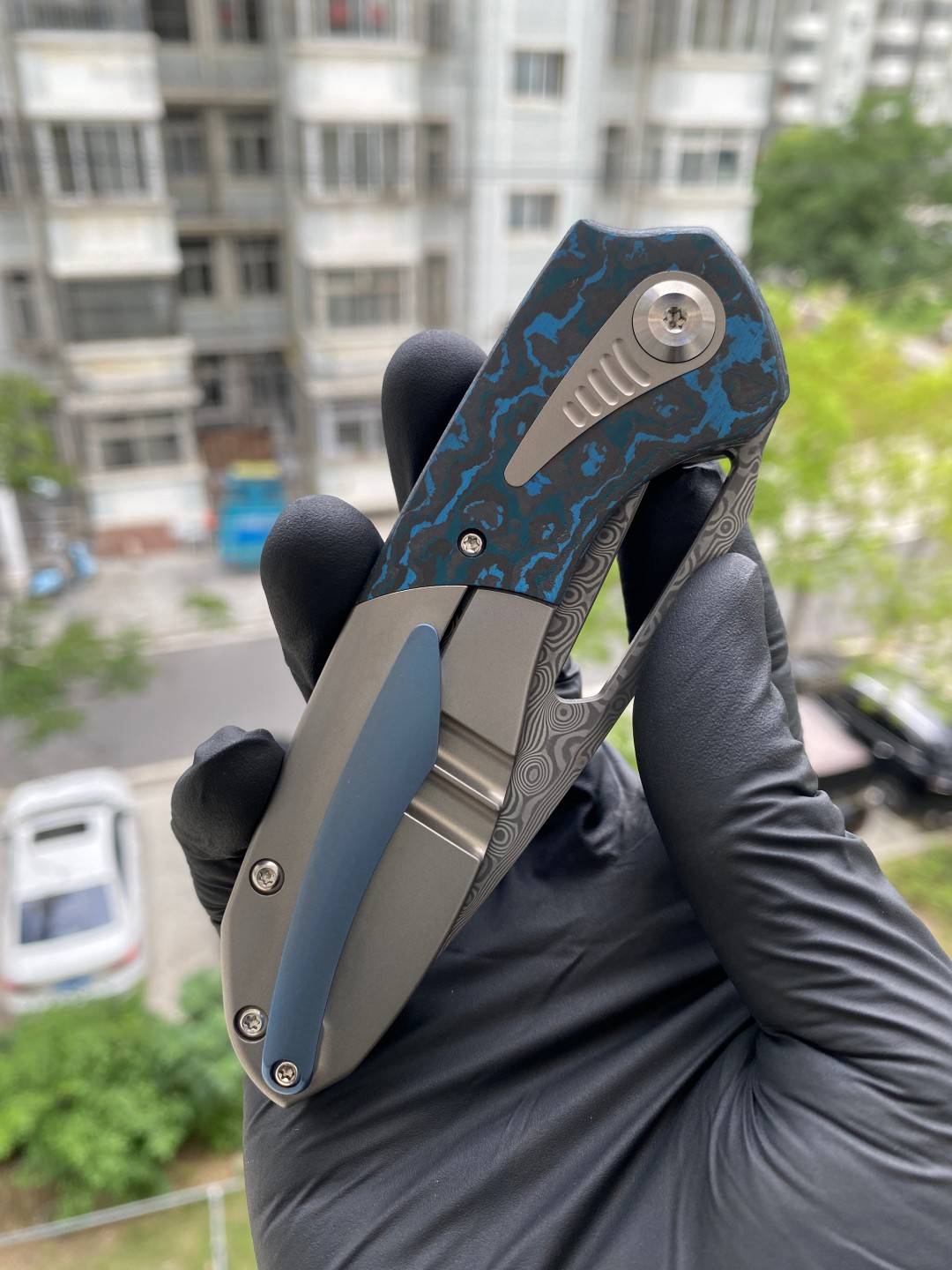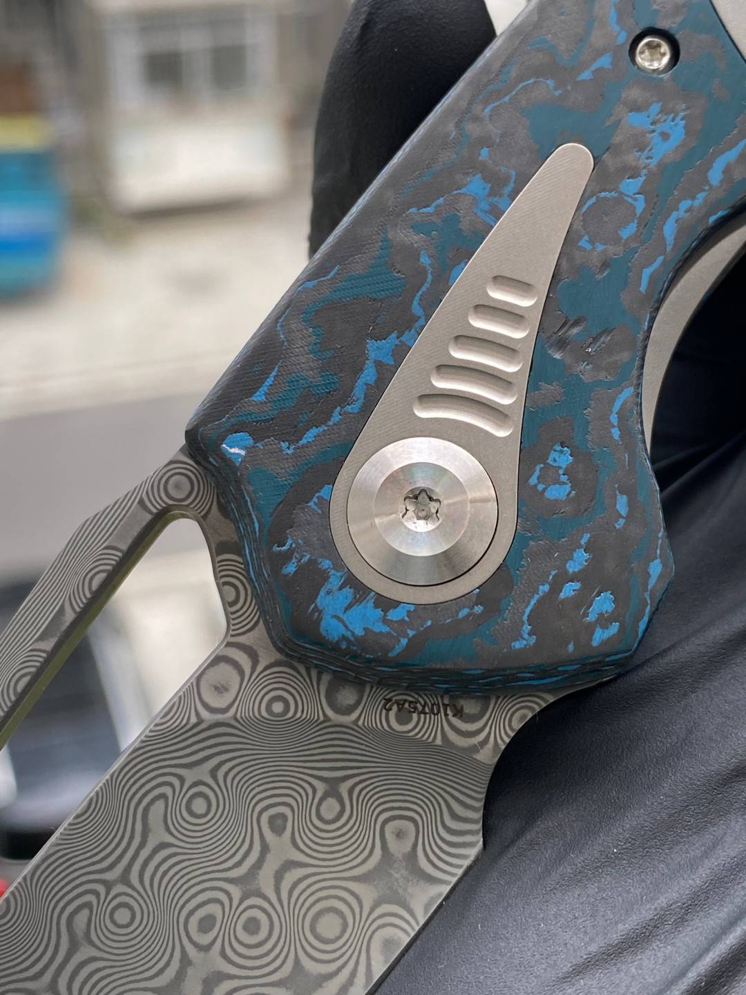-手柄采用双材料结构,将钛与碳纤维或 Timascus 镶嵌物无缝结合。这种材料组合增强了刀的美感和触觉体验,为其设计增添了一丝优雅和精致。