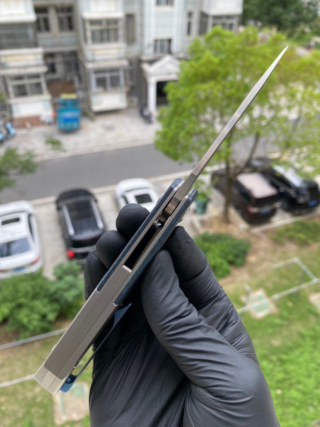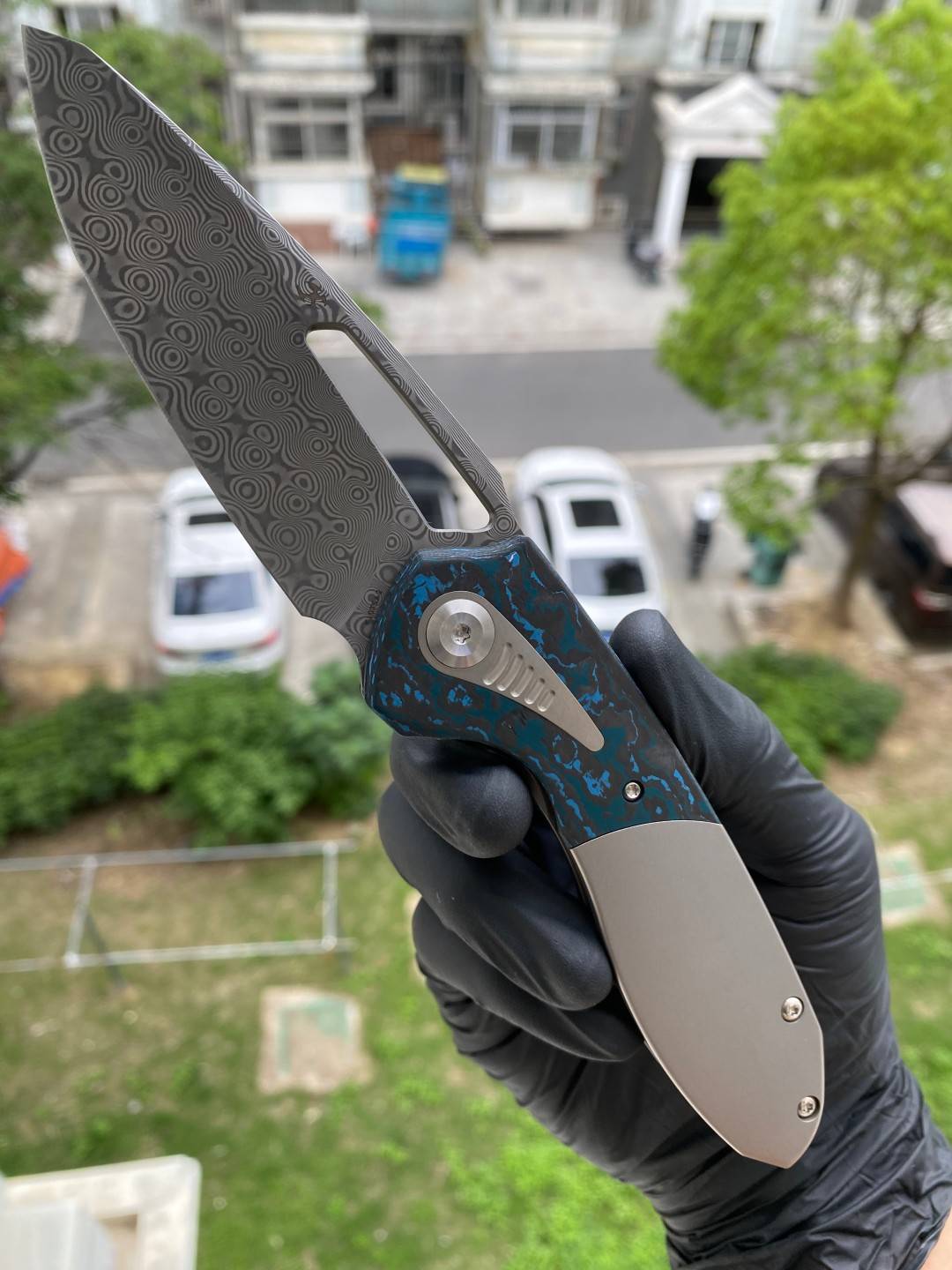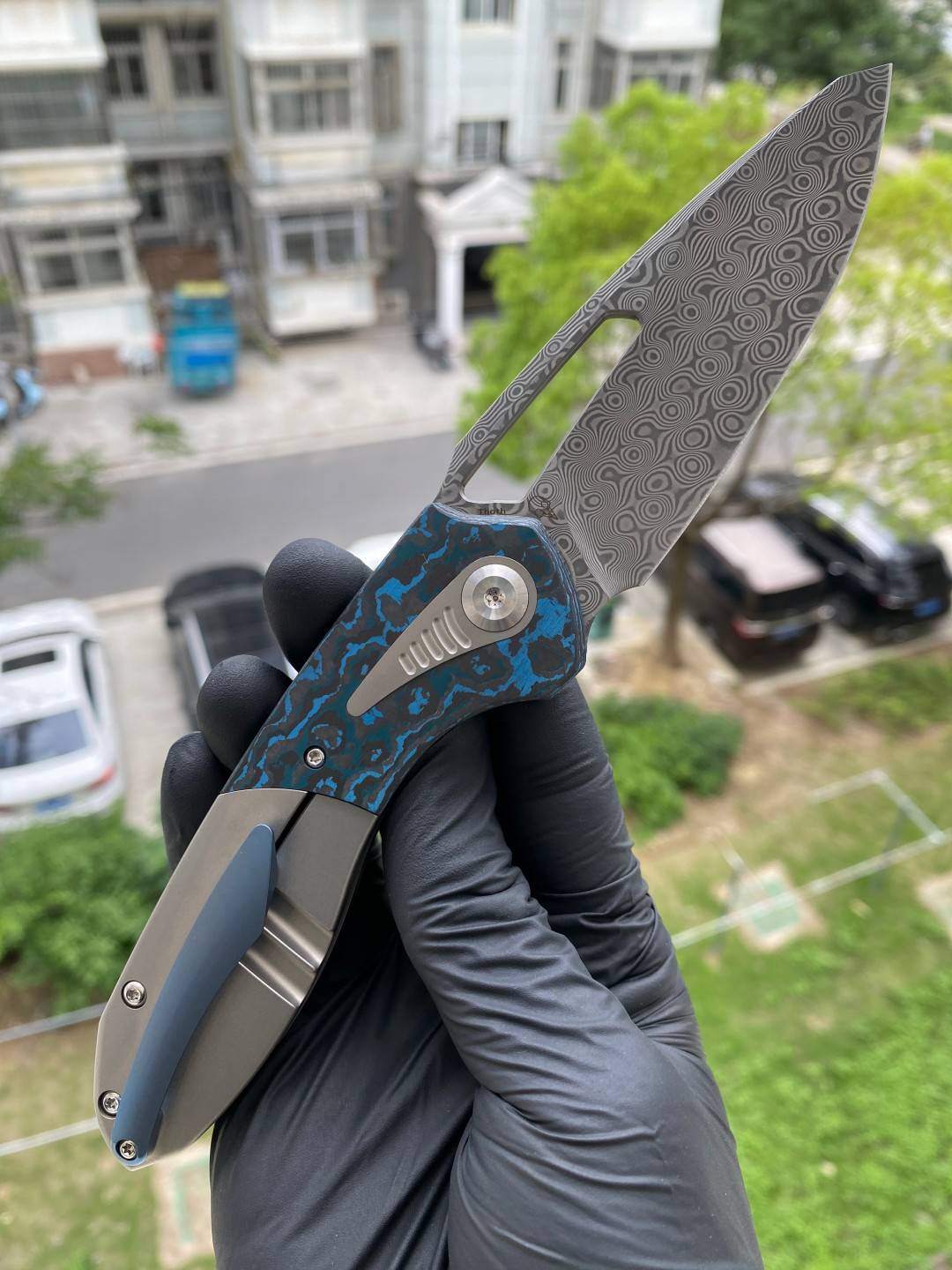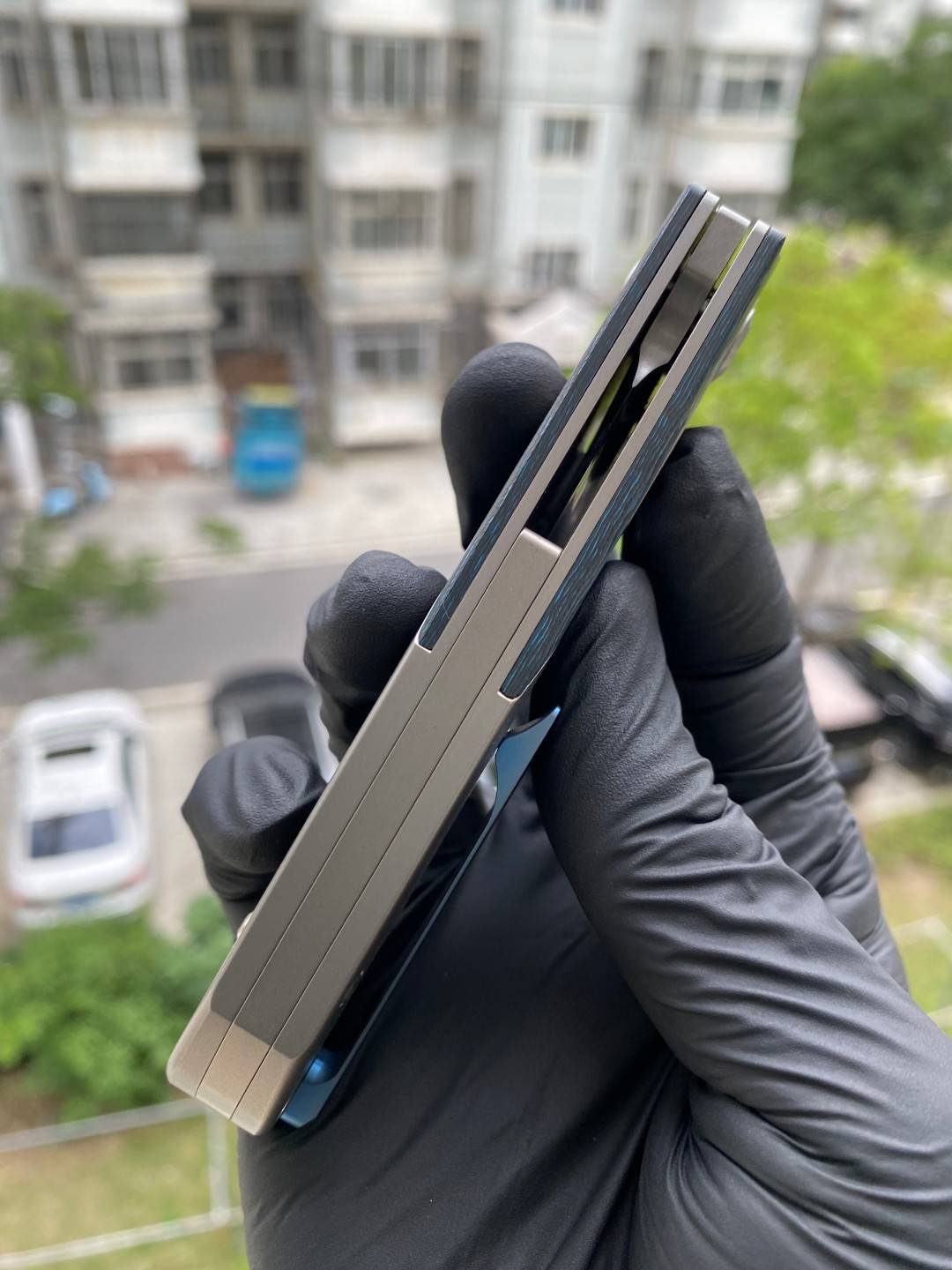 -手柄采用双材料结构,将钛与碳纤维或 Timascus 镶嵌物无缝结合。这种材料组合增强了刀的美感和触觉体验,为其设计增添了一丝优雅和精致。