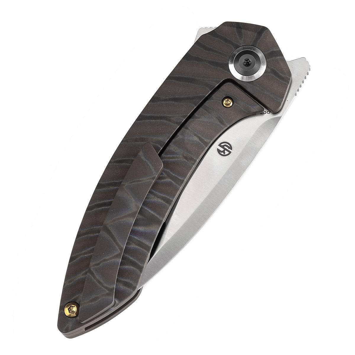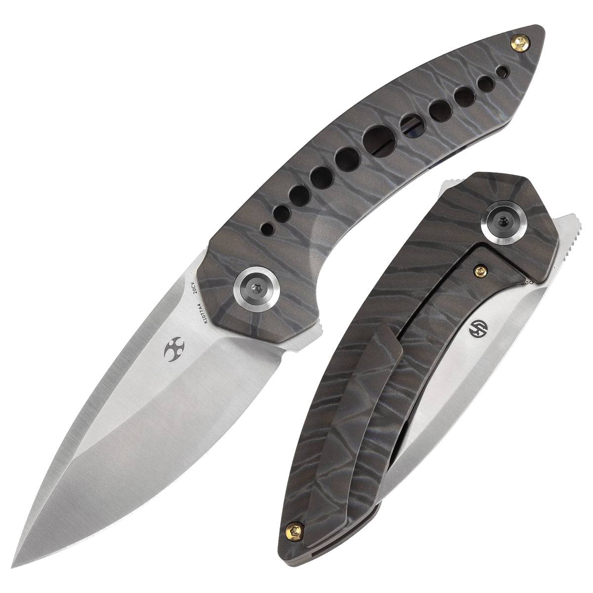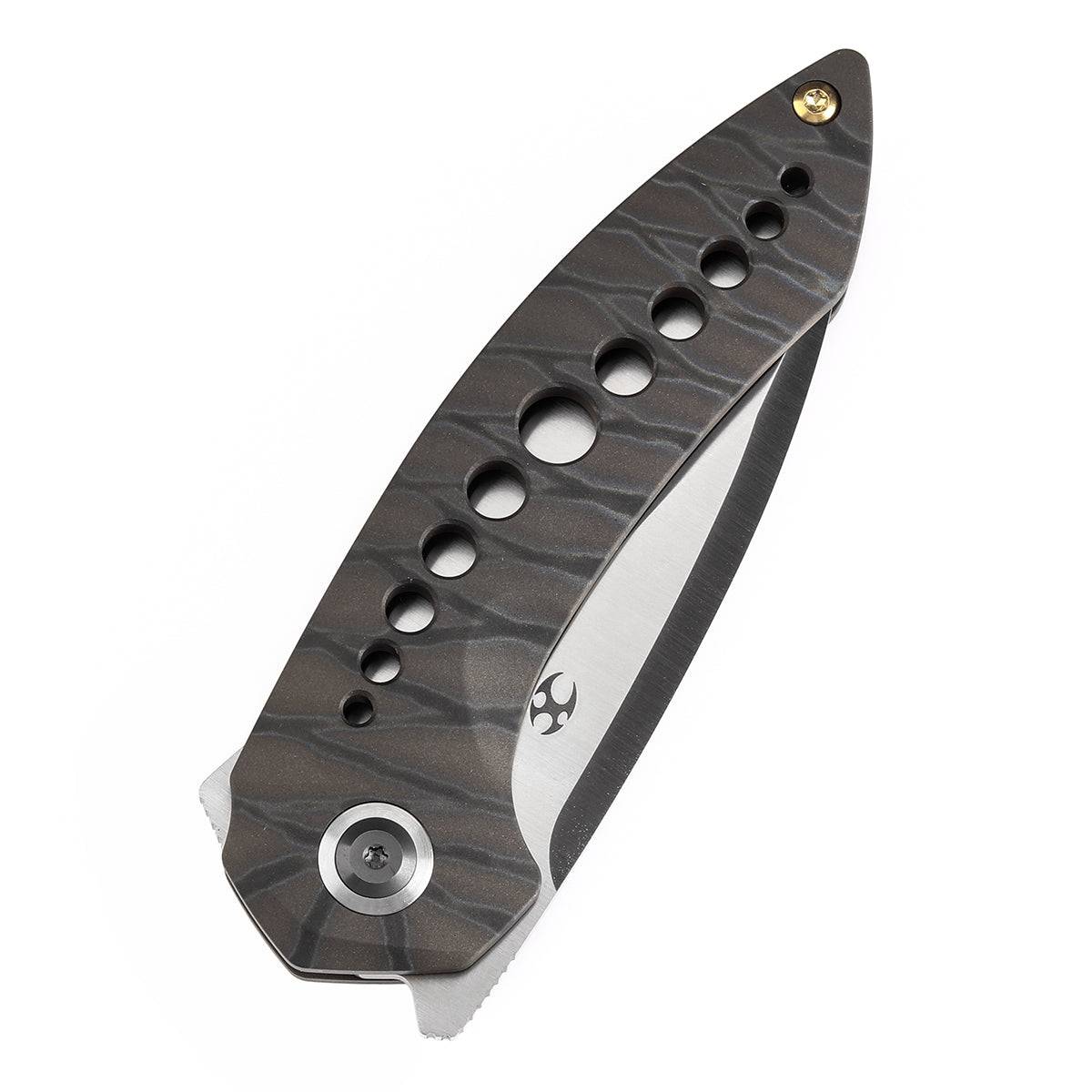 - Odd 21 折叠刀拥有钛制手柄,具有柔和的曲线,完美贴合手掌。两侧都有手柄,抓地力得到增强,更加舒适和安全。孔设计不仅增强了美观性,还提高了牵引力,确保在使用过程中提供可靠的抓地力。这种符合人体工程学的设计将风格和功能相结合,带来令人满意的操控体验。
