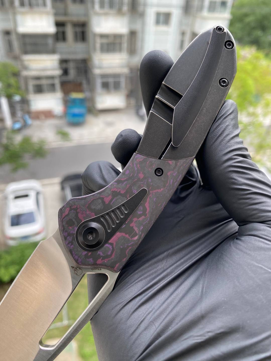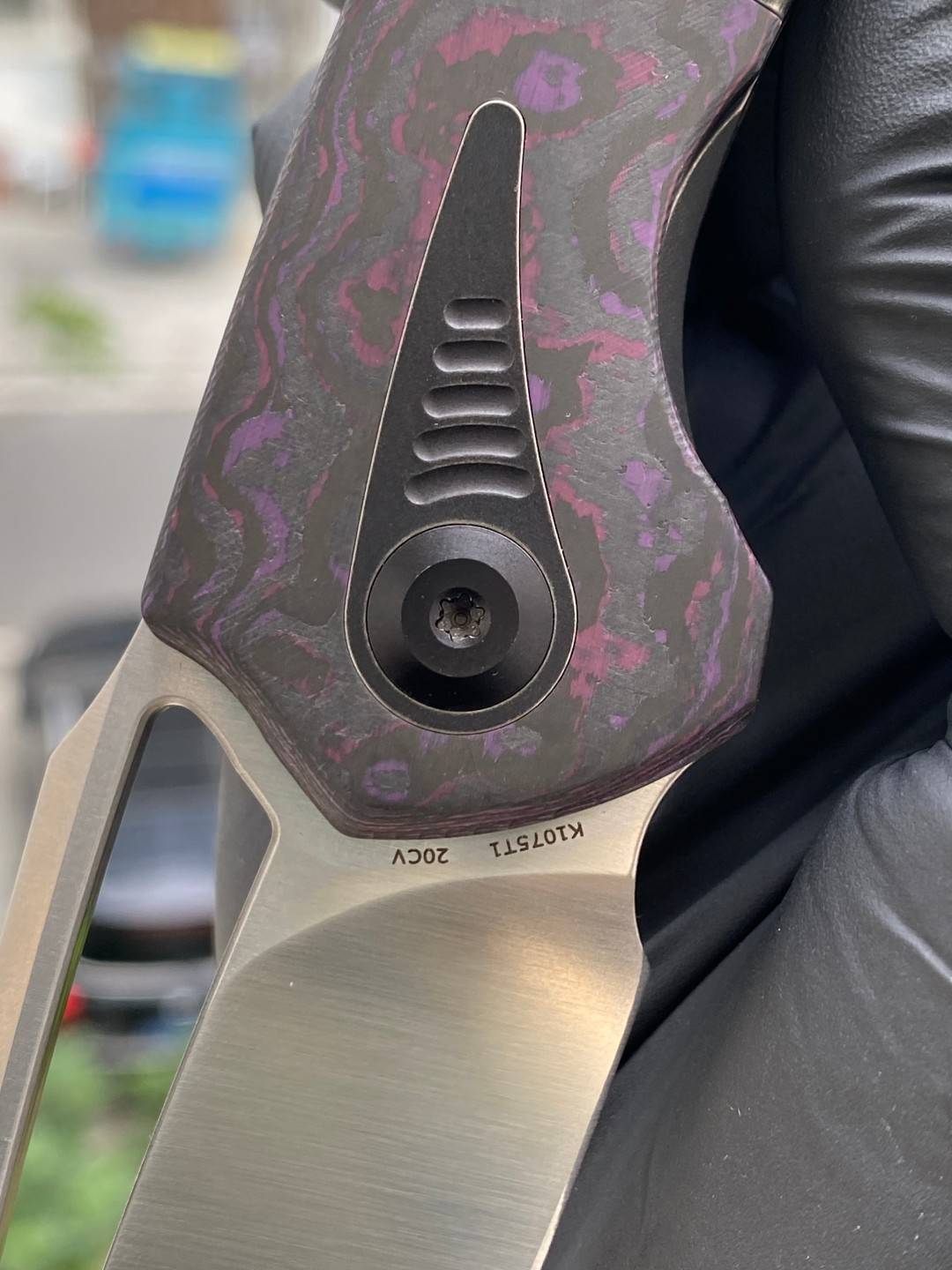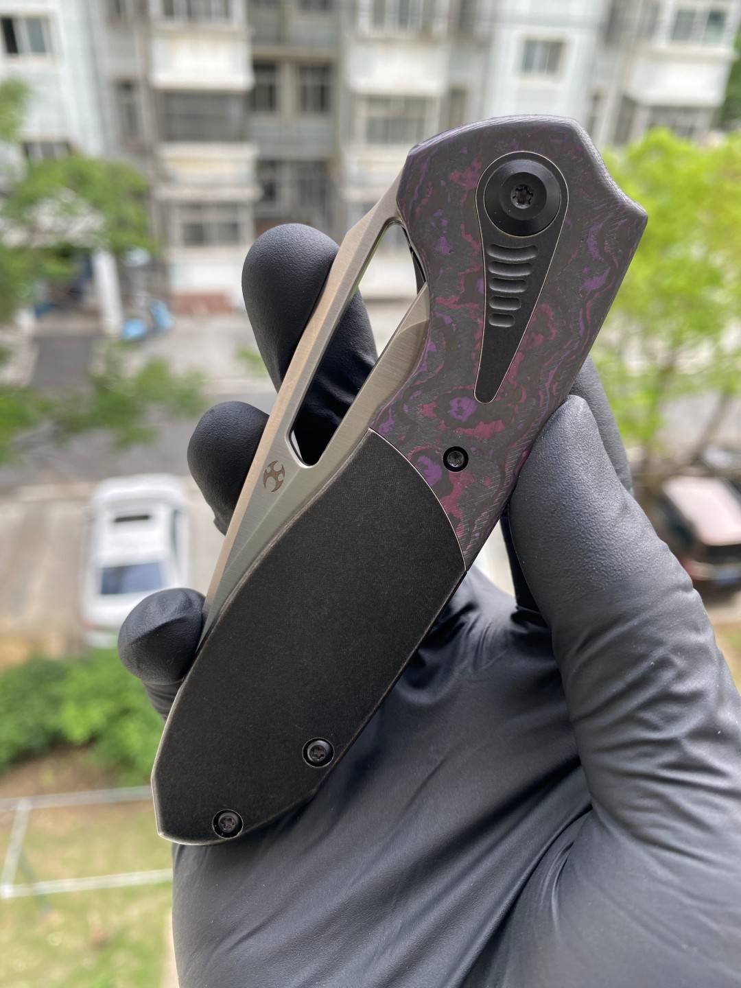 -手柄采用双材料结构,将钛与碳纤维或 Timascus 镶嵌物无缝结合。这种材料组合增强了刀的美感和触觉体验,为其设计增添了一丝优雅和精致。
