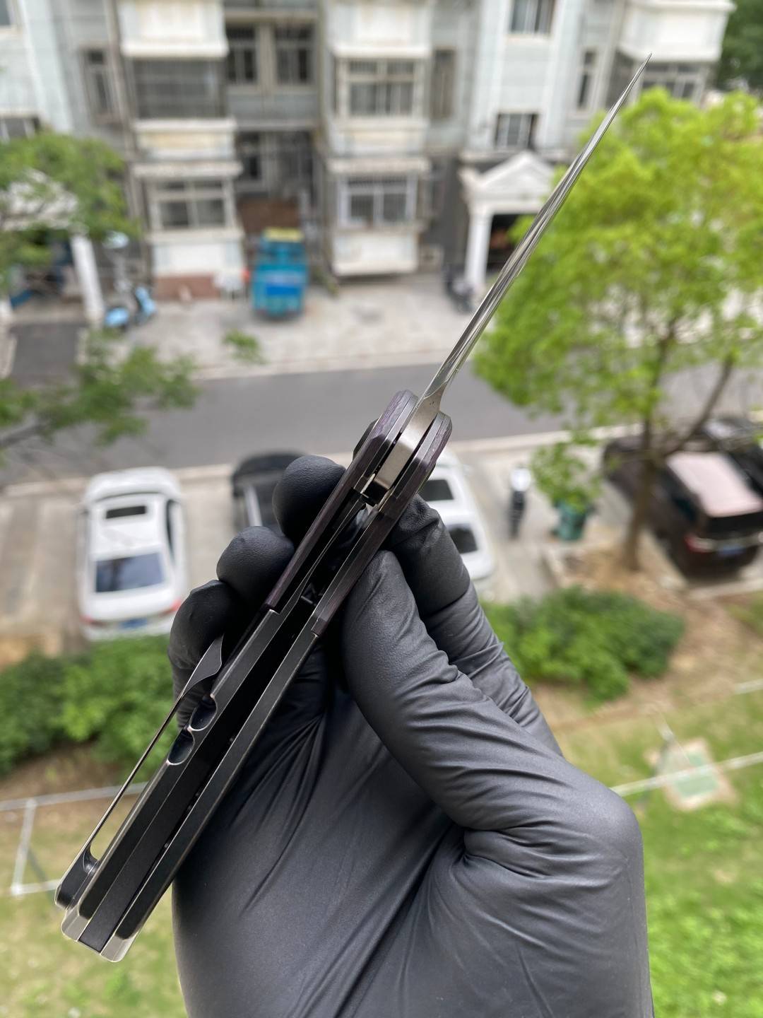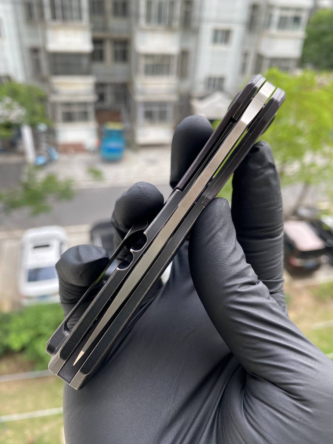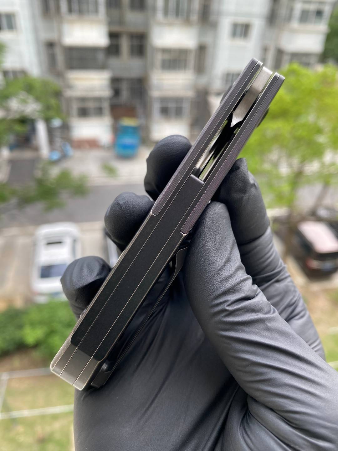 -手柄采用双材料结构,将钛与碳纤维或 Timascus 镶嵌物无缝结合。这种材料组合增强了刀的美感和触觉体验,为其设计增添了一丝优雅和精致。