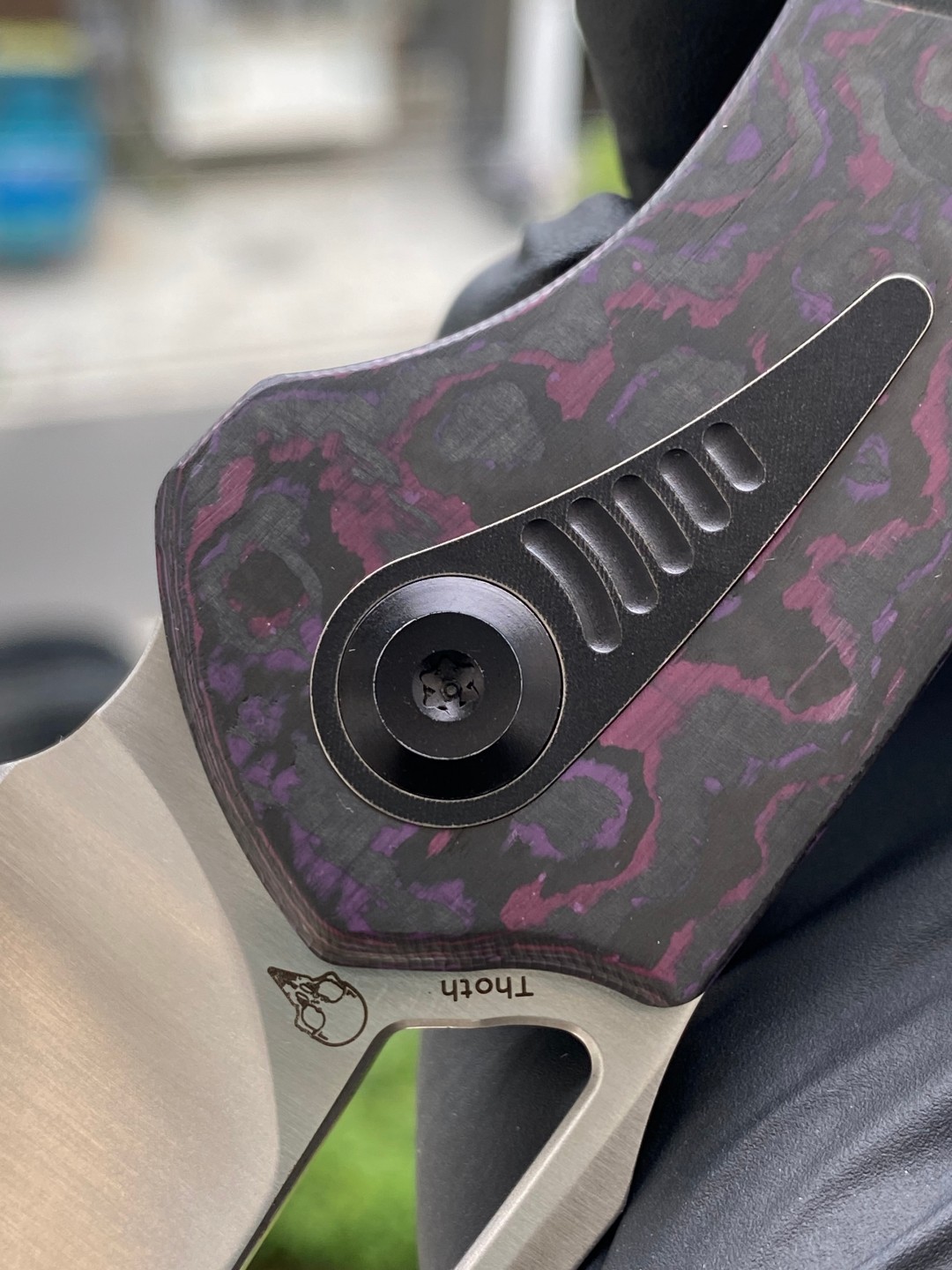 -Thoth 提供符合人体工程学的握把,具有带倒角边缘的弧形手柄和钛背衬,确保顺畅、舒适的握持,没有任何锋利的边缘。手柄的流畅线条自然贴合手掌,提供舒适而牢固的抓握。刀脊上的拇指斜面可实现稳定、可控的握持,提高使用时的精确度。