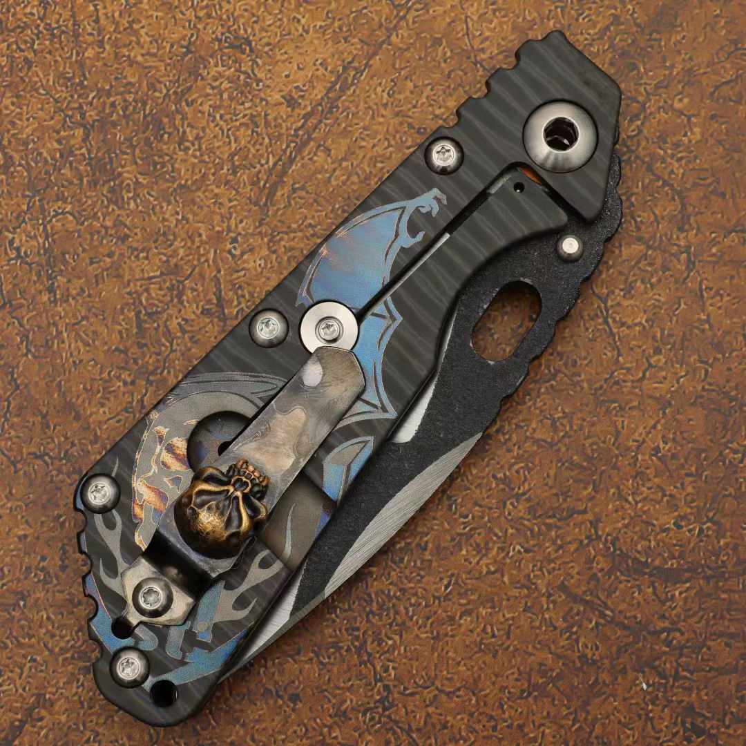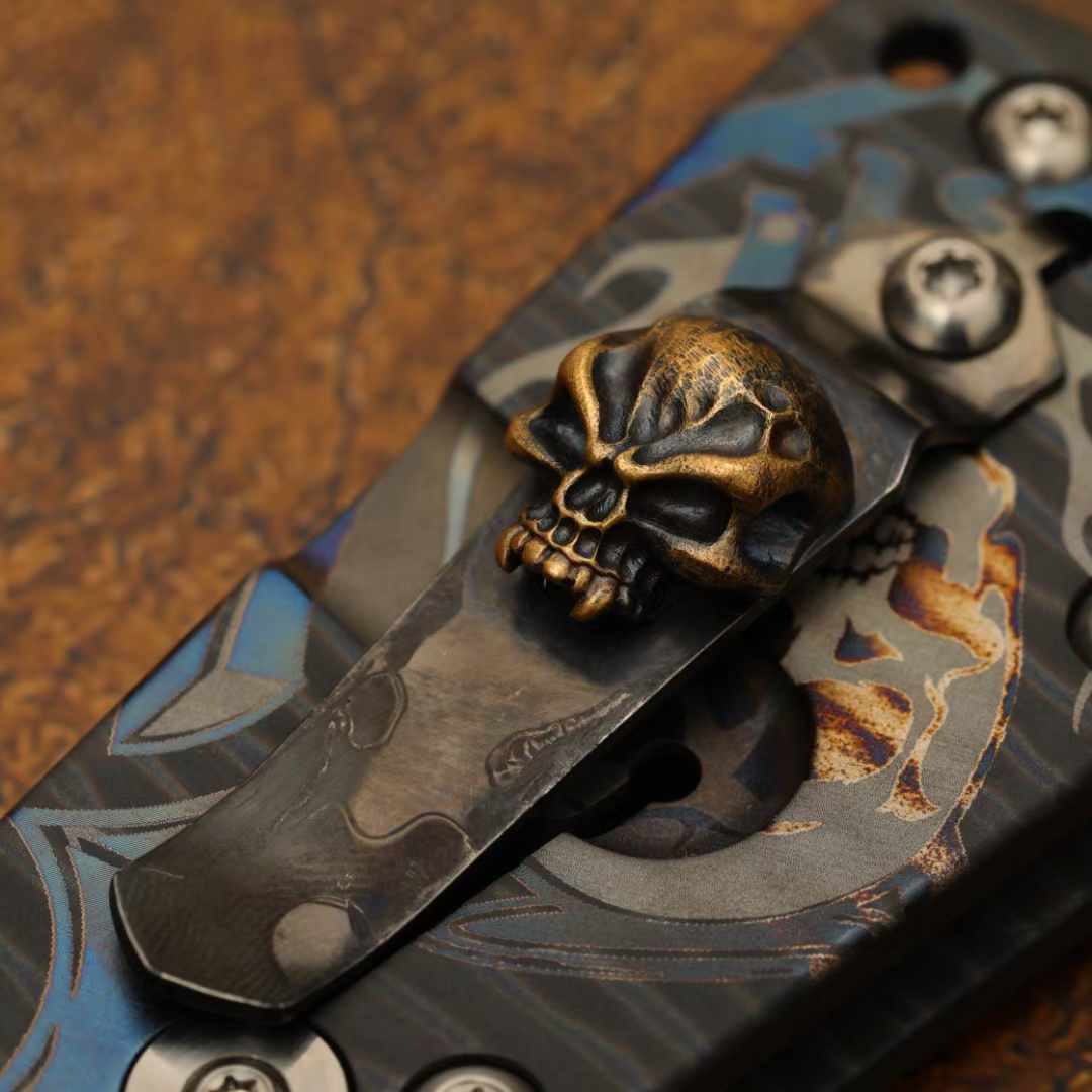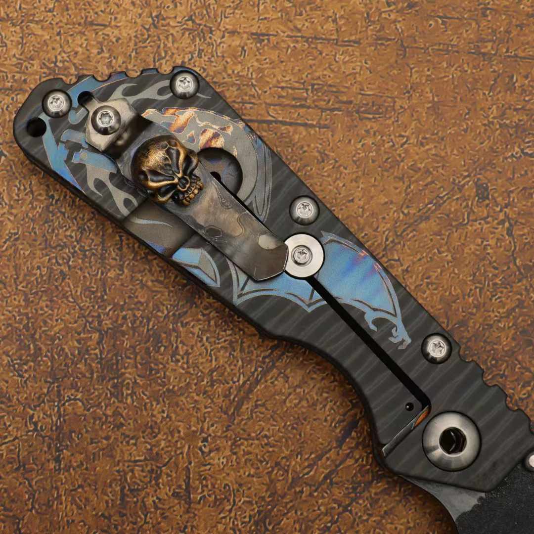 Strider MSC版 SMF配钢火背夹 ,美国挺近者,手柄烧钛雕刻飞天骷髅头,手工分段式夜魔半齿刃