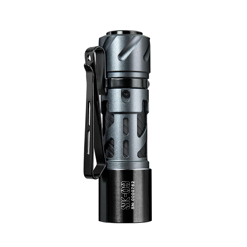 2. **紧凑尺寸与轻量设计**:SK03整体长度为76.5mm,直径21.5mm,带电池重量仅为65克,非常适合随身携带。