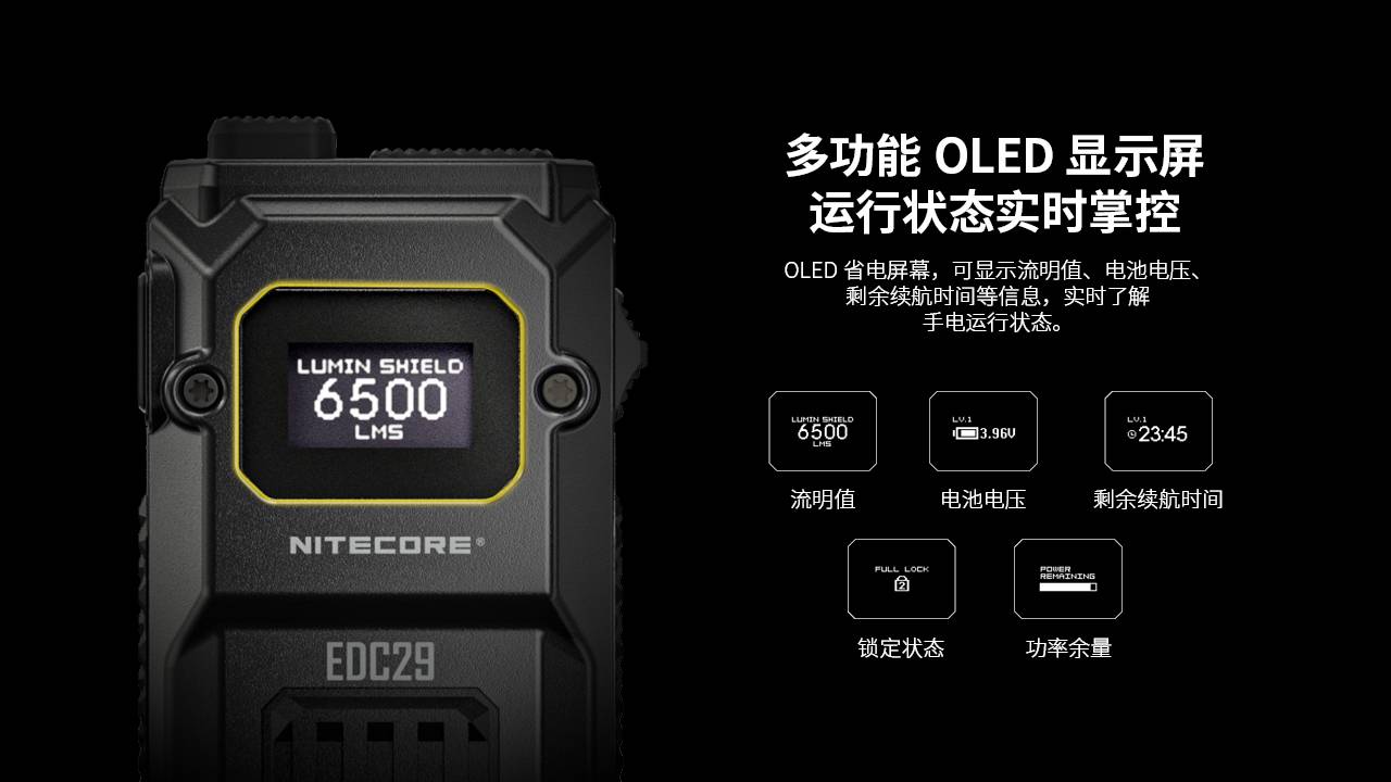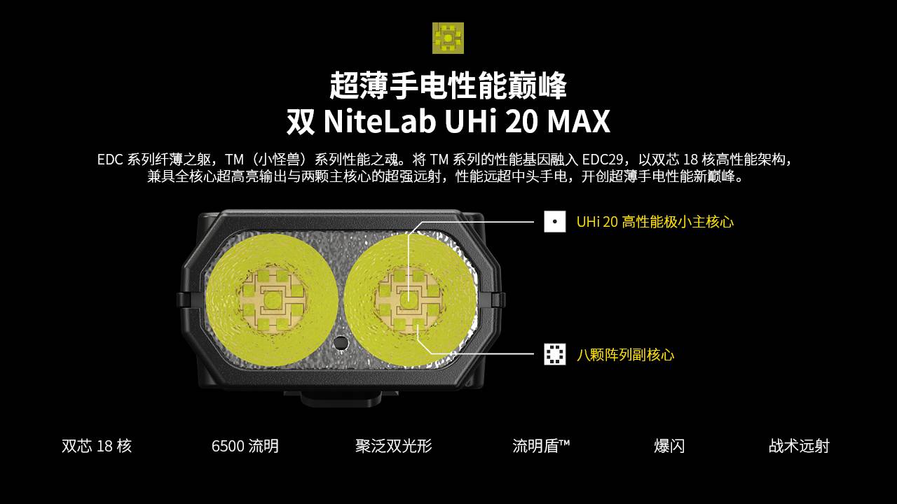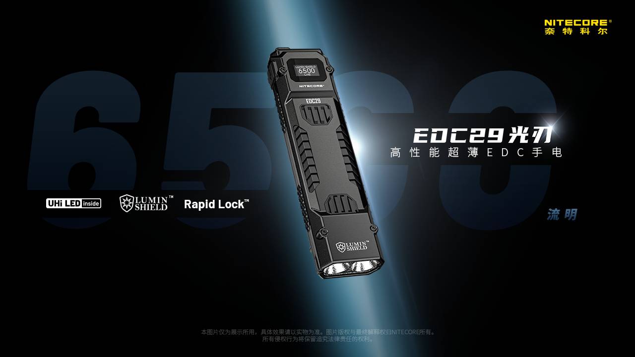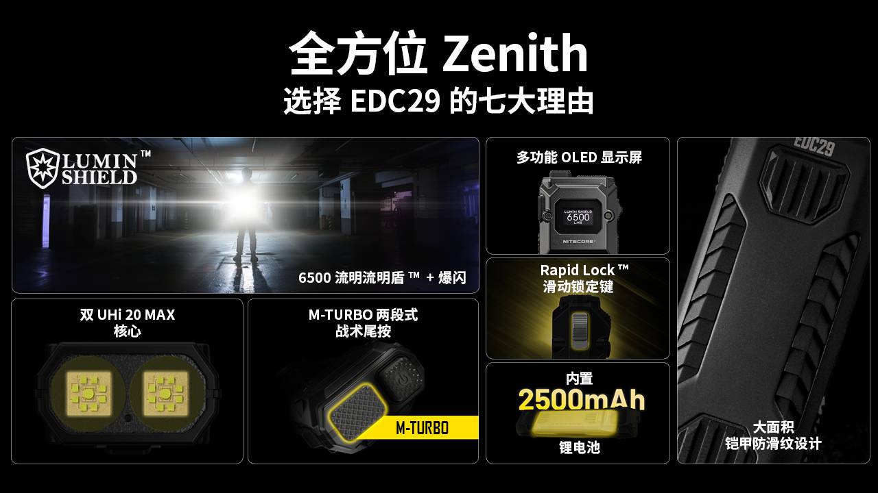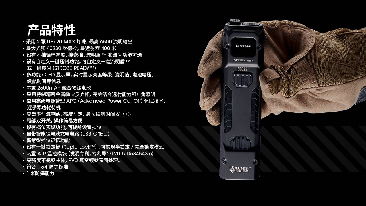 1. **双UHi 20 MAX LED**:EDC29搭载了两颗NiteLab UHi 20 MAX LED,具有双芯18核、聚泛双光形切换、6500流明超高亮等特性。
